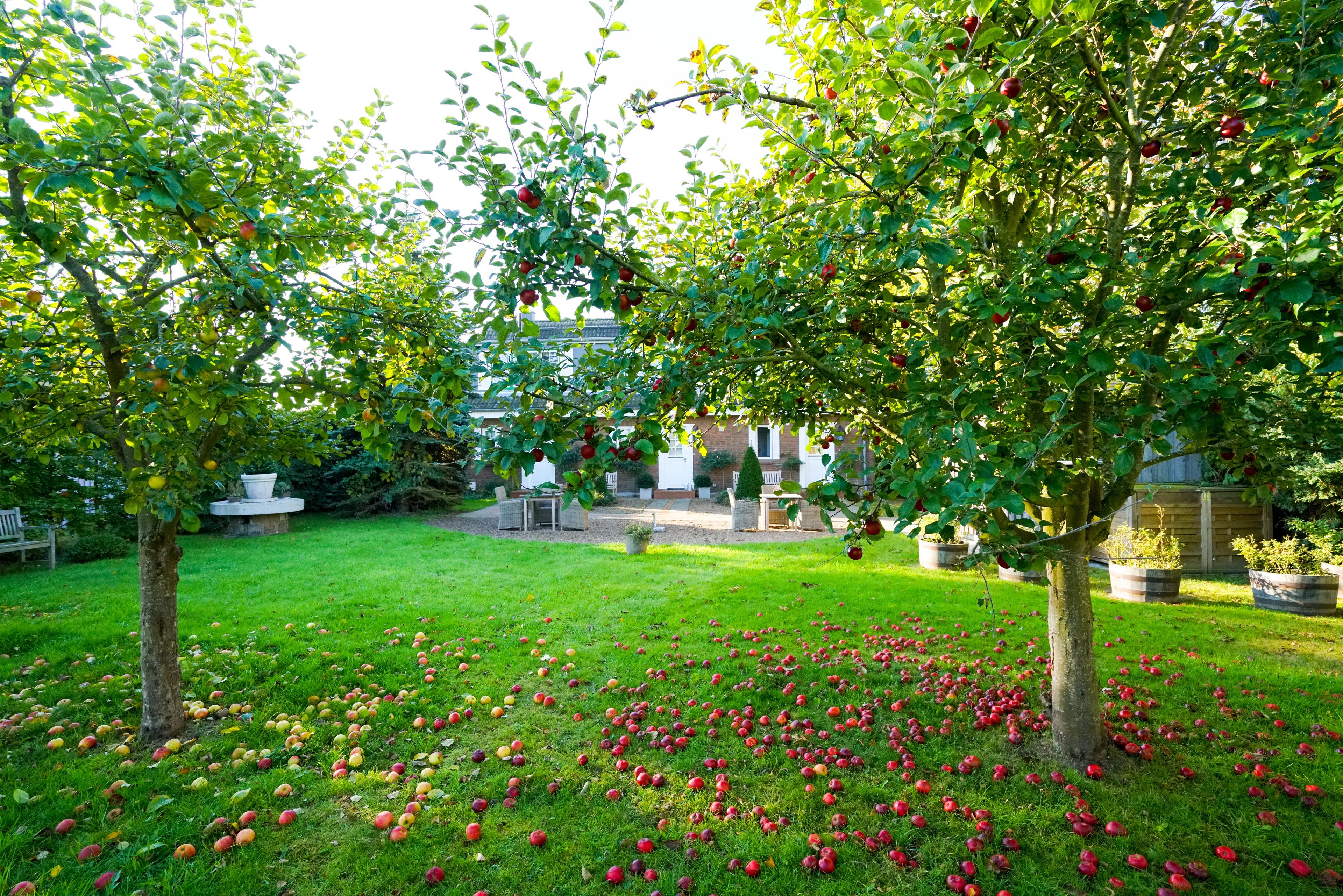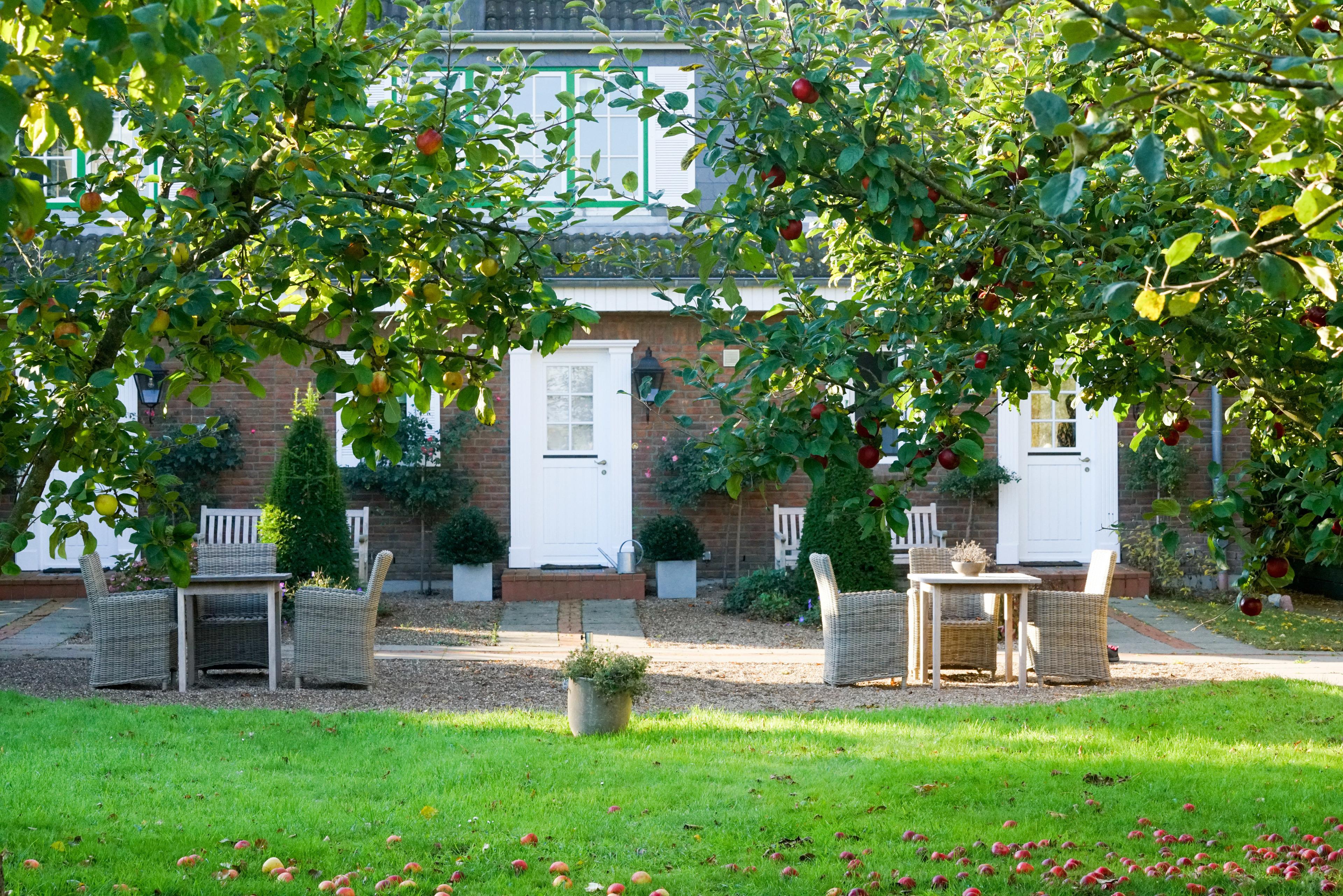Kiesterrasse und großer Obstgarten, private Holzterasse