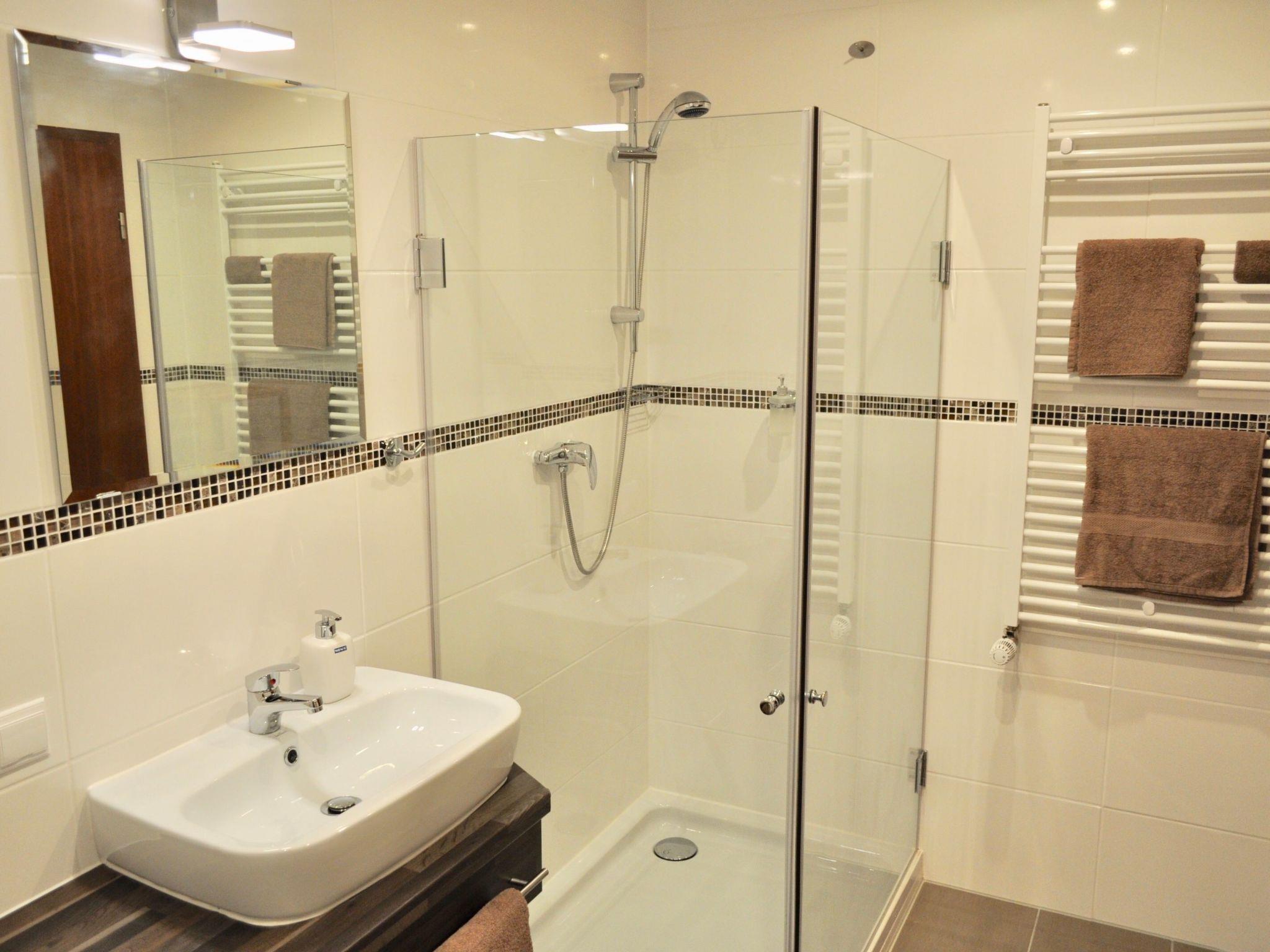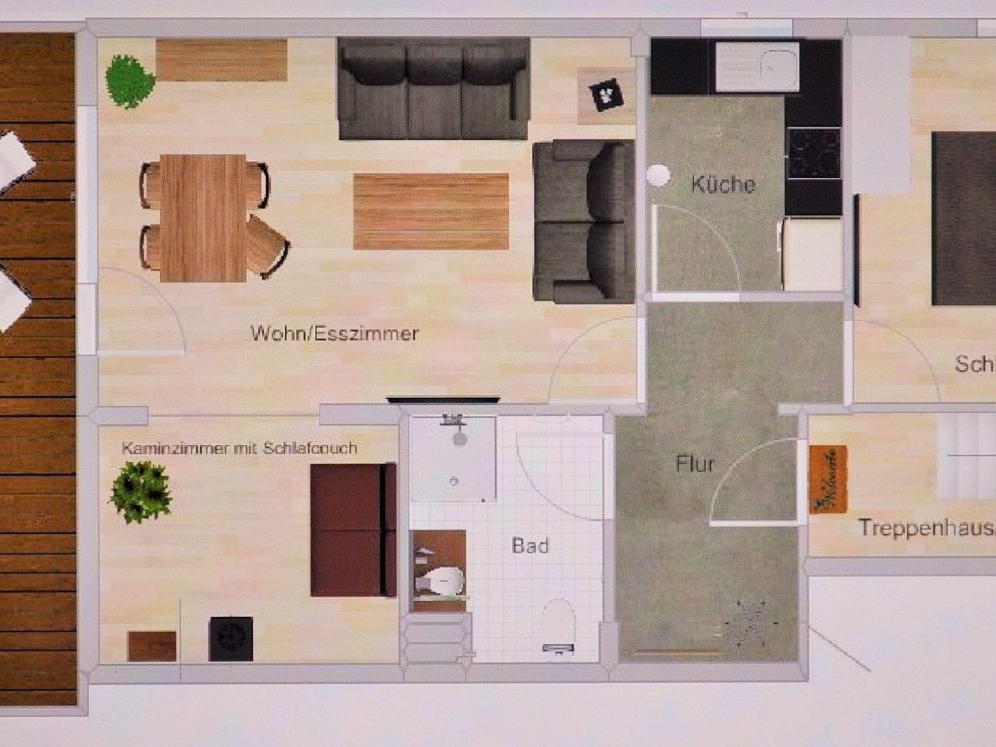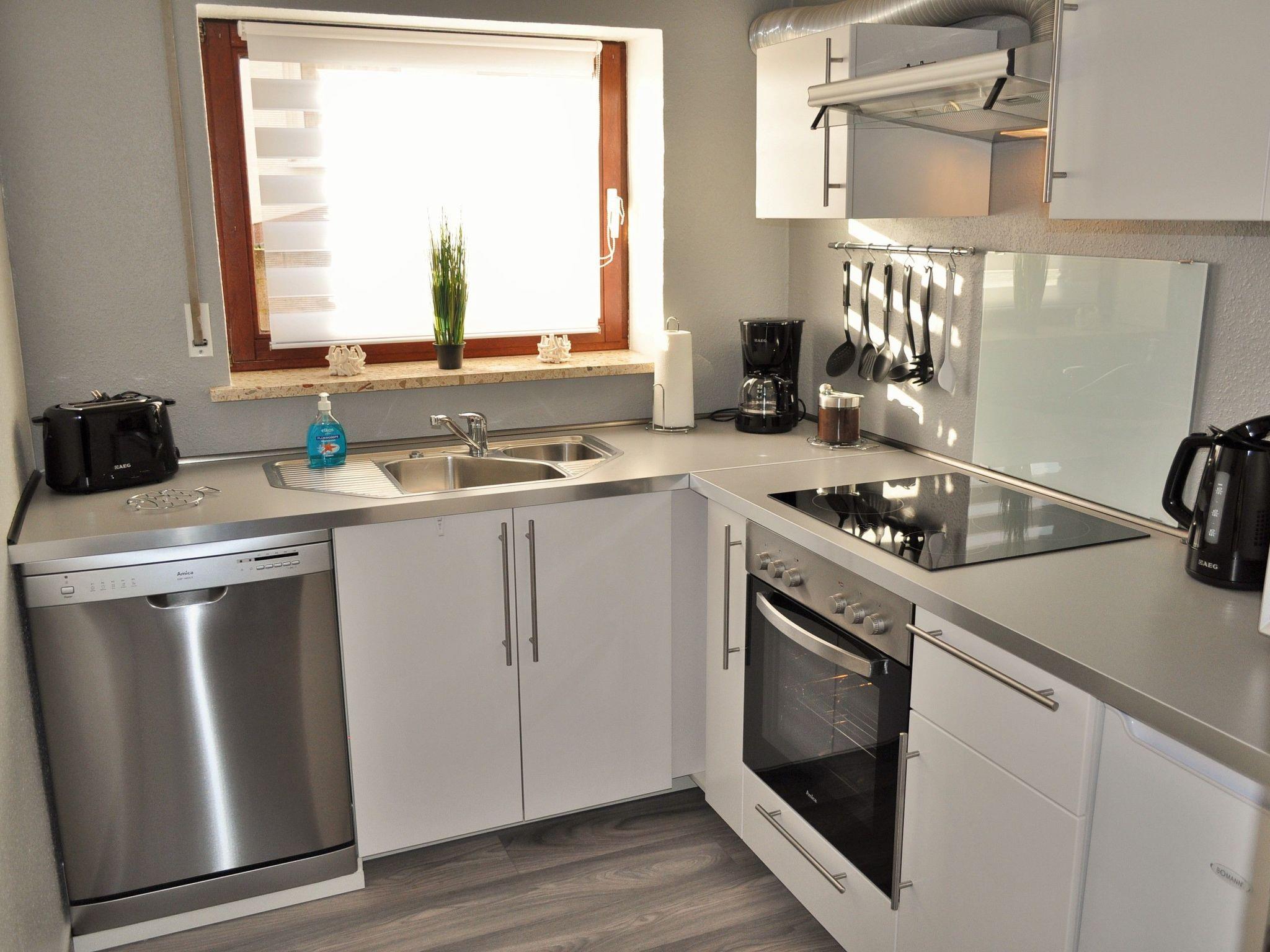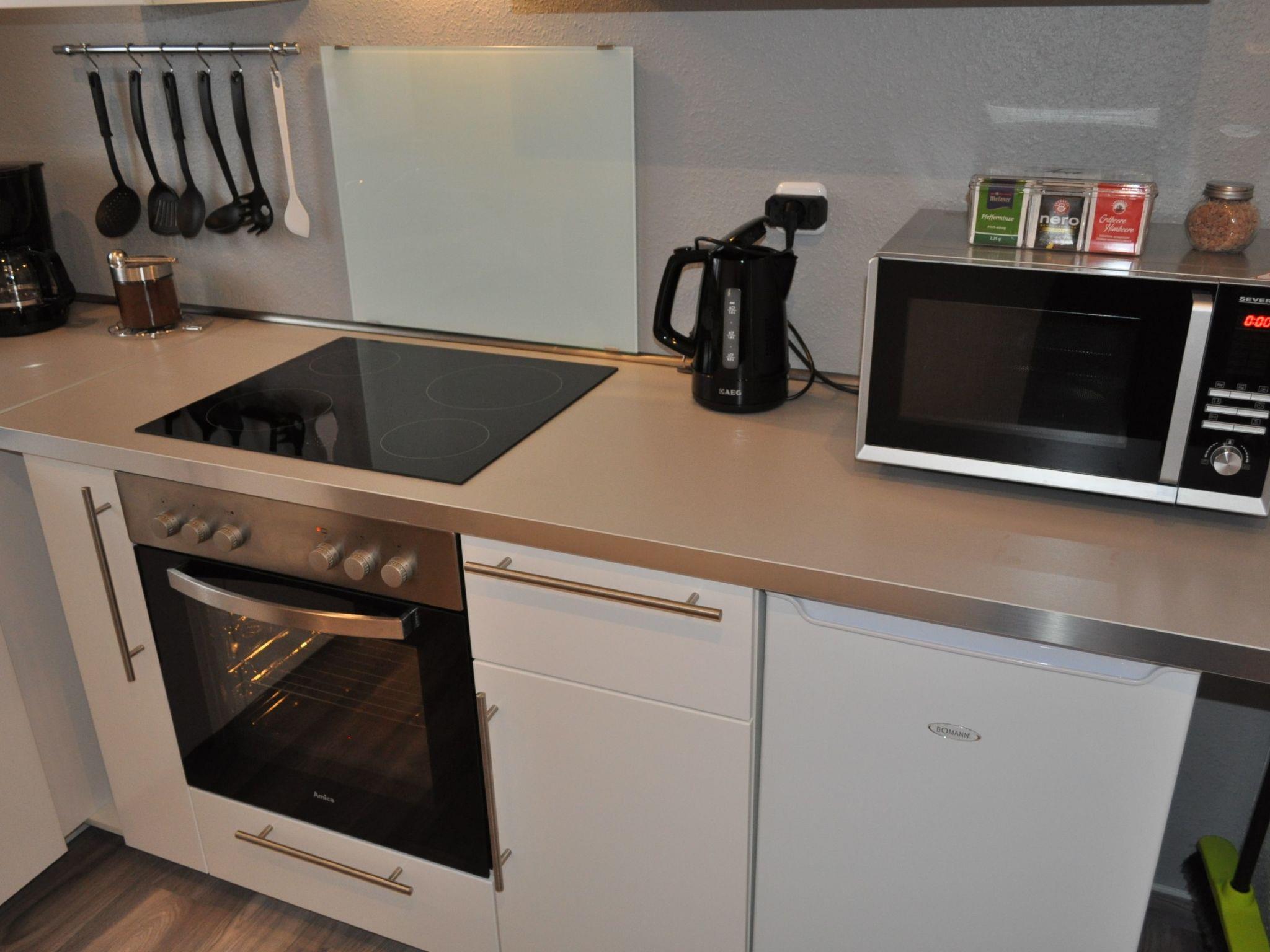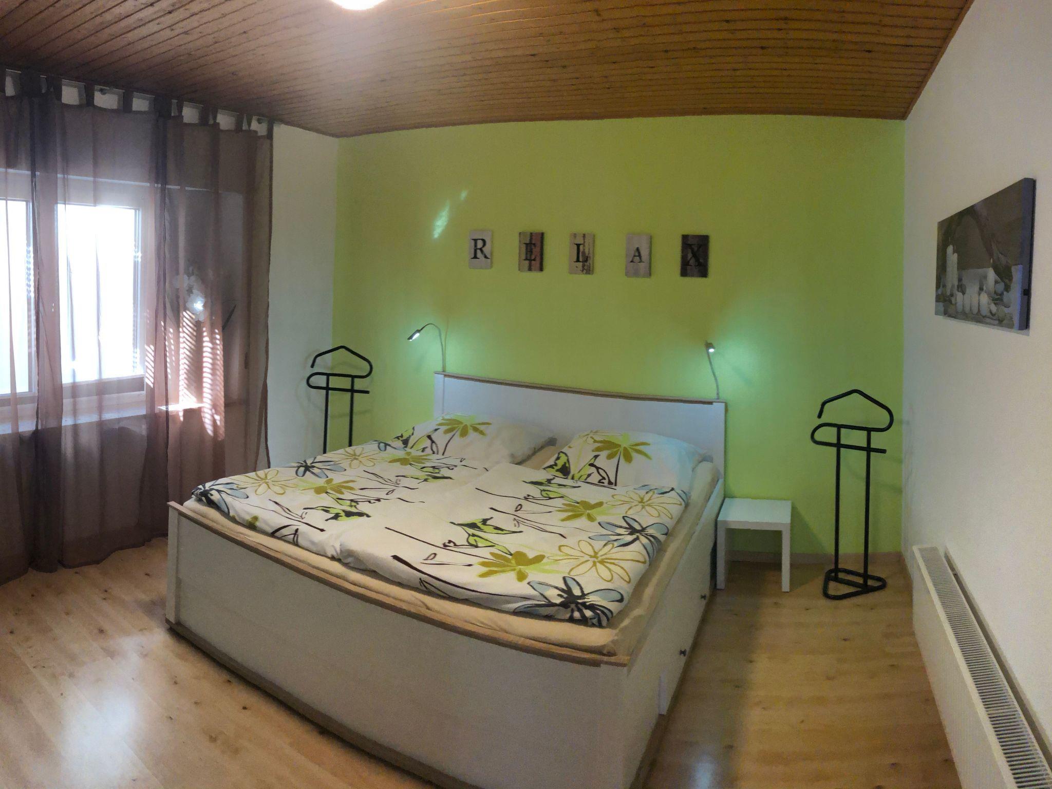 Our renovated and stylishly furnished holiday flat for 2-4 people is located on a perfect south-facing slope with a sun terrace for relaxing summer hours. Our holiday flat with upscale furnishings has 1 living/dining room, 1 bedroom, bathroom, fully equipped kitchen, fireplace room with high-quality sofa bed (1.4x2m with slatted frame and comfortable mattress), hallway and 25m2 large wooden terrace with awning. The living room and bedroom each have a flat screen TV.