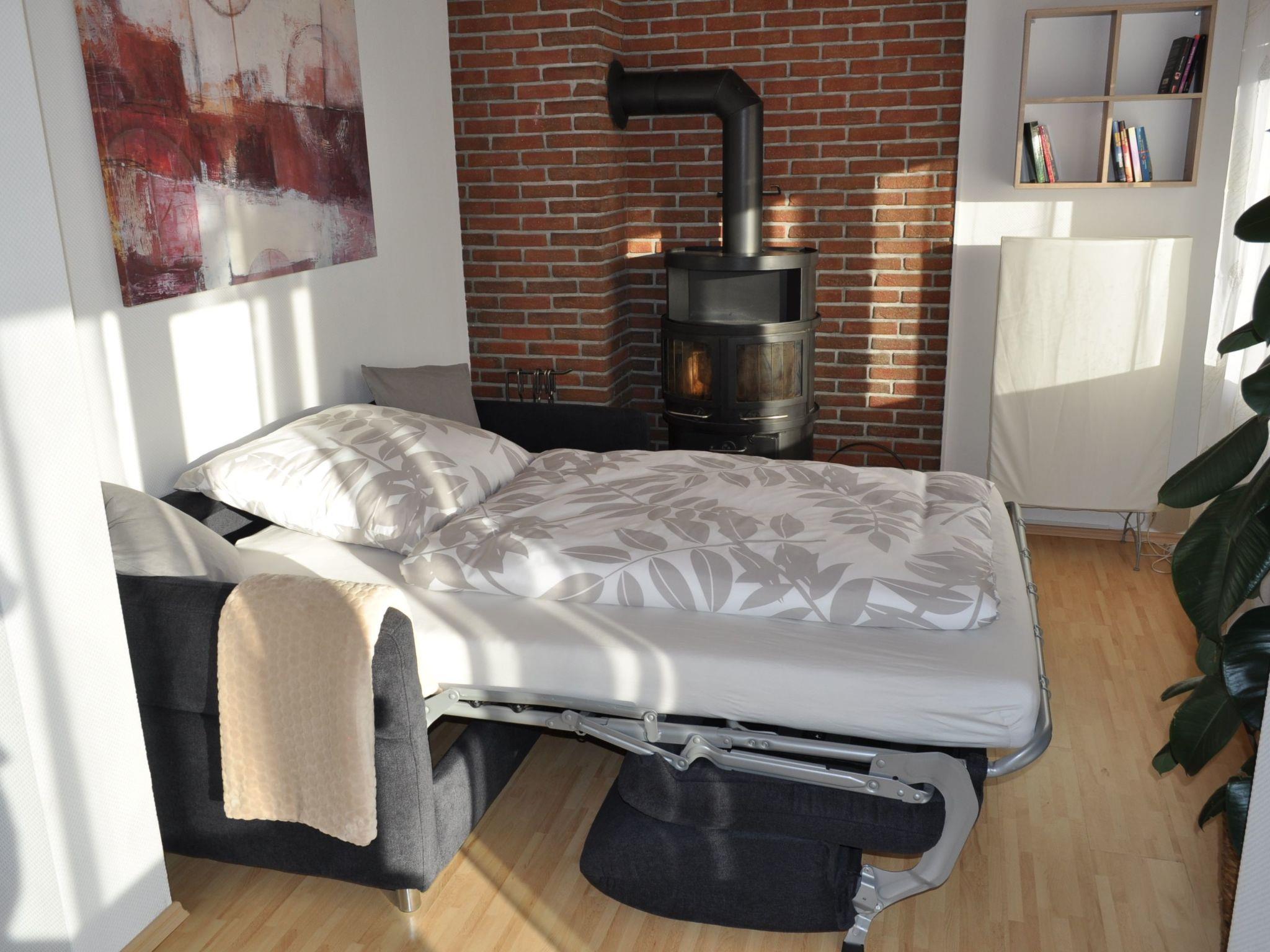 Underfloor heating plus towel radiator in the bathroom and additional radiator in the living room and bedroom, smoke detector, triple insulating glazing, blackout blinds, wood-burning stove, electric awning, garden furniture, swing barbecue, Internet TV with 150 HD channels incl. streaming services.