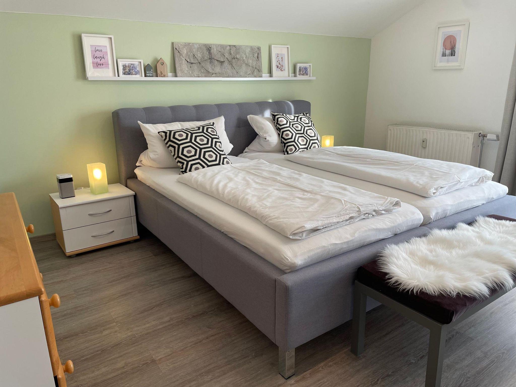 Das große Schlafzimmer (20m²) ist mit einem Doppelbett (180*200), Nachtkästchen, Schrank und Kommode ausgestattet.