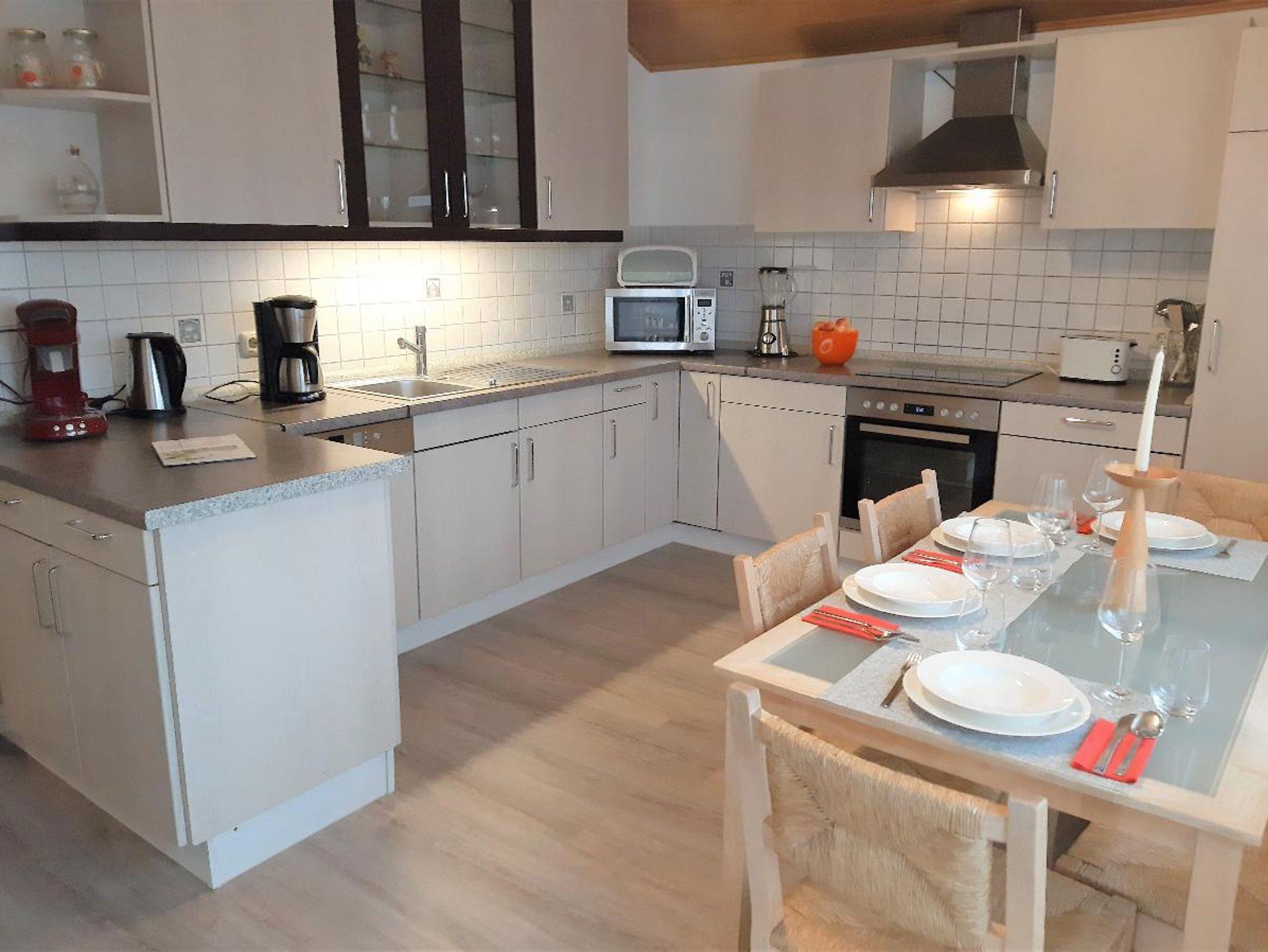 Die große Küche (15 m²)mit integriertem Essbereich. Mit einem Herd, Backofen, Kühlschrank, Mikrowelle, Dunstabzug sowie Spülmaschine ist die Küche umfangreich ausgestattet.