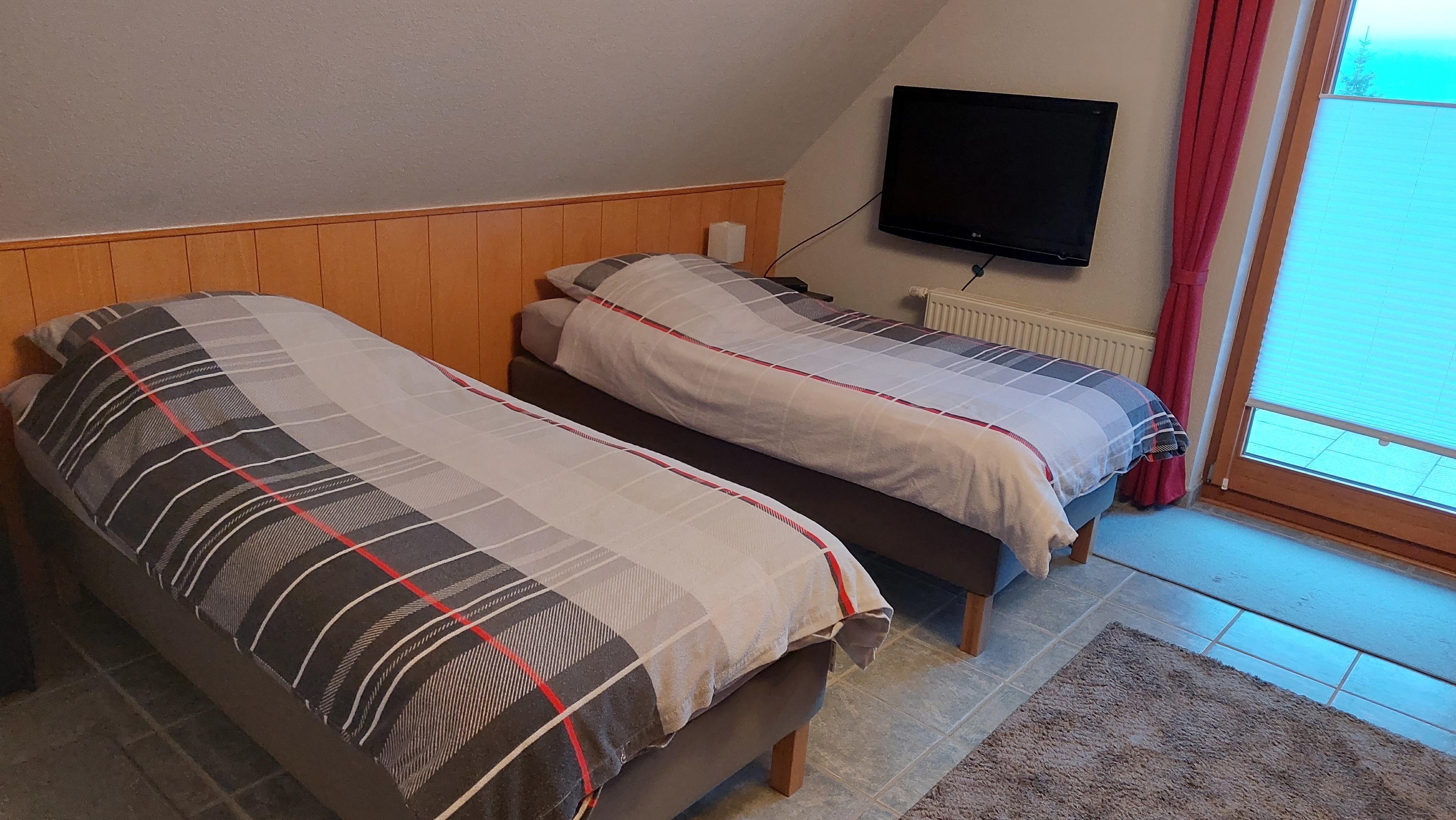 Die Wohnung besteht aus einem Wohn/Schlafzimmer mit 2 Einzelbetten, einer Ausziehcouch mit 2 Schlafplätzen (80x200cm) sowie einem separatem Schlafzimmer mit Doppelbett (180x200 cm), auch getrennt stellbar.