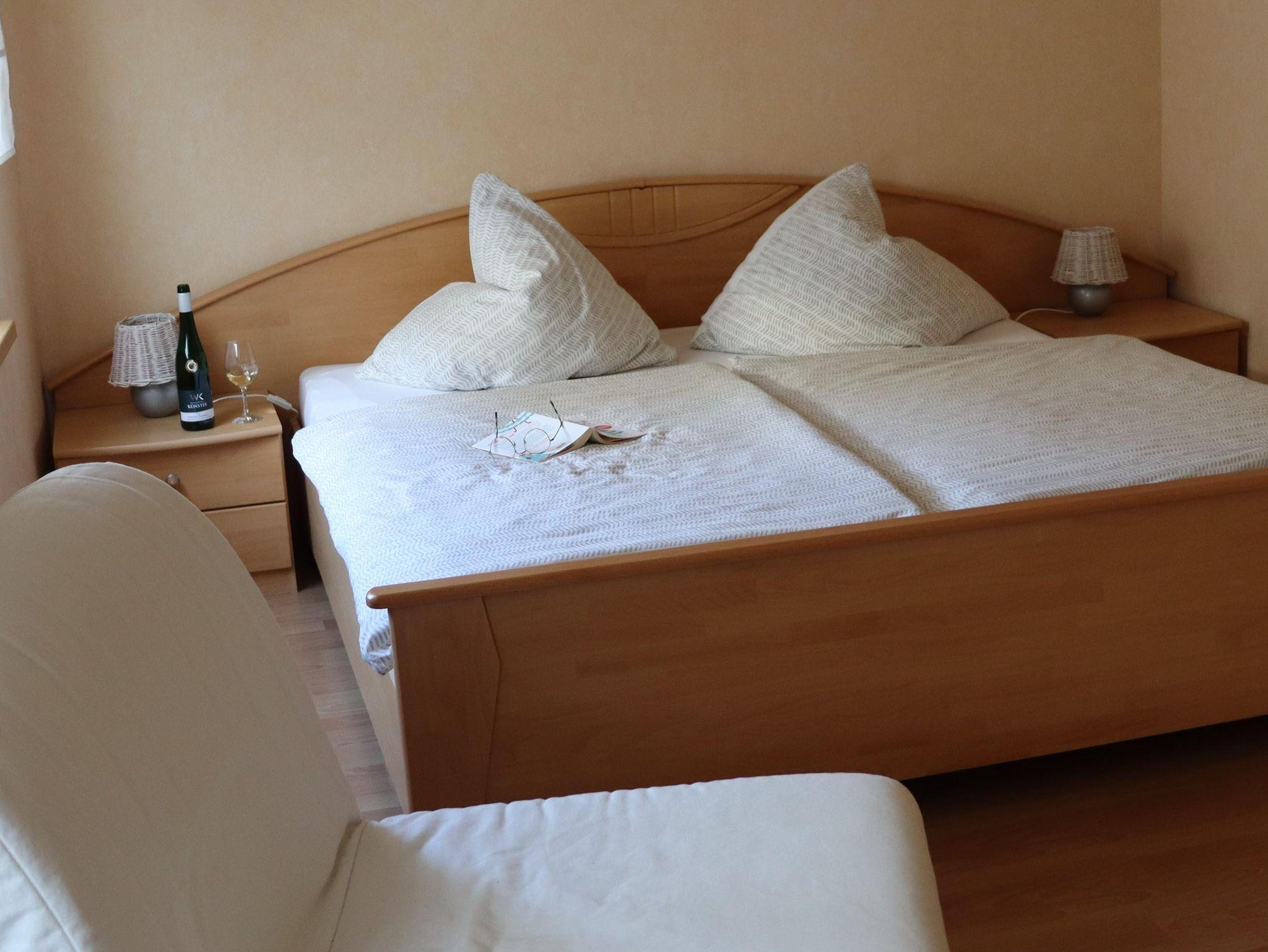 Wir bieten Ihnen im Haus Zimmer sowie ein Ferienhaus an. Die Zimmer im Haus haben eine sehr schöne Aussicht auf die Mosel und Weinberge, außerdem auf die 4 Burgen der Nachbargemeinde Kobern – Gondorf: das Schloss von der Leyen (Wasserschloss), das Schloss Liebieg, die Niederburg und die Oberburg mit Matthiaskapelle.
