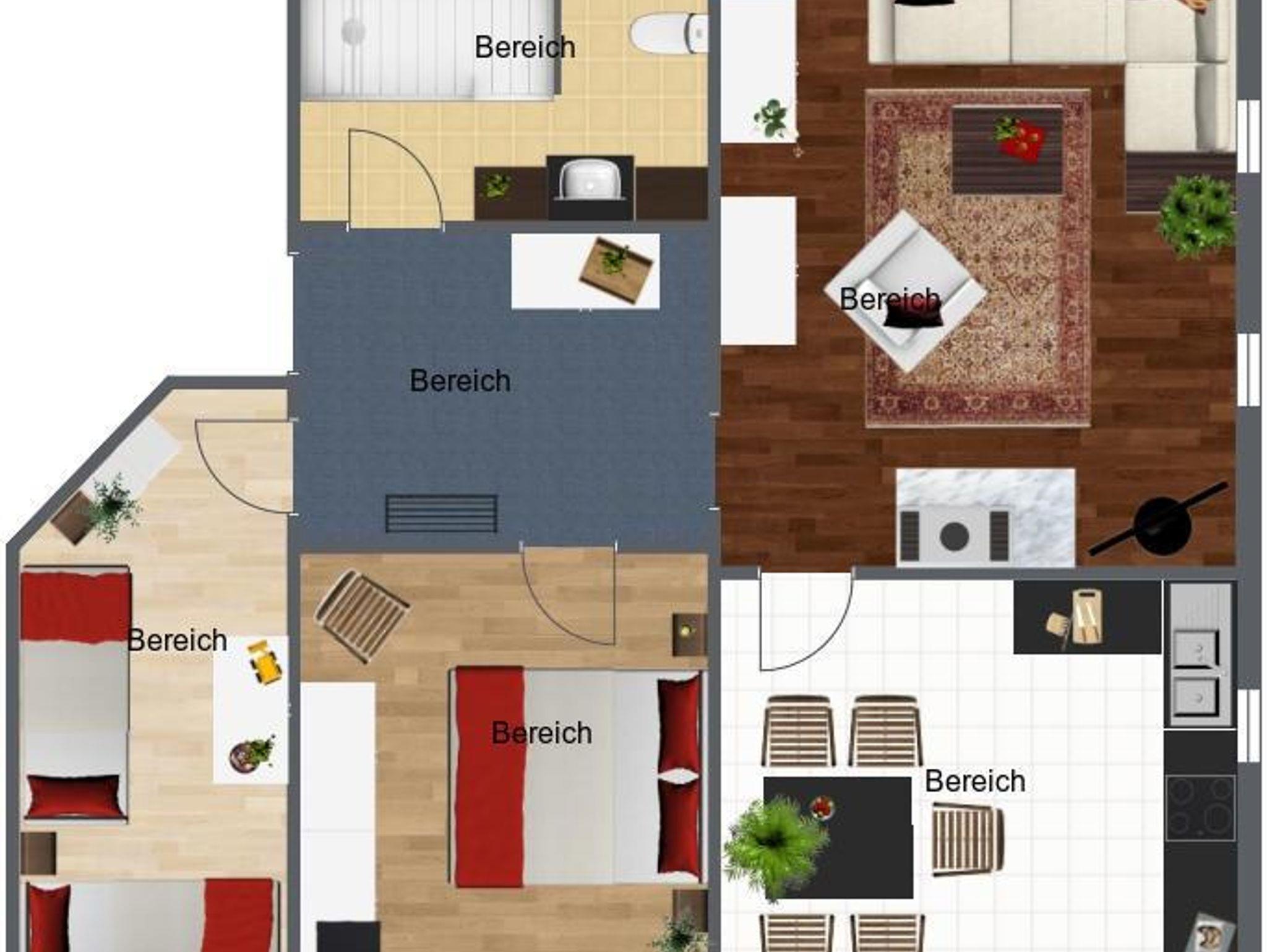 Ihre Wohnung hat zwei Schlafzimmer. Einmal mit Doppelbett (1,80*2,00 m) und einmal mit getrennten Betten (0,80*1,90m) Außerdem gibt es einen Wohnraum mit Kamin, 2 Sofas und Sessel sowie einen Raum für die komplette Einbauküche mit Essplatz, ein Duschbad und einen Flur. Insgesamt beziehen Sie rund 75 m². Selbstverständlich ist auch ein kleiner Tresor für Ihre Wertsachen vorhanden. Zur Wohnung gehört ein Pkw-Stellplatz.