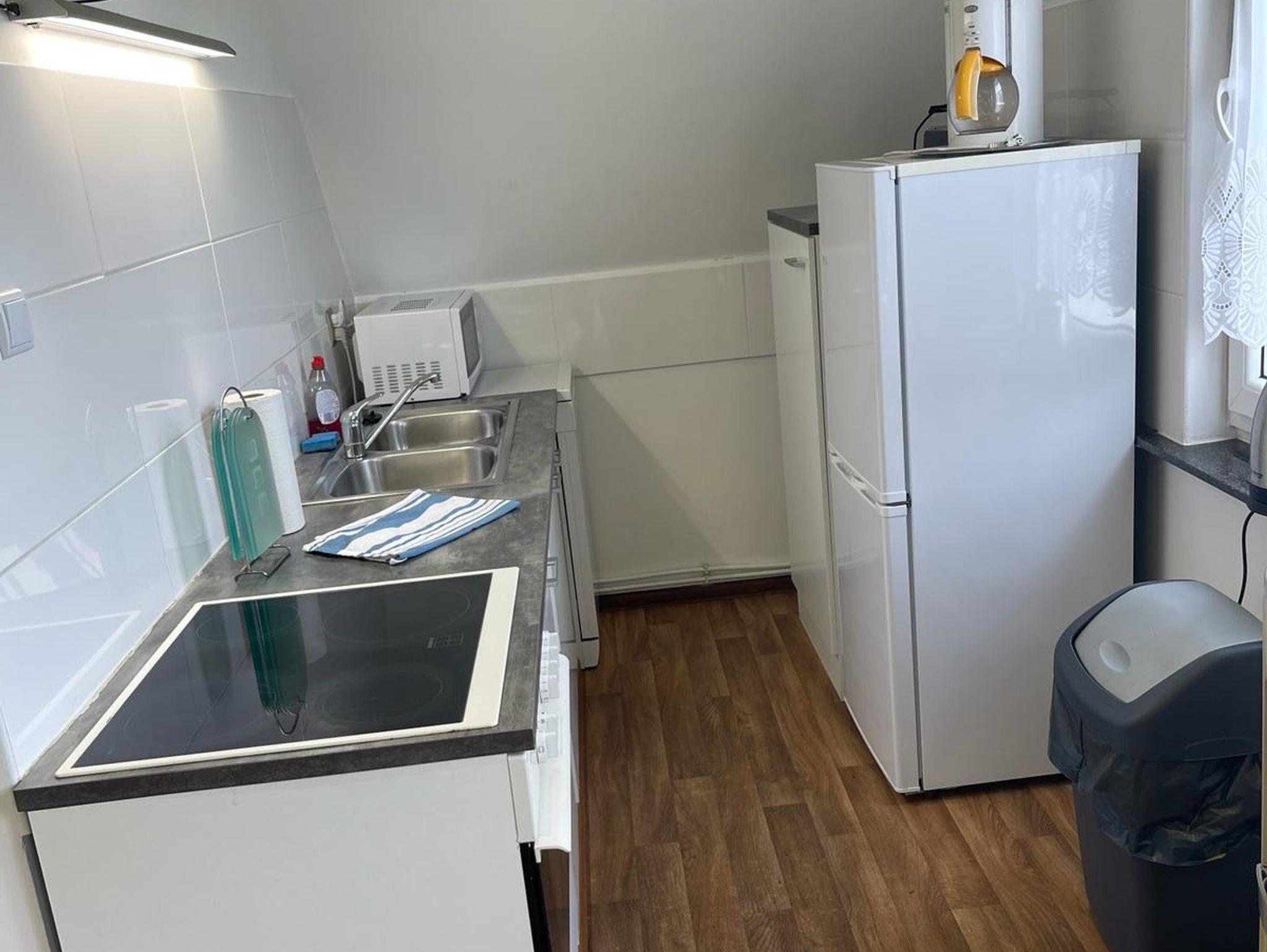 Die gemeinschaftliche Küche ist mit einem Kühlschrank, Geschirrspüler und Backofen sowie einer Mikrowelle ausgestattet, das gemeinschaftlich nutzbare Wohnzimmer mit einen TV Gerät.