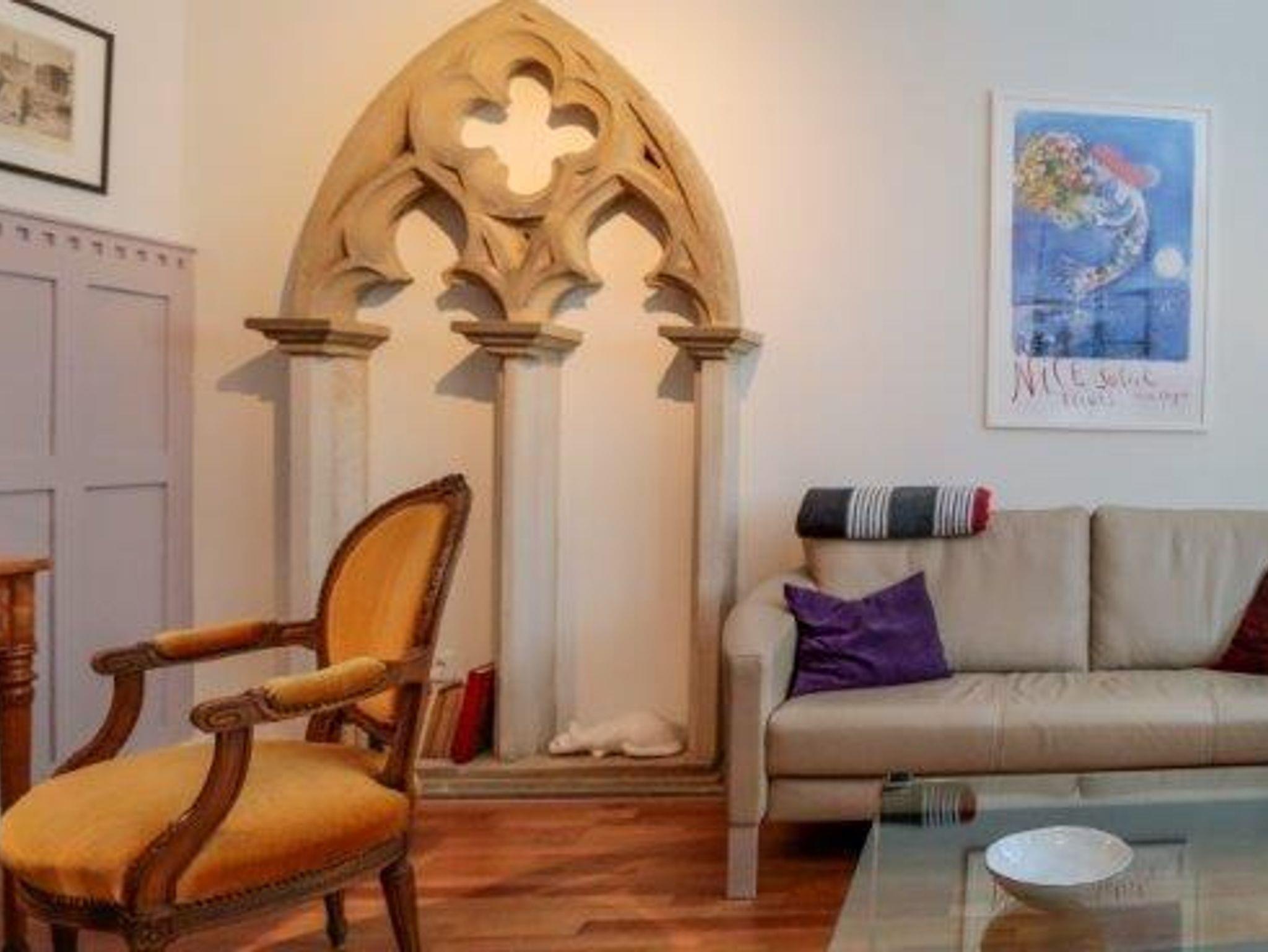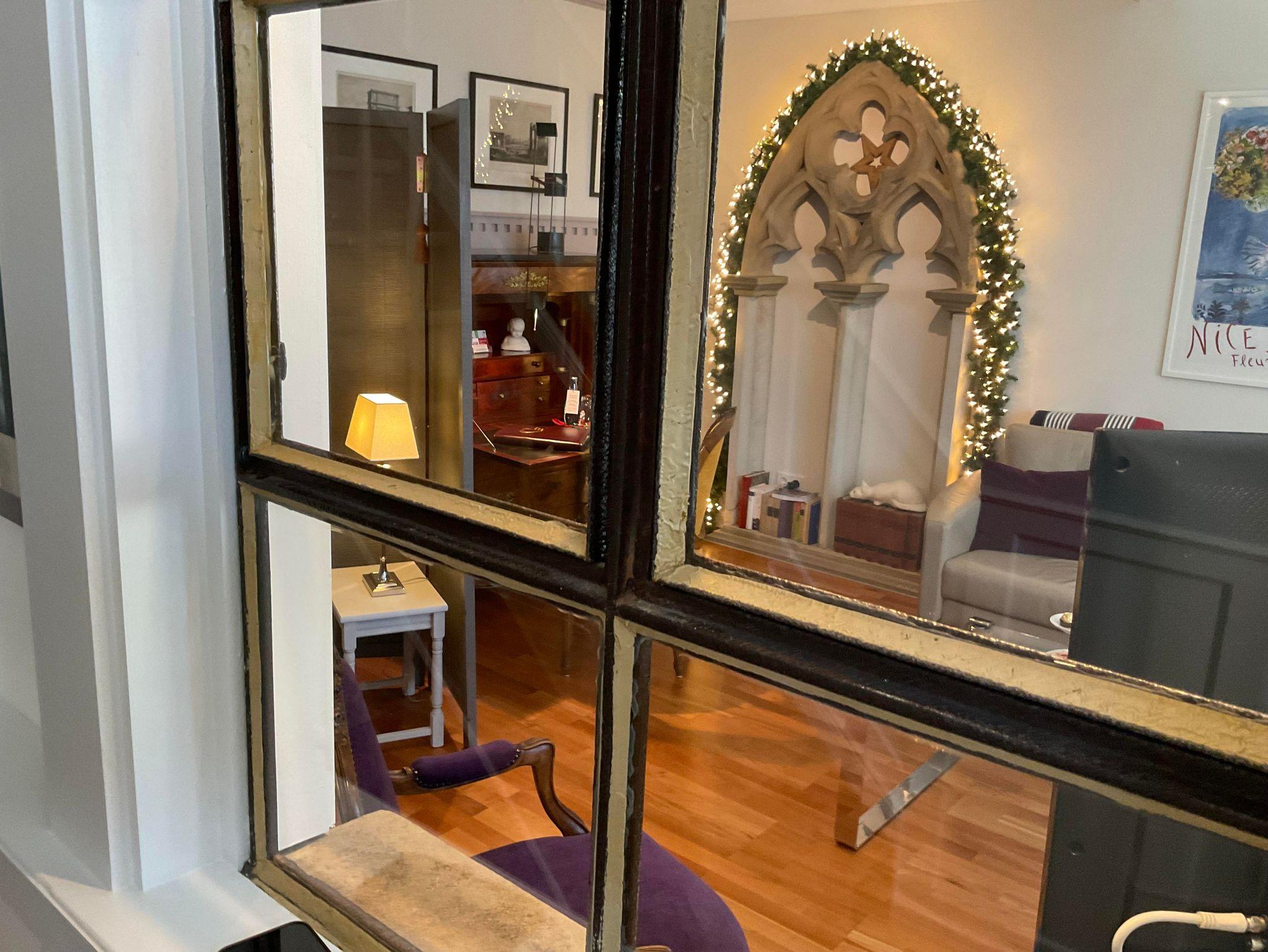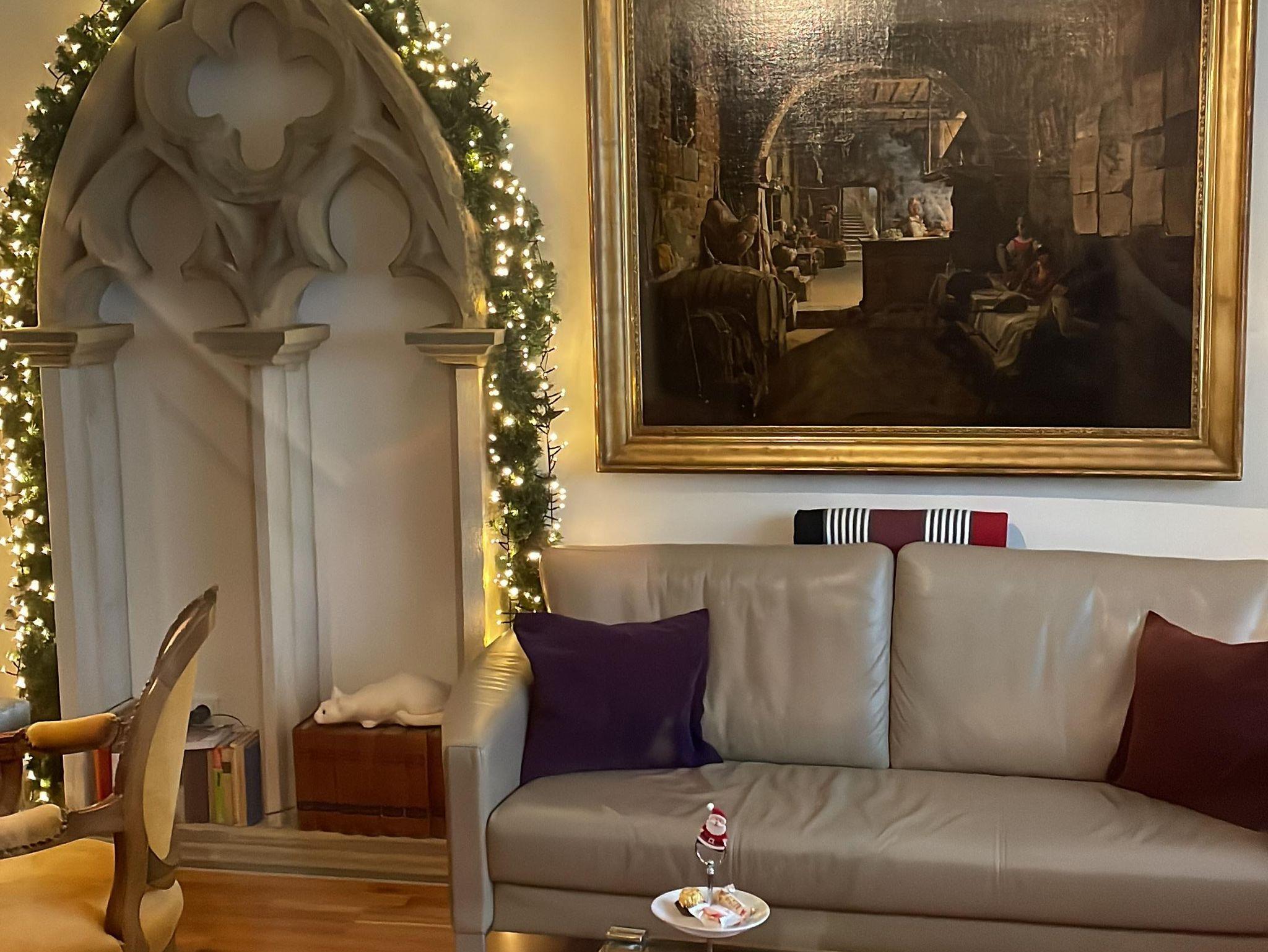 Nach einem ereignisreichen Tag das Erlebte noch einmal Revue passieren lassen, oder den nächsten Tag planen. Das gemütliche Wohnzimmer bietet Ihnen den geeigneten Ort. Hier wurden Sandsteinelemente einer alten, gotischen Kirche verbaut, die mit Fabrikfenstern aus dem Industriezeitalter zum Flur hin im Kontrast stehen. Ein antiker Sekretär bietet Ihnen Gelegenheit Urlaubsgrüße an Freunde und Verwandte zu schreiben.