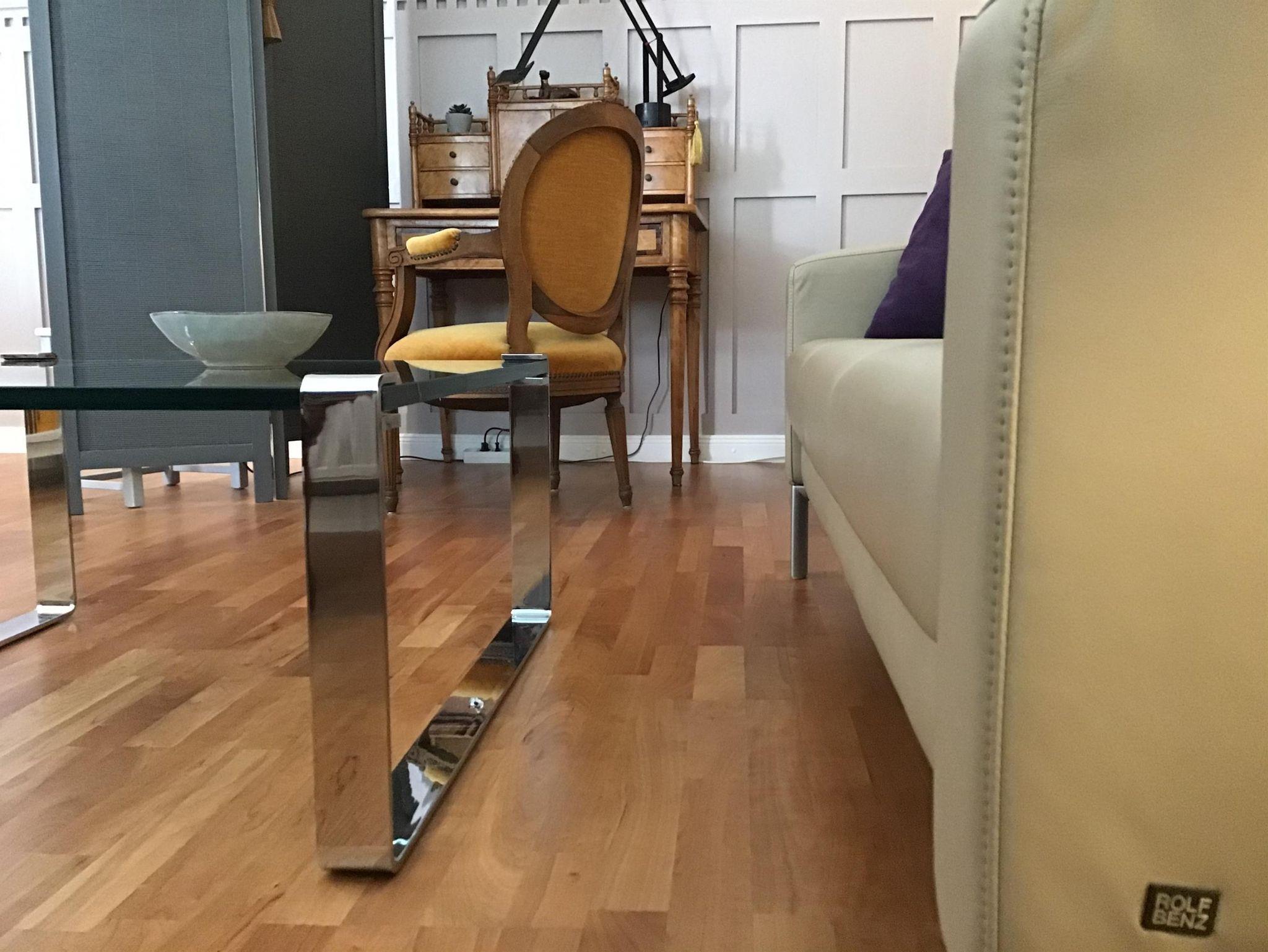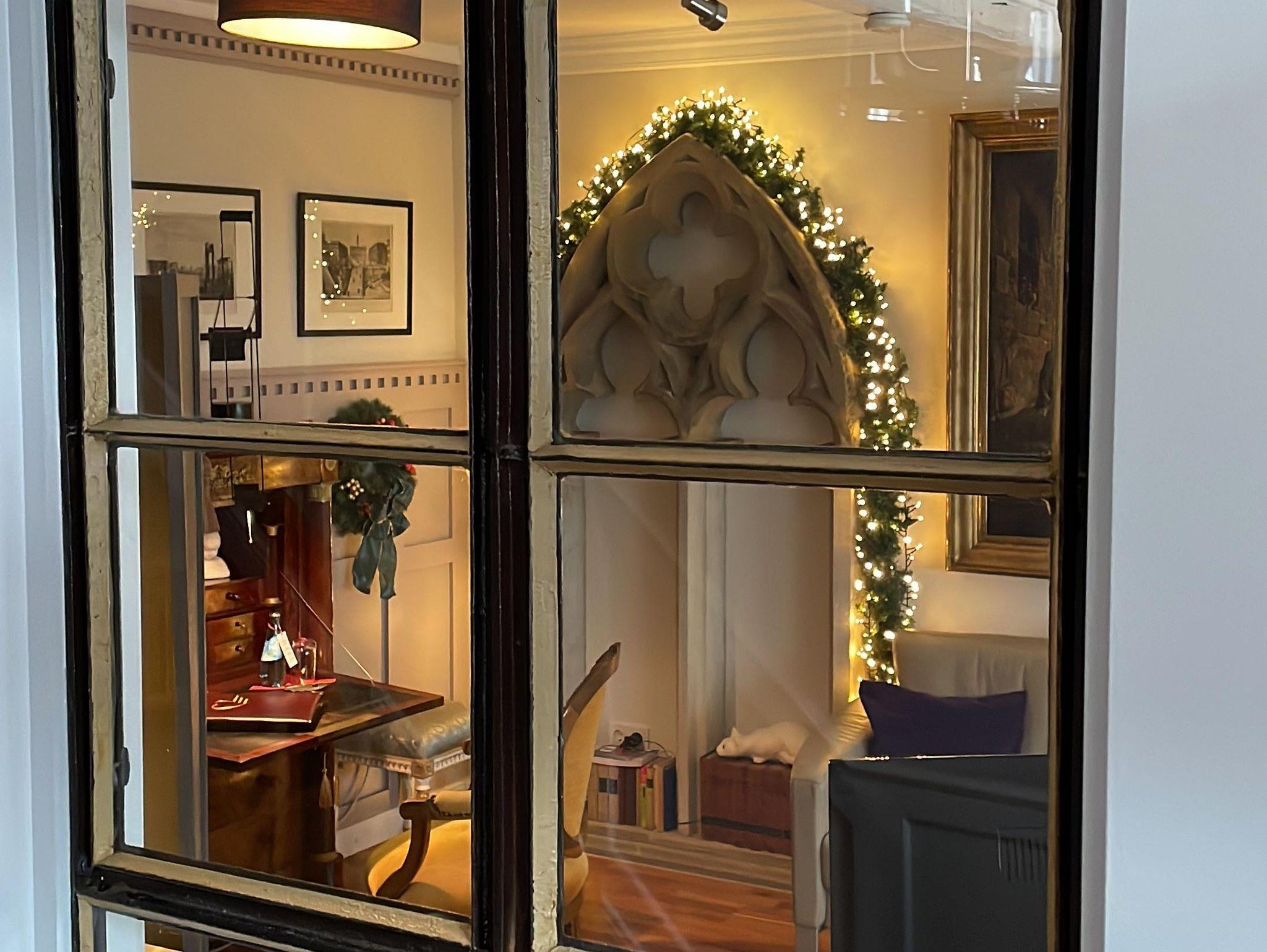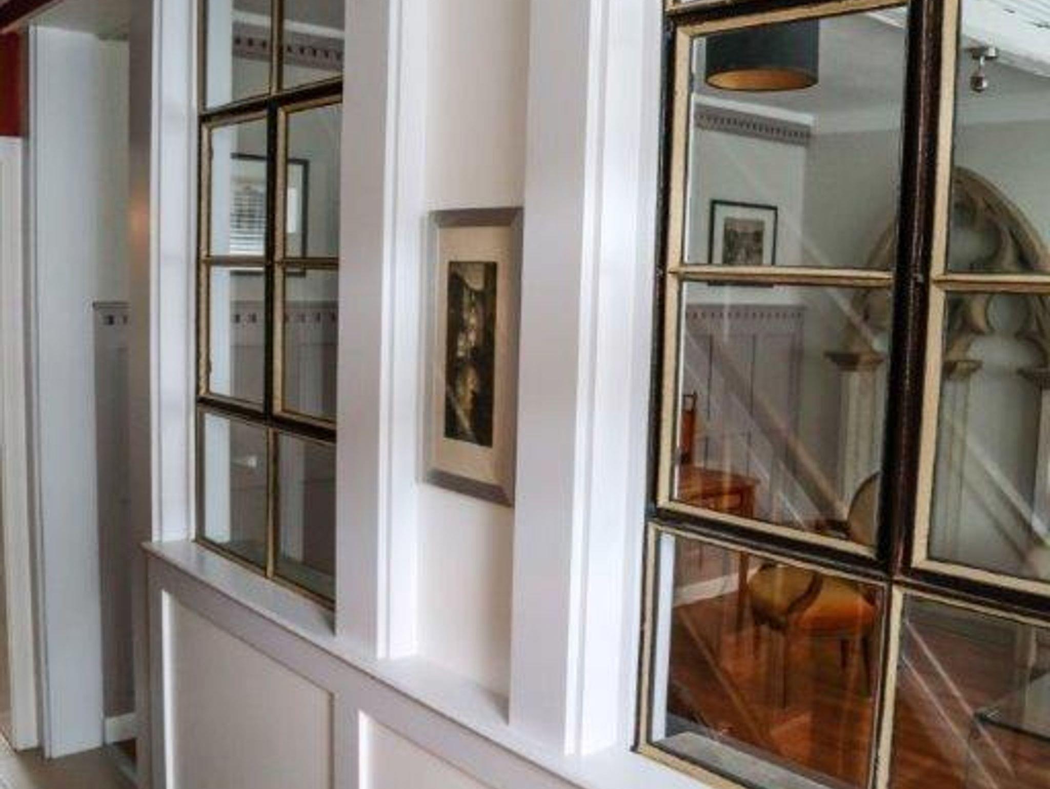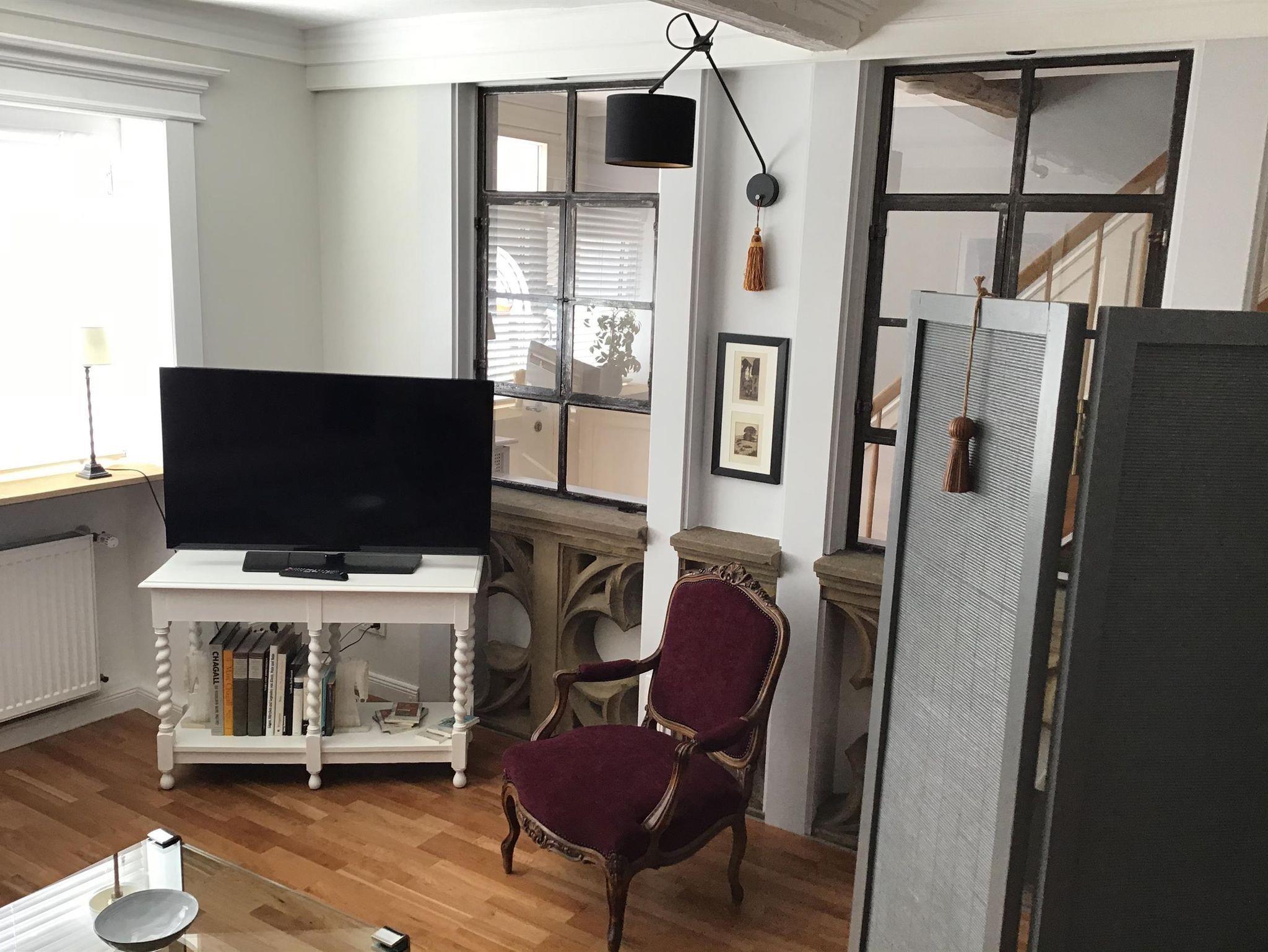 Nach einem ereignisreichen Tag das Erlebte noch einmal Revue passieren lassen, oder den nächsten Tag planen. Das gemütliche Wohnzimmer bietet Ihnen den geeigneten Ort. Hier wurden Sandsteinelemente einer alten, gotischen Kirche verbaut, die mit Fabrikfenstern aus dem Industriezeitalter zum Flur hin im Kontrast stehen. Ein antiker Sekretär bietet Ihnen Gelegenheit Urlaubsgrüße an Freunde und Verwandte zu schreiben.