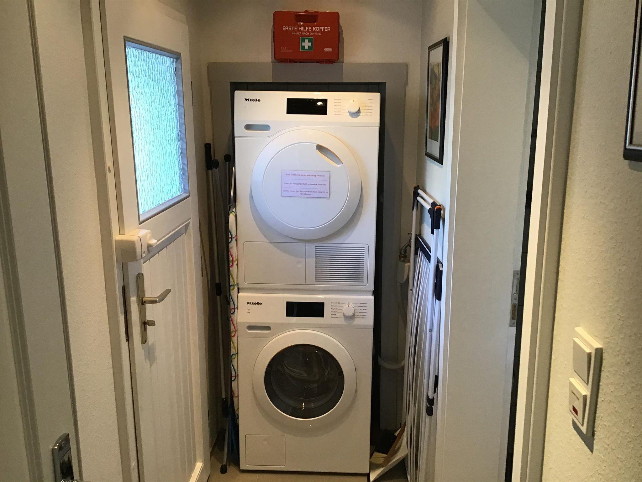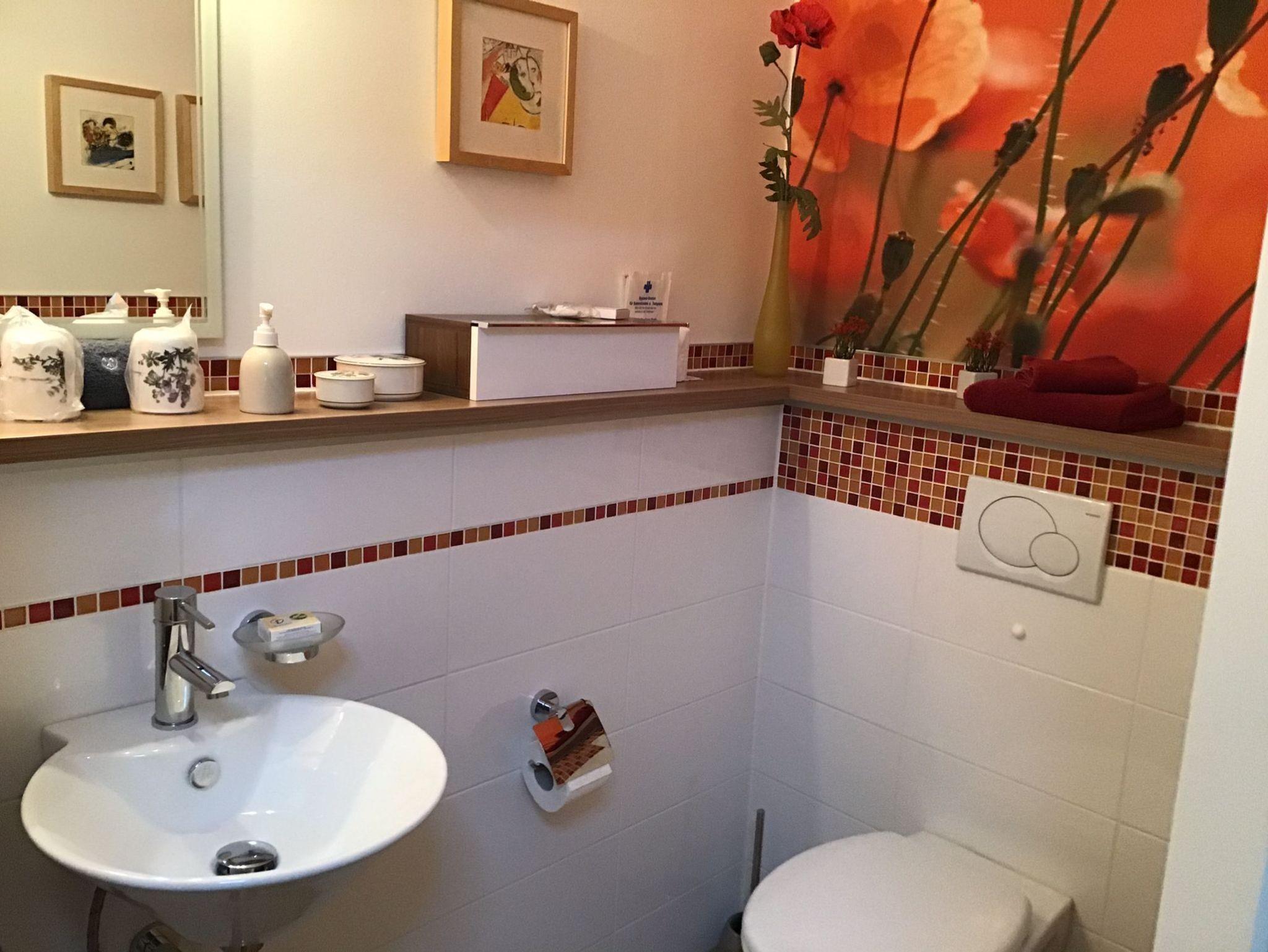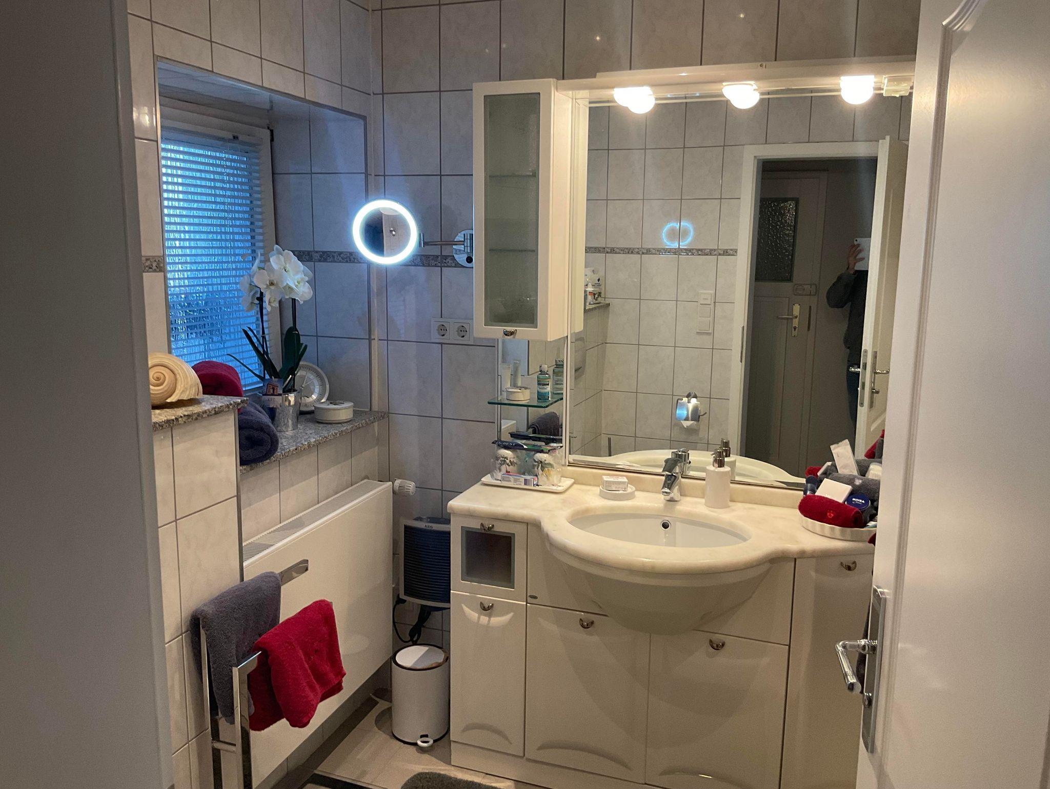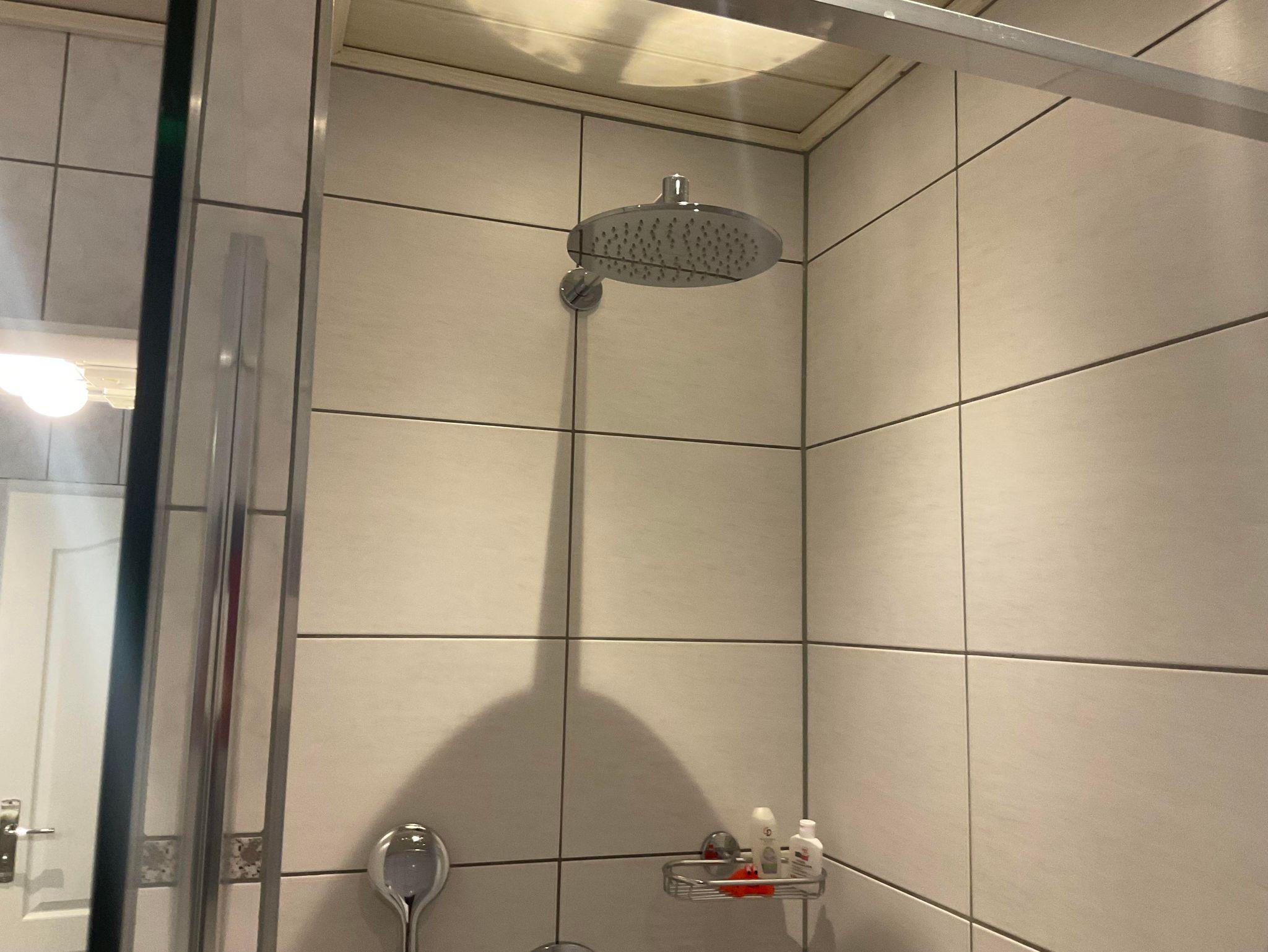 Im Erdgeschoss befindet sich die barrierefreie Duschkombination mit Tropendusche und Brausekopf. Per Knopfdruck schalten sie das Radio ein und genießen Ihre Dusche bei Musik oder den neusten Nachrichten. Im Durchgang zur Terrasse, außerhalb des Bades, befindet sich die eigens für Sie installierte Waschmaschine.