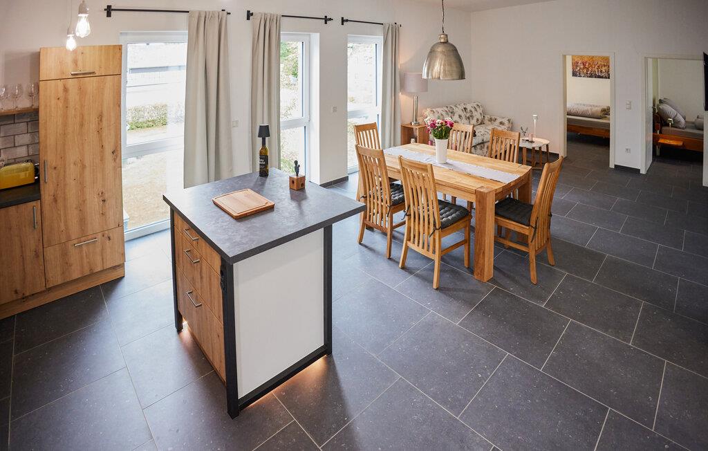 Oplev ren afslapning i denne moderne og stilfulde ferielejlighed. Den smarte kombination af mørke fliser og kvalitetsløsninger i træ skaber en harmonisk atmosfære, der lægger op til at nyde livet og have det rart. De lyse rum på første sal giver jer masser af muligheder for at slappe af. Nyd den åbne terrasse med en vidunderlig udsigt over landskabet. Adgangen til åen og et bålfad i haven lægger op til en masse gode oplevelser udendørs.