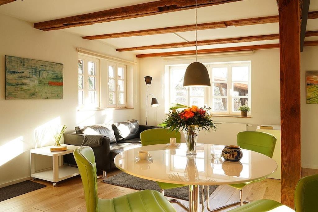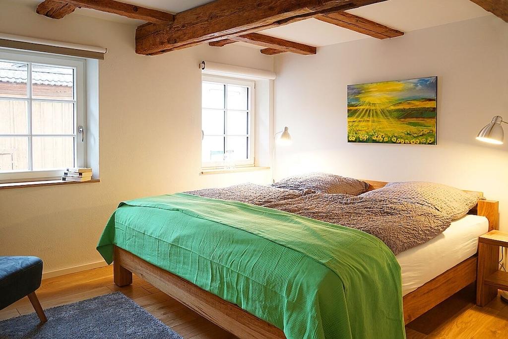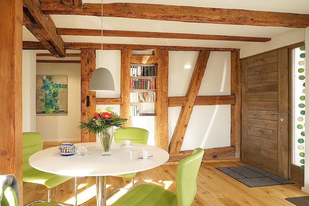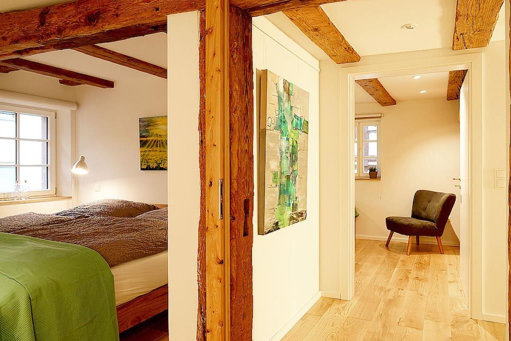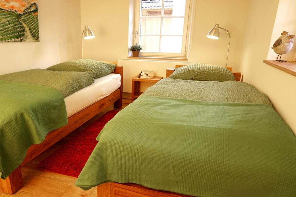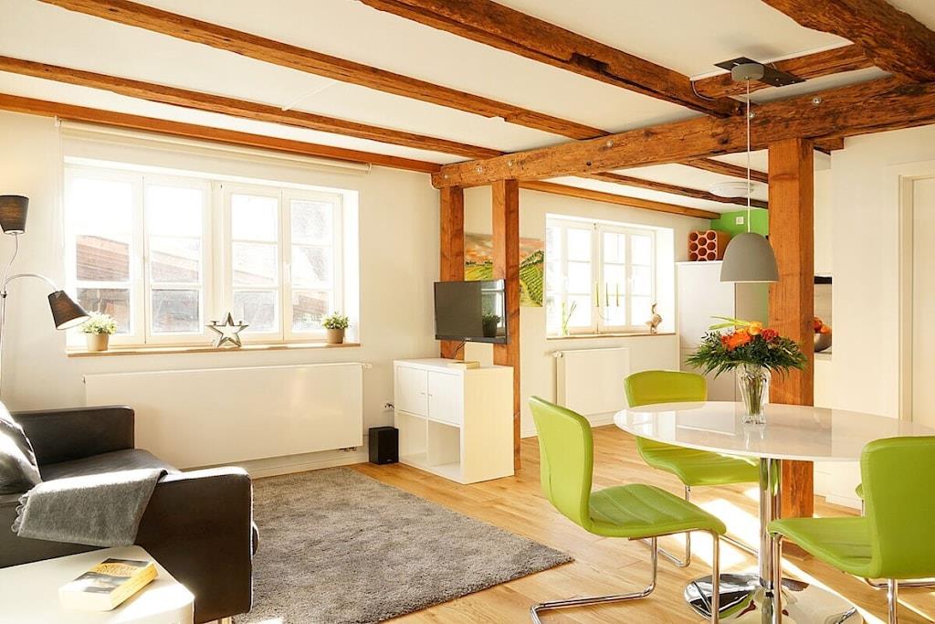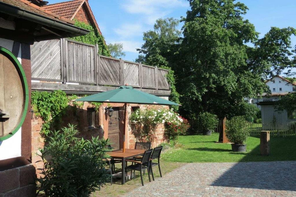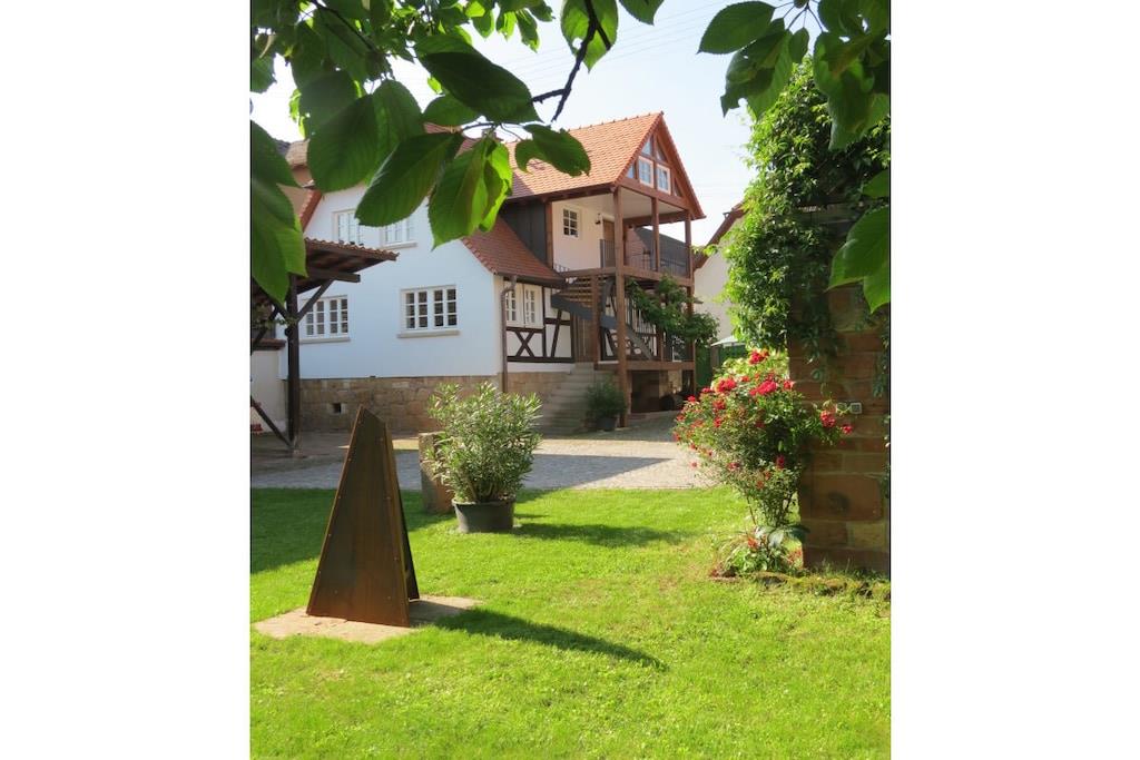 I vores smukke ferielejligheder i det historiske bindingsværkshus kan I slappe af i fred og ro eller bruge det som base for at udforske den sydlige vinrute og Pfälzer skov. Vores rummelige hyttehave er en oase til afslapning og et dejligt legeområde for jeres børn. En typisk pfalzer vinkro eller vinrestaurant samt forskellige vingårde er let tilgængelige til fods fra Martinshof. For en tur til det ugentlige marked i Wissembourg, Frankrig, eller for at smage på tarte flambée i det nærliggende Alsace, er I kun få kilometer væk. Familier og børn er meget velkomne. Vi har et udvalg af cykelvogne og legetøj til rådighed for børnene.