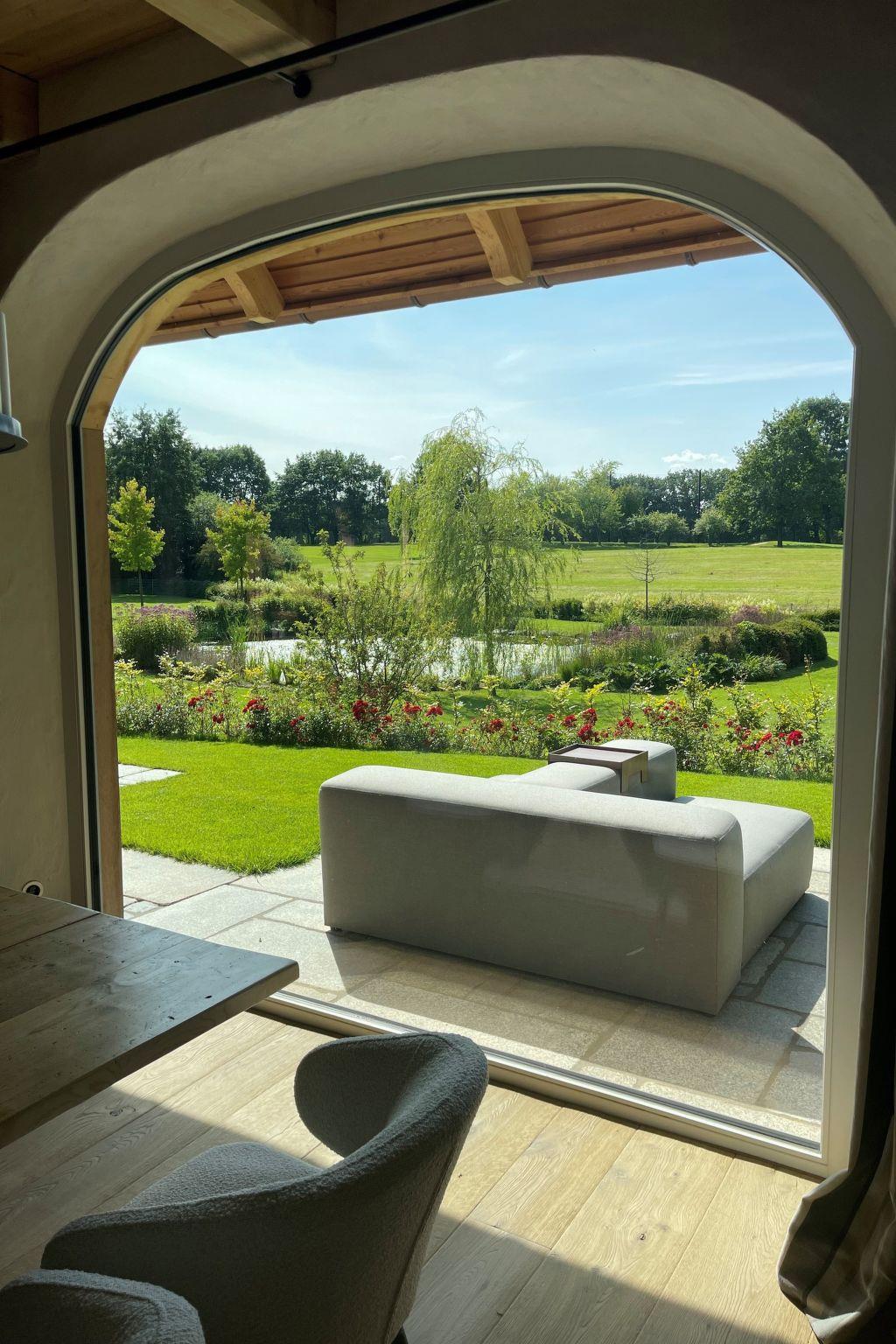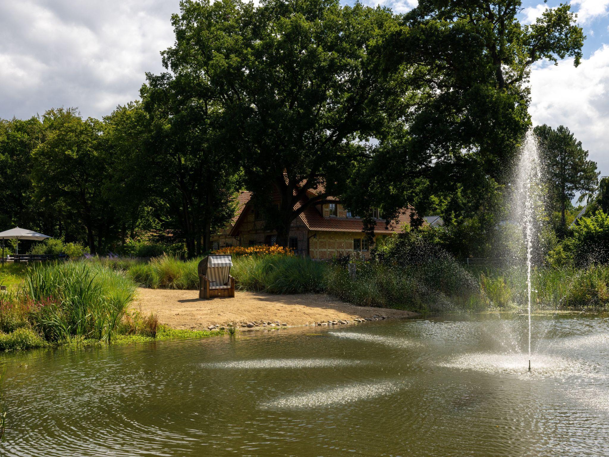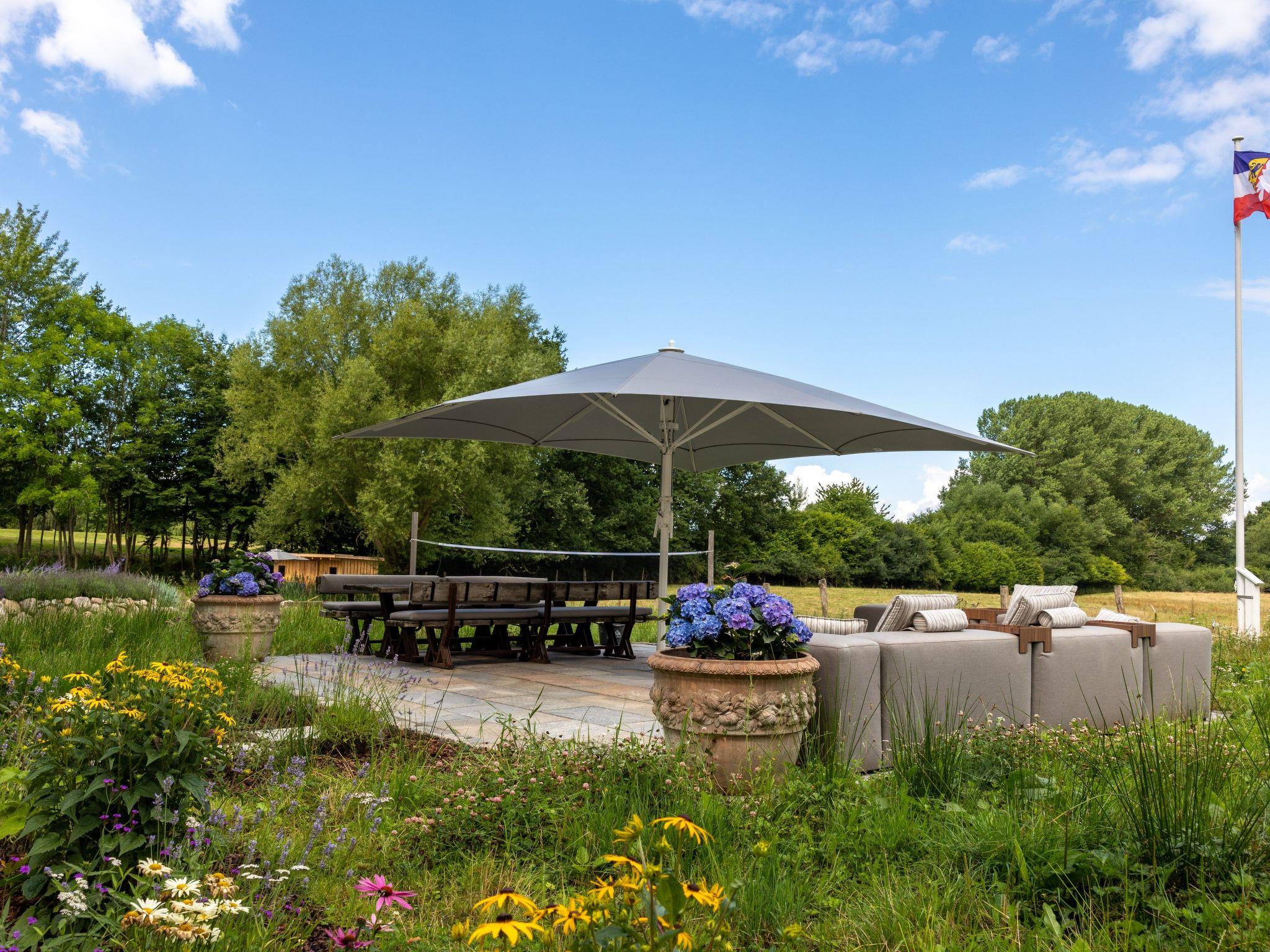 The property boasts its own natural lake with beach, beach chair, beach grass and water fountain. In addition, the badminton court, surrounded by a flowering meadow, invites you to play and relax. The main terrace, one of four, has a spacious lounge and a rustic seating area for eight people, complemented by a brick pizza oven and an additional charcoal barbecue. On cooler summer days, the 16 square metre parasol with integrated radiant heaters ensures optimum comfort. Thanks to power sockets and USB ports, the terrace can be transformed into a dream home office surrounded by nature.