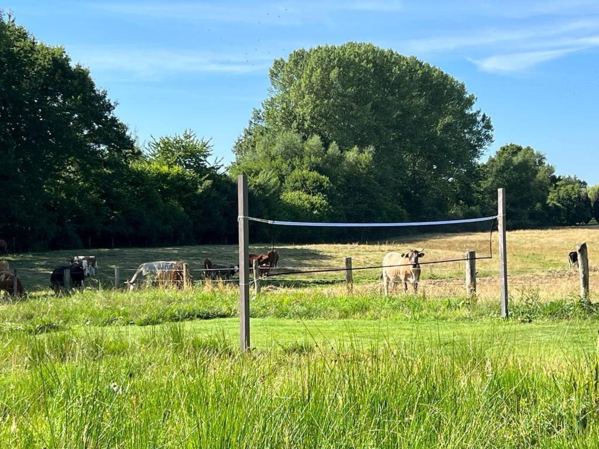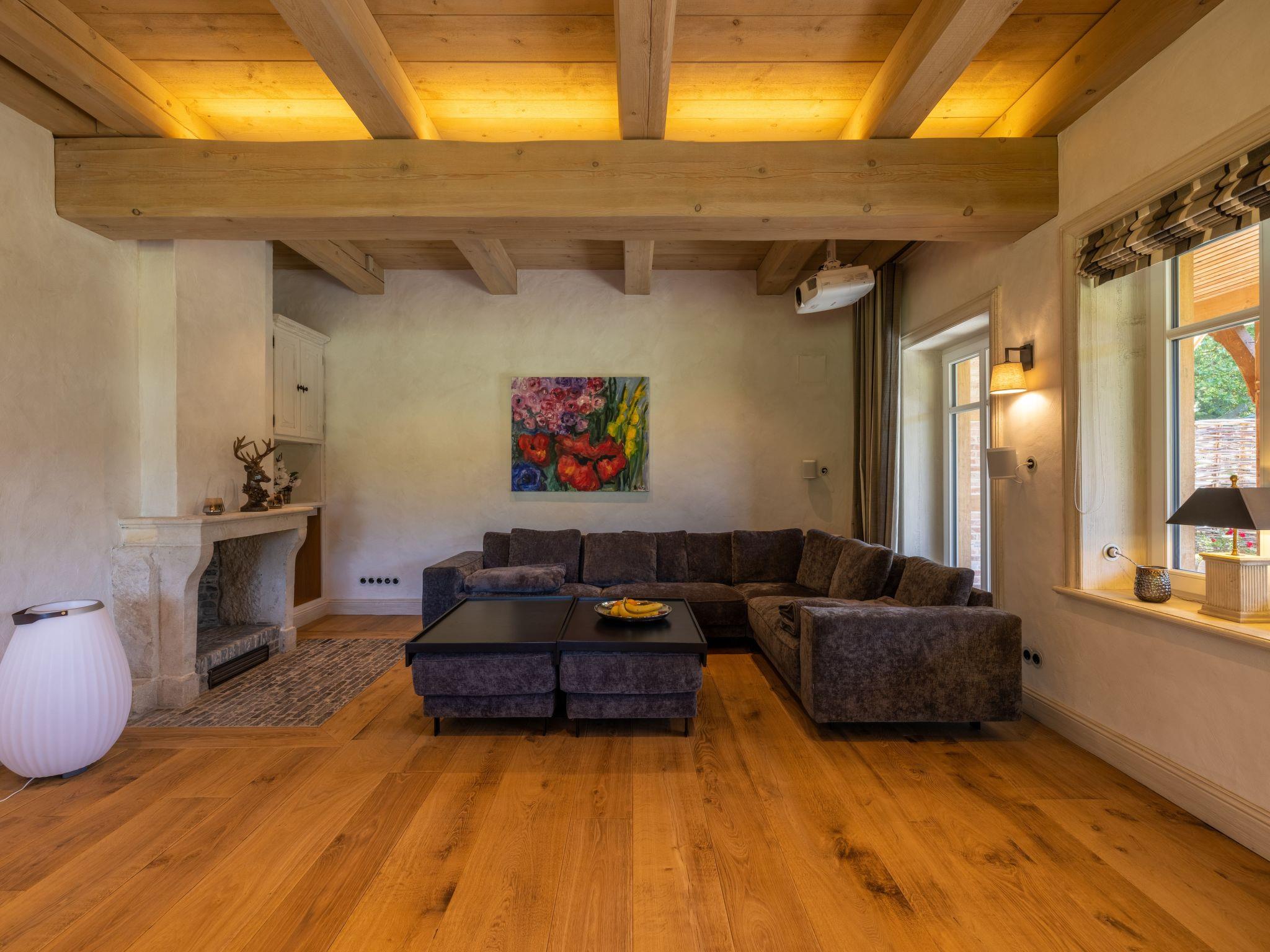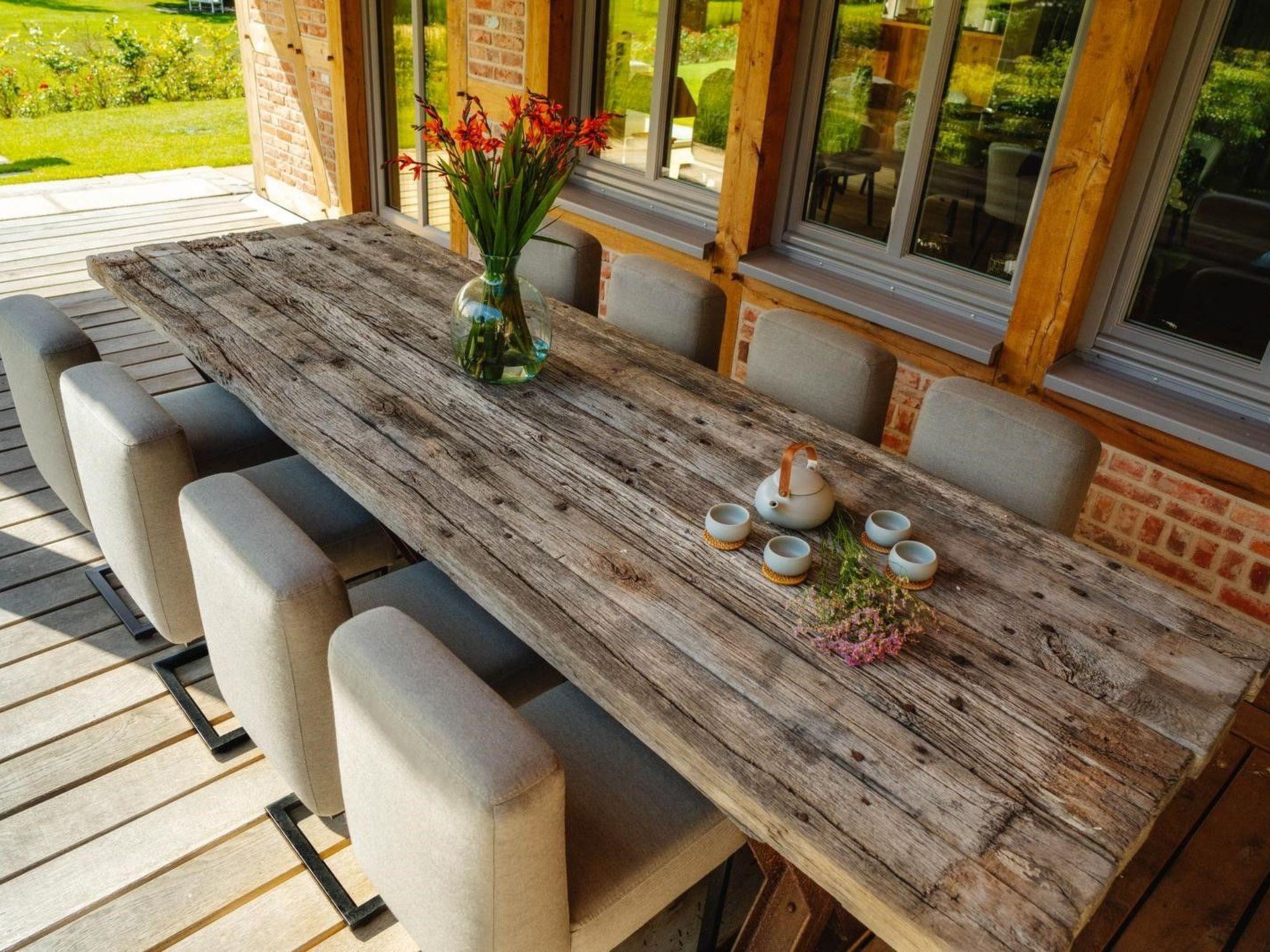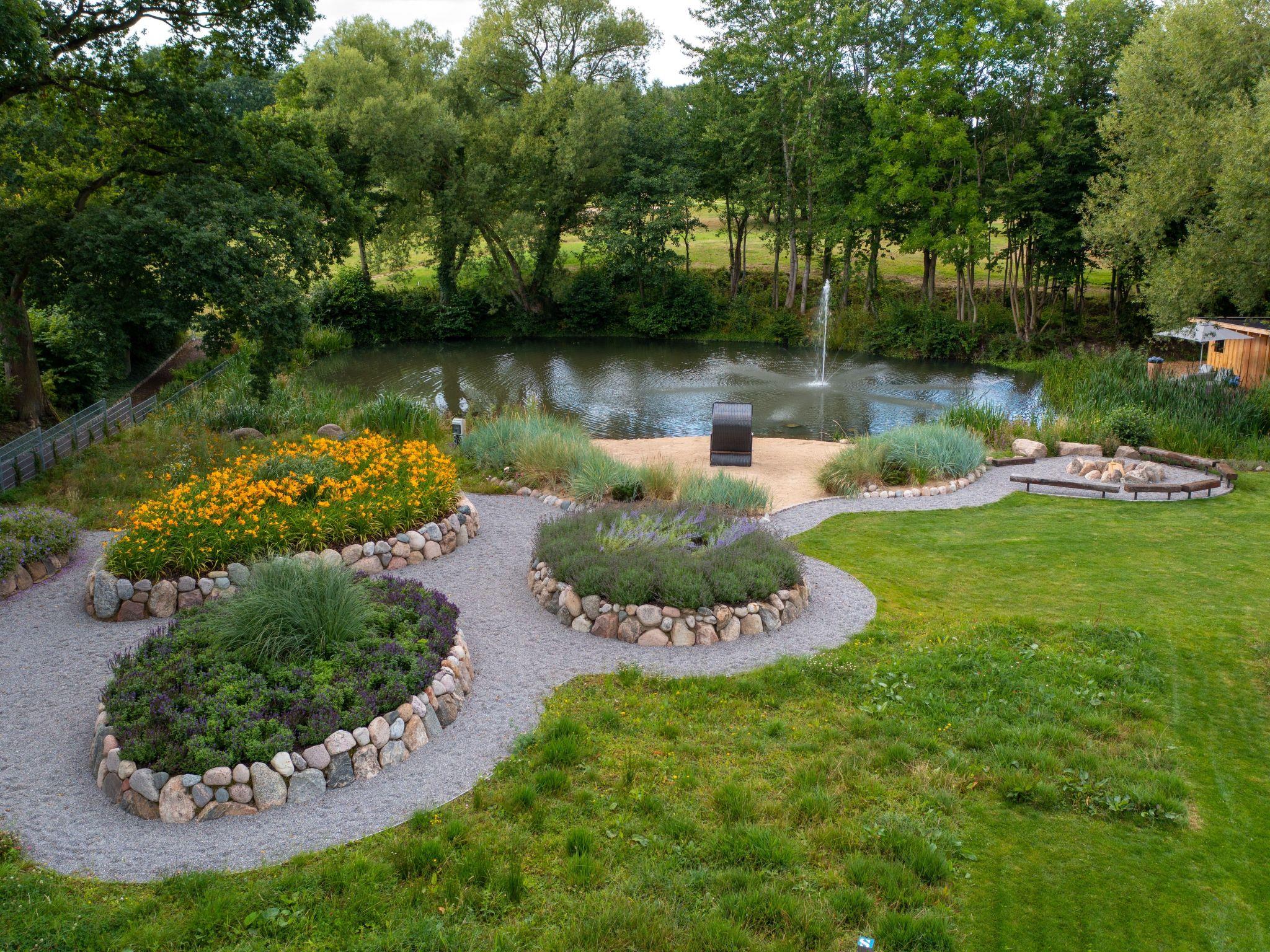 The property boasts its own natural lake with beach, beach chair, beach grass and water fountain. In addition, the badminton court, surrounded by a flowering meadow, invites you to play and relax. The main terrace, one of four, has a spacious lounge and a rustic seating area for eight people, complemented by a brick pizza oven and an additional charcoal barbecue. On cooler summer days, the 16 square metre parasol with integrated radiant heaters ensures optimum comfort. Thanks to power sockets and USB ports, the terrace can be transformed into a dream home office surrounded by nature.