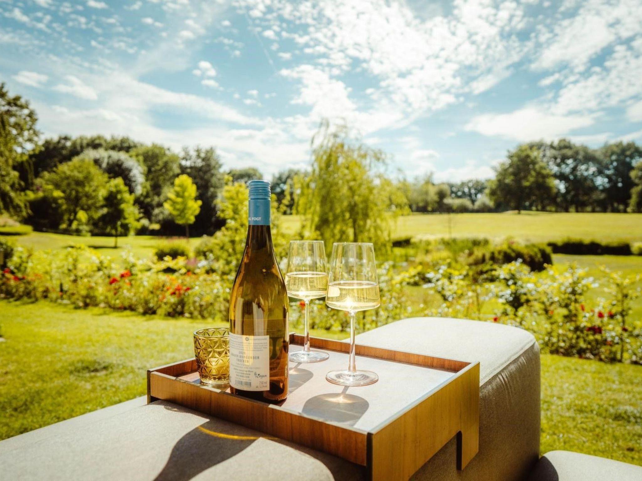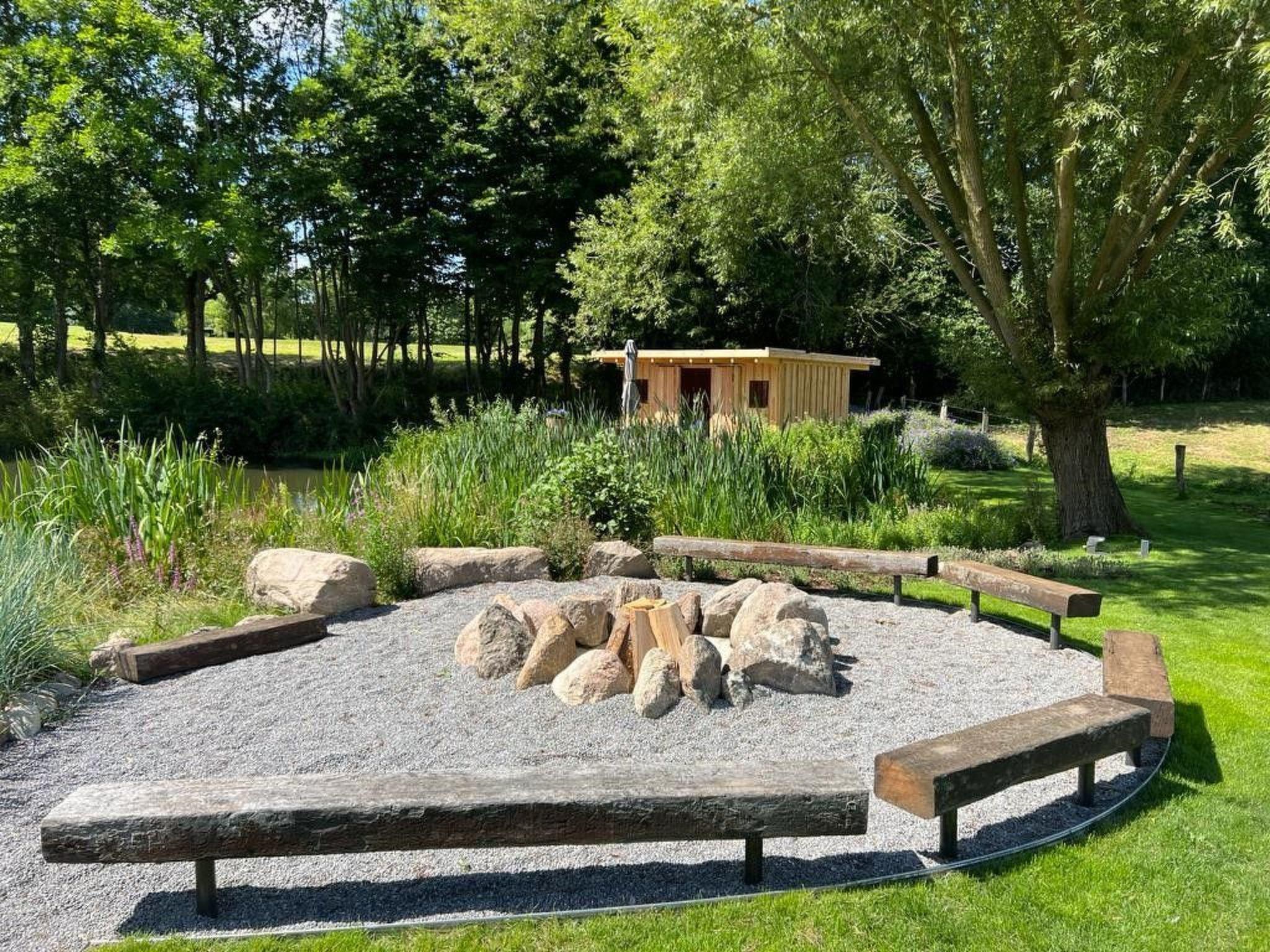 Evenings are unforgettable at the romantic campfire site next to the lake, which can accommodate more than 10 people. The second large, covered main terrace right next to the house offers a marvellous view of nature and the golf course. The view from the third terrace, equipped with a high-quality sunset lounge, is similarly impressive. The wooden terrace by the lake, equipped with a mini-gym, is ideal for outdoor yoga.