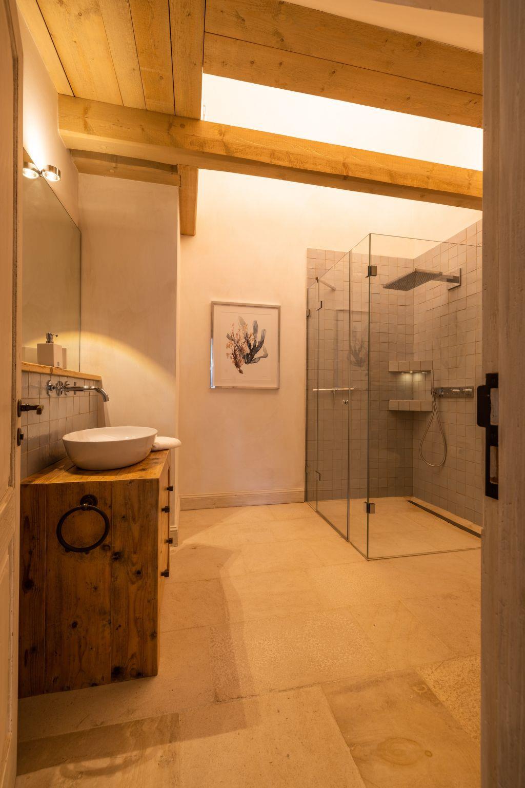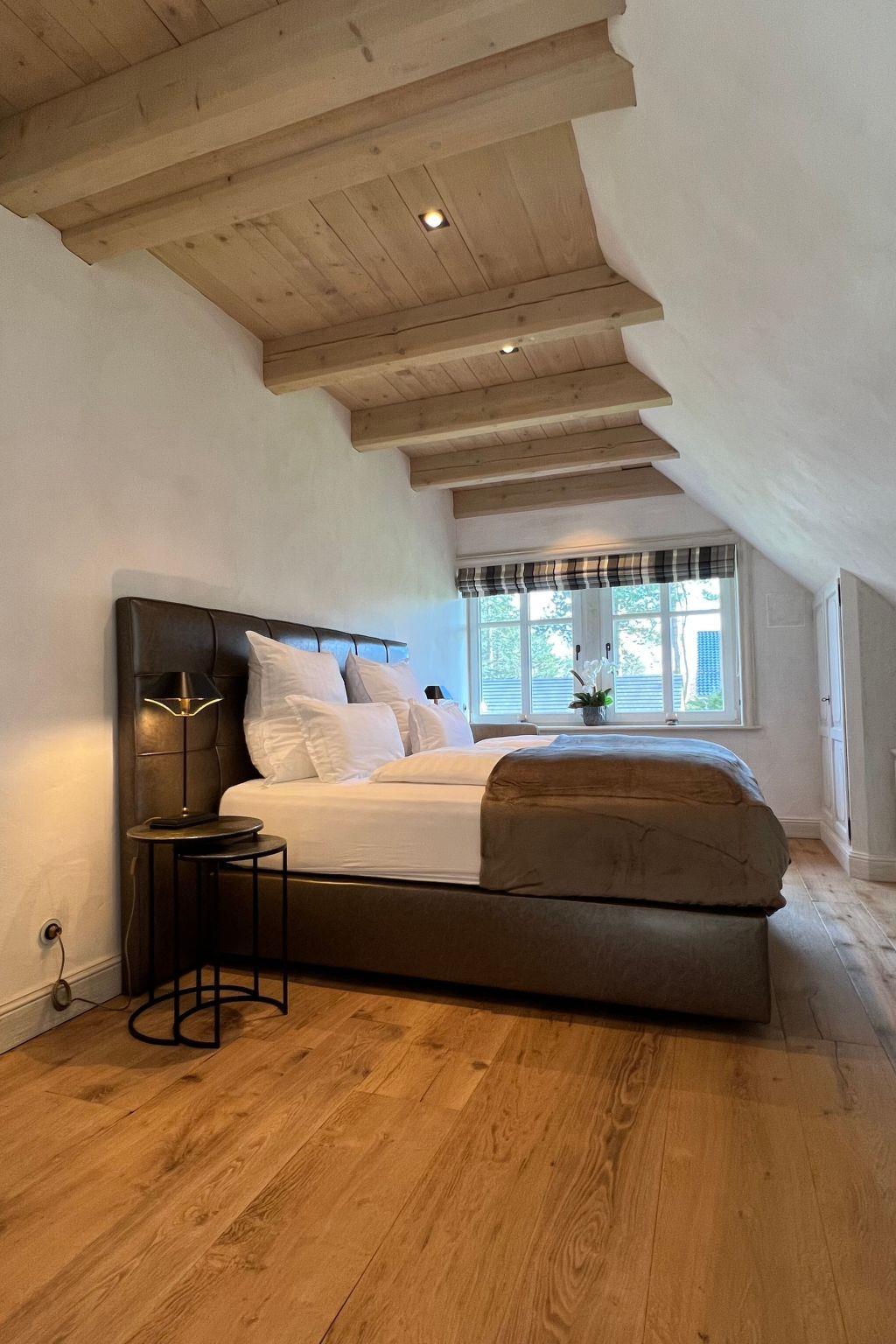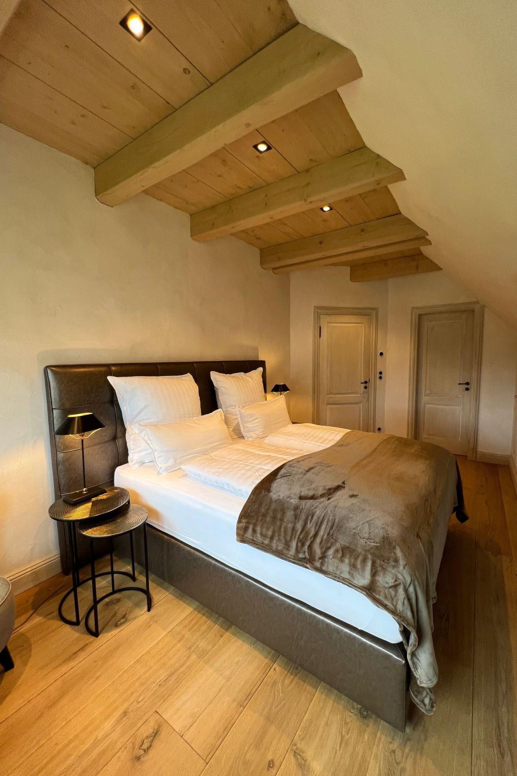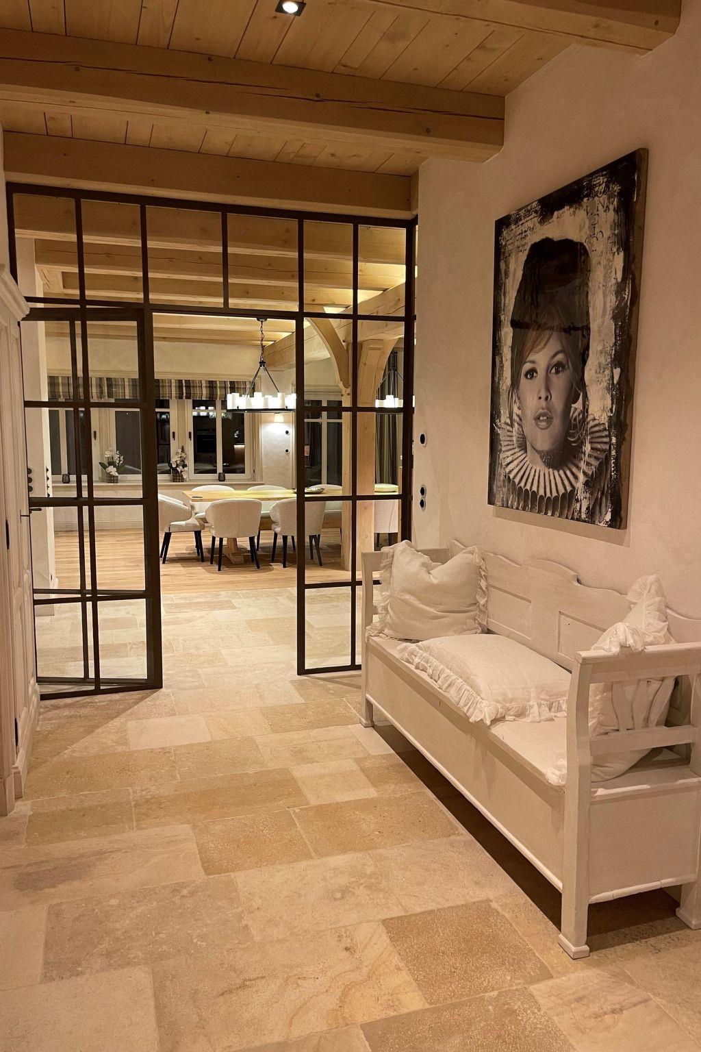The spacious living and dining area, the centrepiece of the house, combines high-quality furnishings with rustic charm. The floorboards are made of brushed and flamed oak, while large wooden beams on the ceiling and 150-year-old, worm-eaten wooden fixtures add a special charm. The combination of historic building materials and modern technology creates a unique effect and a cosy atmosphere.