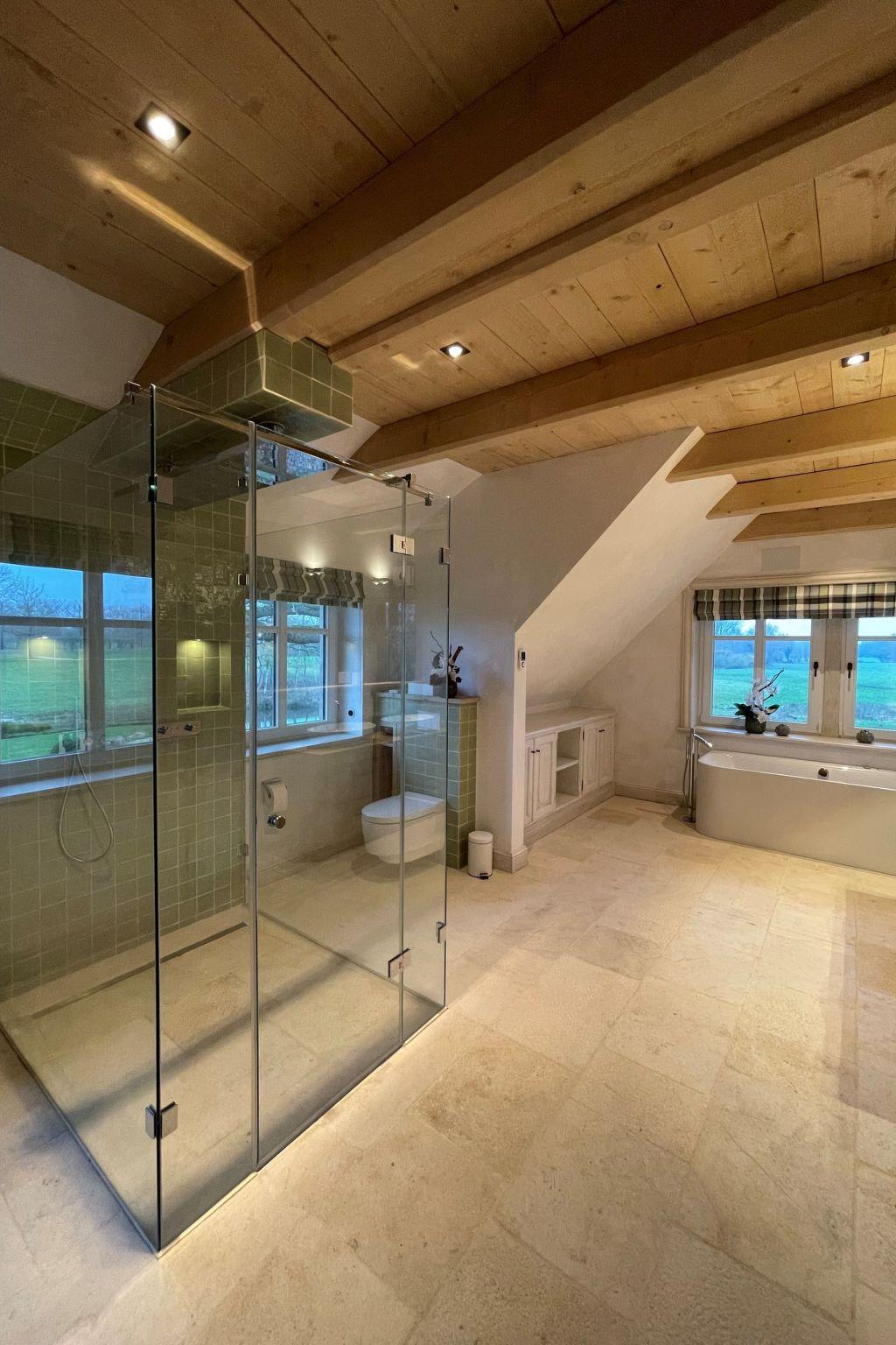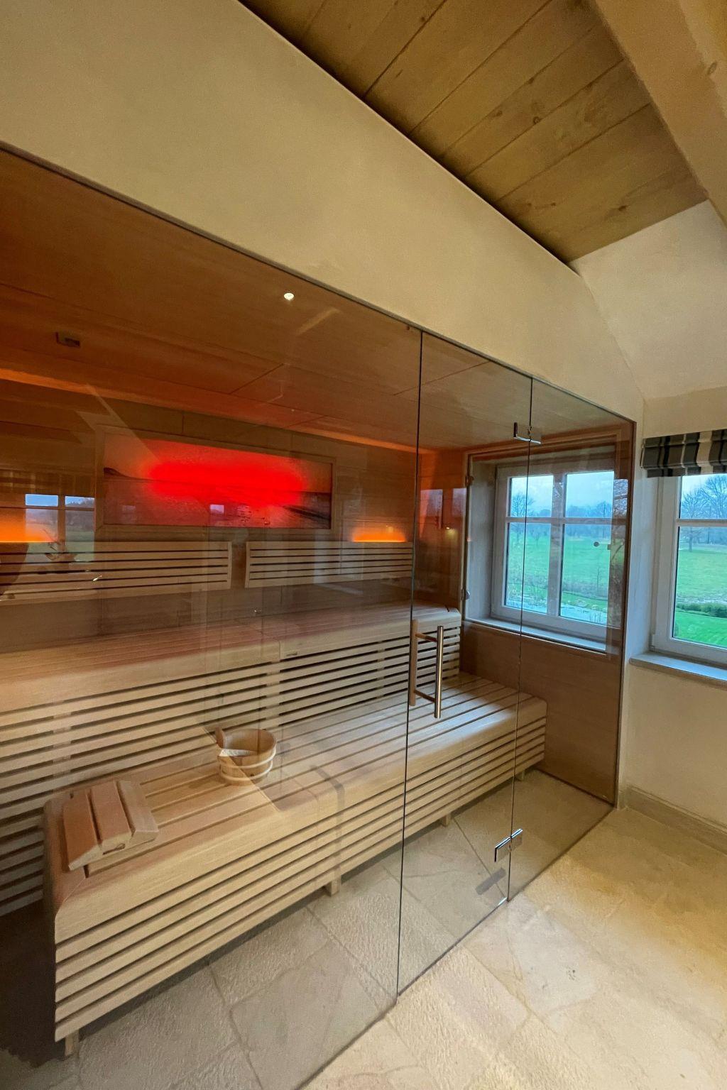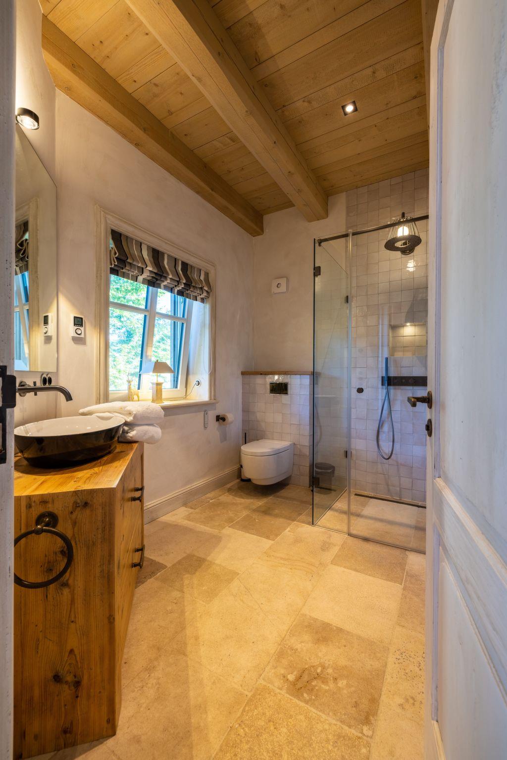 The interior of the half-timbered villa extends over 260 square metres and houses four bedrooms, each with its own bathroom. A private sauna with a view of the natural surroundings, a whirlpool bath and modern walk-in showers create a luxurious spa atmosphere. Hand-carved Moroccan tiles in the bathrooms and clay plaster walls in the bedrooms create a perfect indoor climate.