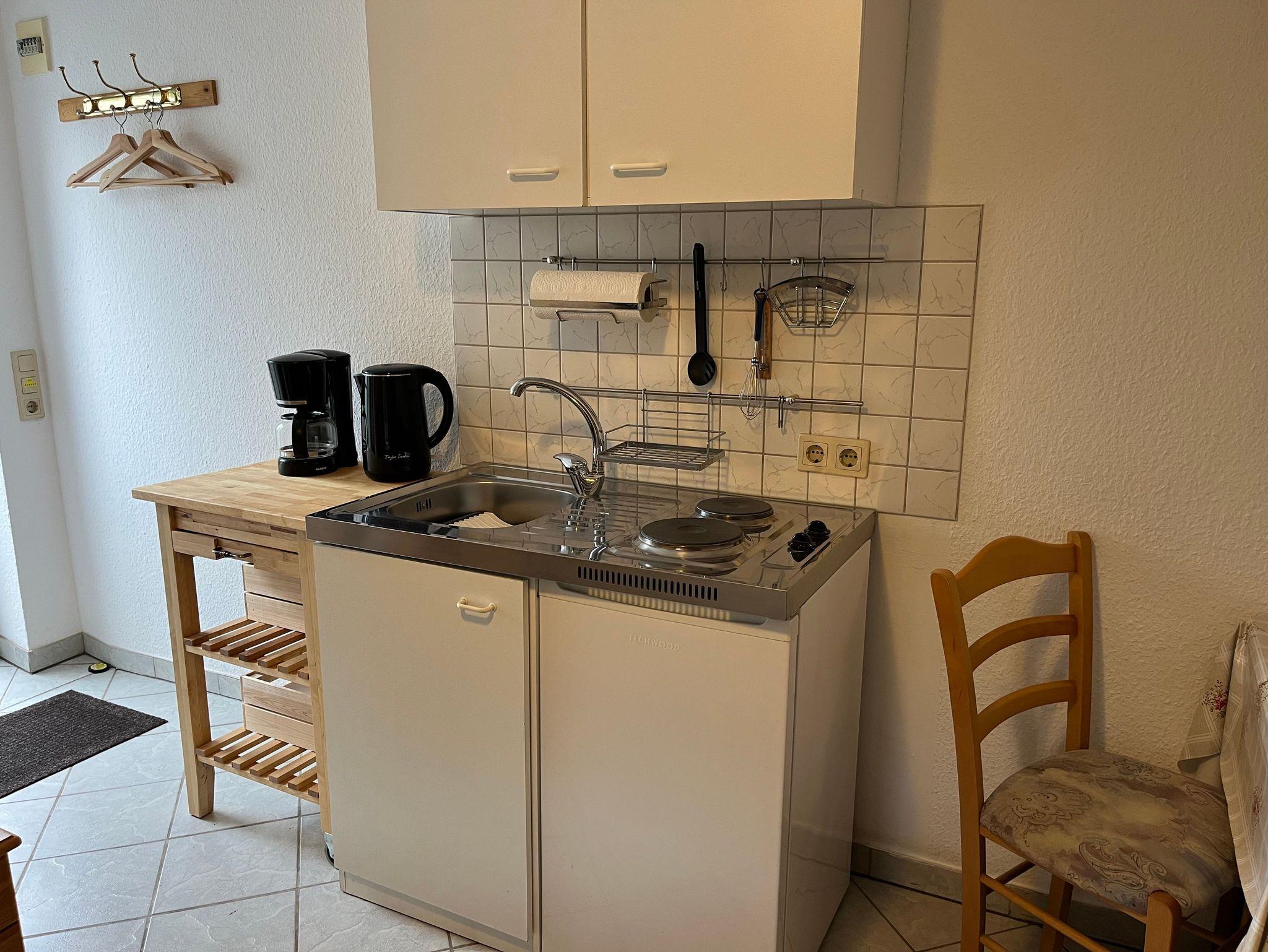 1-Raum-Bungalow (ca. 16 m² ) Boxspring-Doppelbett, Eßtisch und 2 Stühl, TV & Radio, kleine Küchenzeile - 2 Plattenherd, Kühlschrank mit Gefrierfach, Mikrowelle, Kaffeemachine, Toaster und Wasserkocher. Dusche/ WC.