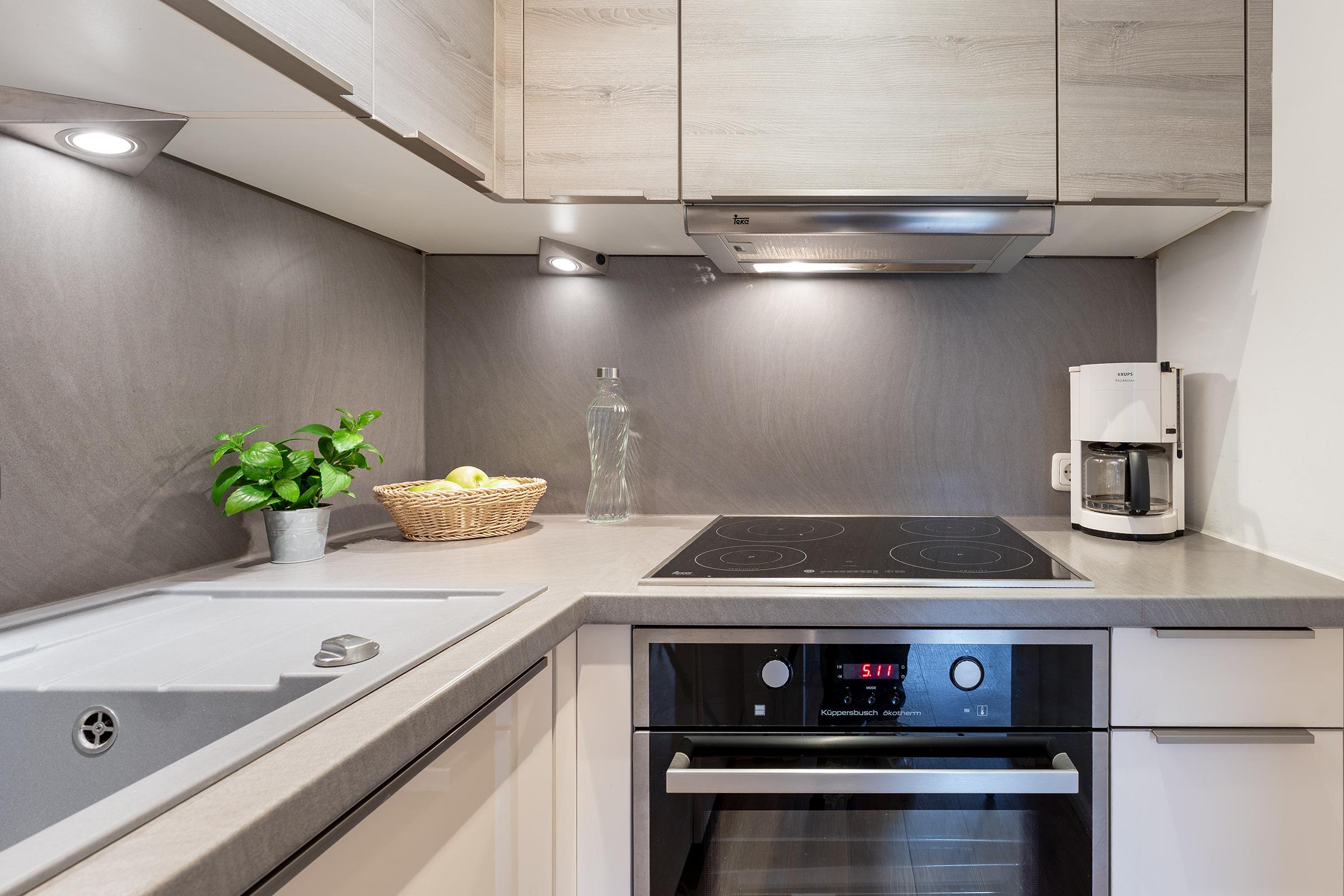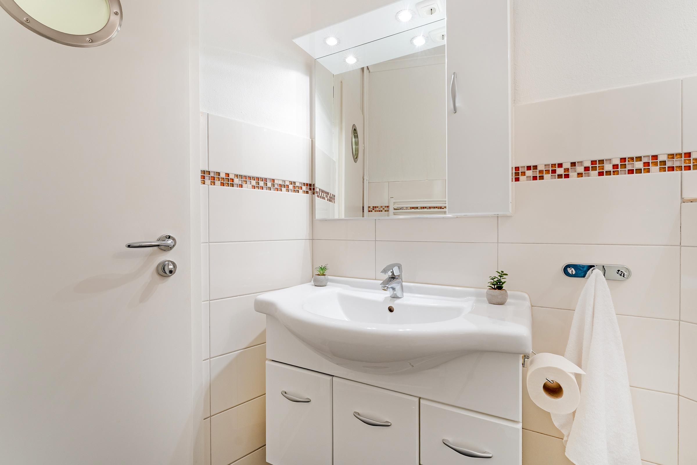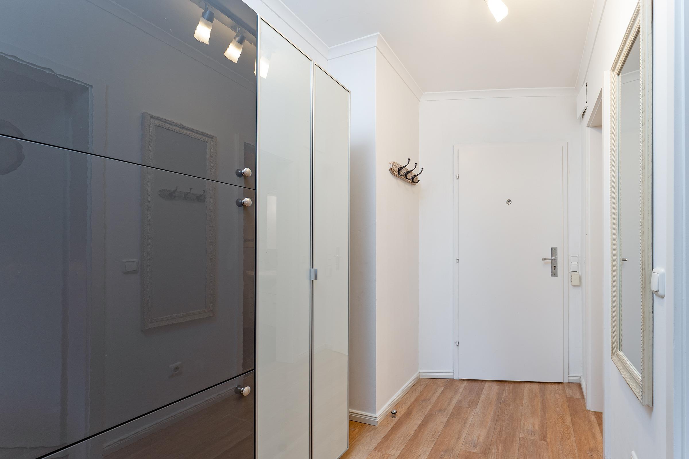 Diese helle und moderne Ferienwohnung überzeugt mit ihrer gemütlichen Ausstattung und ihrer Nähe zum Meer. Der Wohnbereich lädt mit einer bequemen Sofaecke und Fernseher zu entspannten Stunden ein. Große Fenster sorgen für viel Tageslicht und führen direkt auf den möblierten Balkon – hier können Sie den Tag bei einer Tasse Kaffee beginnen und die frische Ostseeluft genießen. Die Küche ist vollständig ausgestattet und bietet alles, was Sie zum Kochen brauchen. Das separate Schlafzimmer sorgt für erholsame Nächte – mit Doppelbett und Kleiderschrank bleiben keine Wünsche offen. Das moderne Bad verfügt über Dusche, WC, beheizbaren Handtuchhalter.