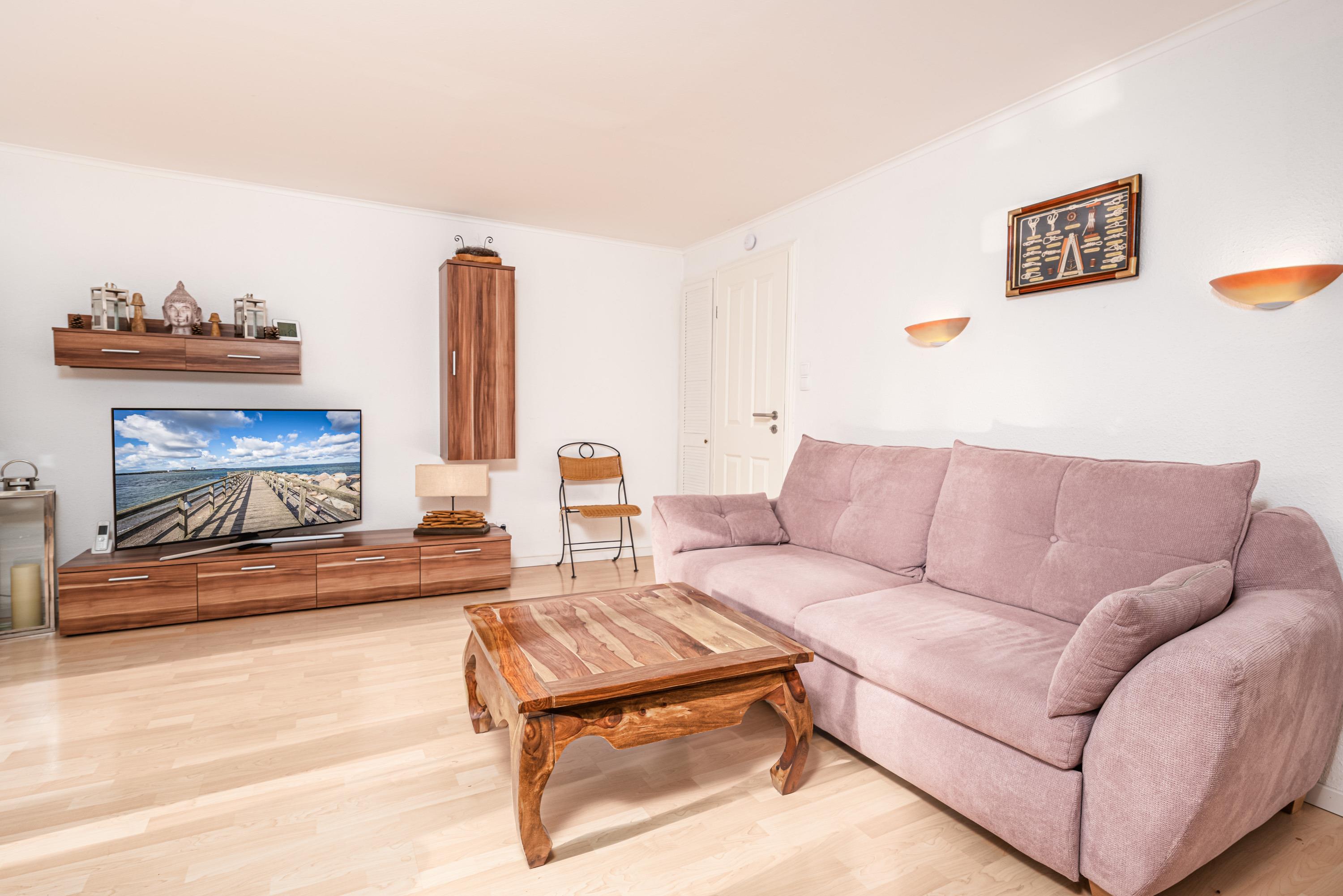 Das Appartement 1 begrüßt Sie mit einem großen und gemütlichen Wohnbereich. Hier finden Sie einen modernen Flatscreen-TV, eine bequeme Couch und eine kleine Leseecke. Mit geselligen Abendessen und Spieleabende können Sie an dem großen Esstisch die Urlaubstage ausklingen lassen. In dem 2 -Zimmer Appartement mit 60m² können bis zu 4 Personen einen traumhaften Urlaub verbringen.