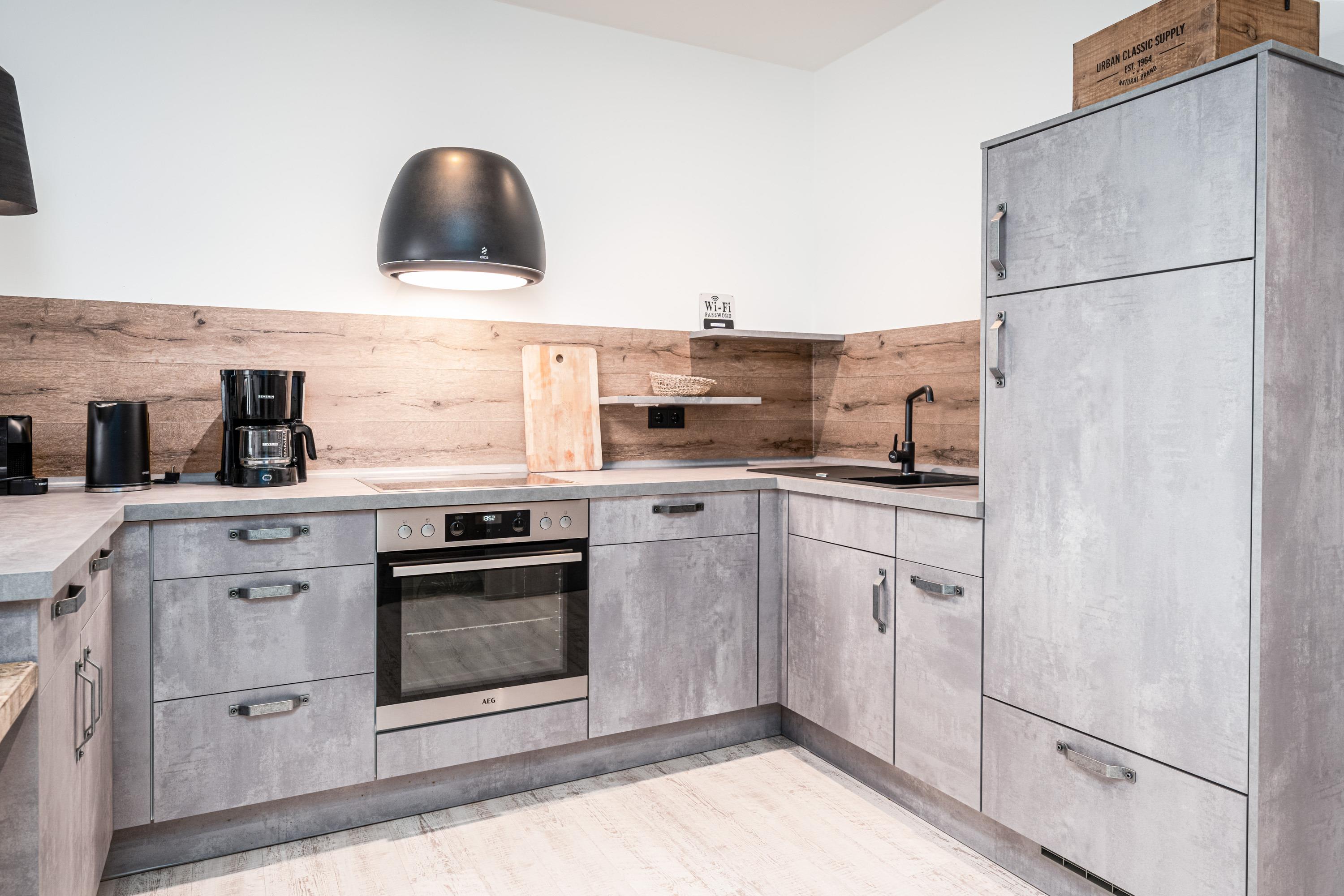 Der Wohn- und Essbereich mit integrierter offener, voll ausgestatteter Küche mit Backofen, Induktionsherd, Geschirrspüler und allen weiteren Dingen, die Sie zum Zubereiten toller Speisen benötigen, lädt zum Kochen ein.
