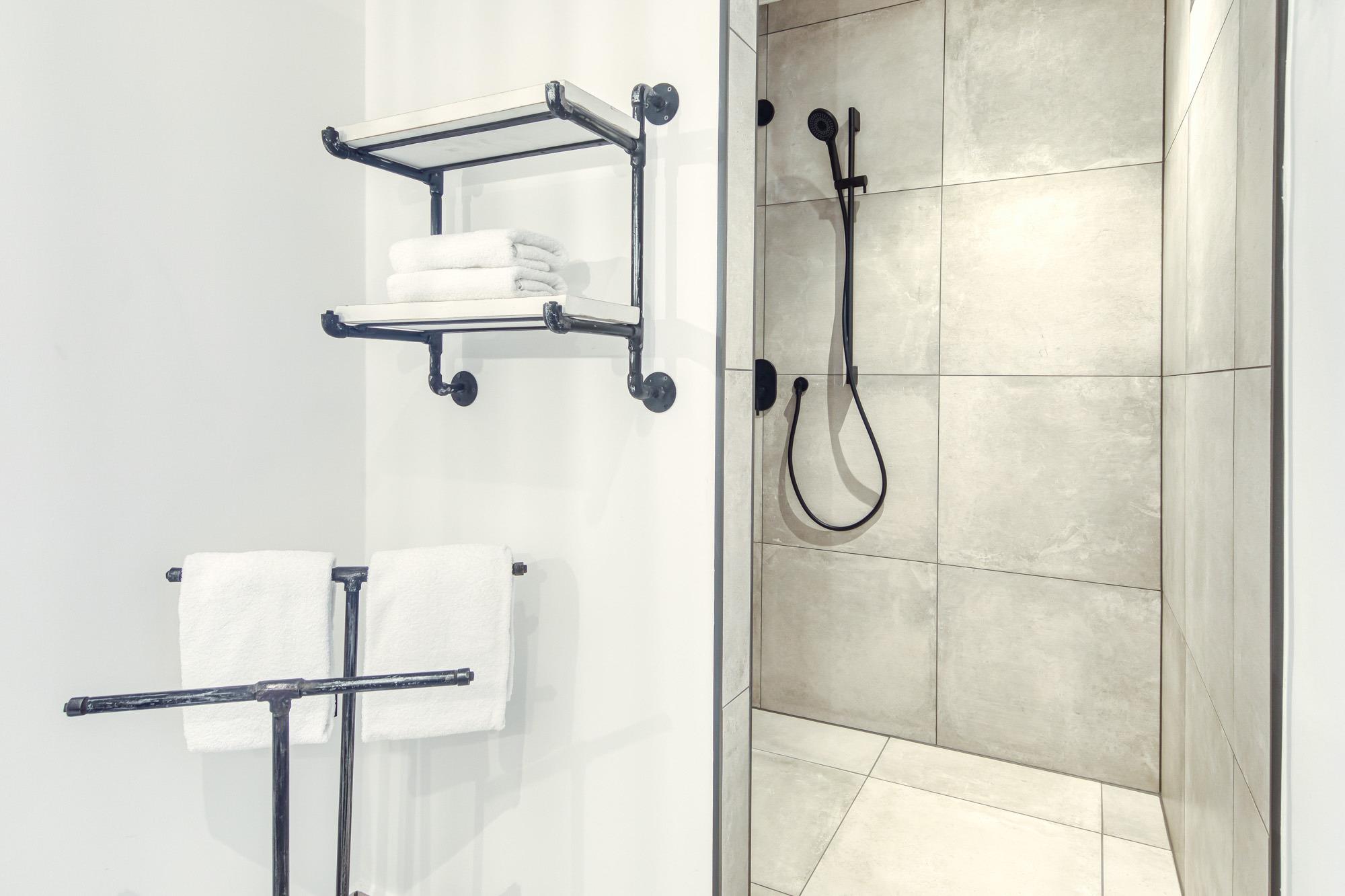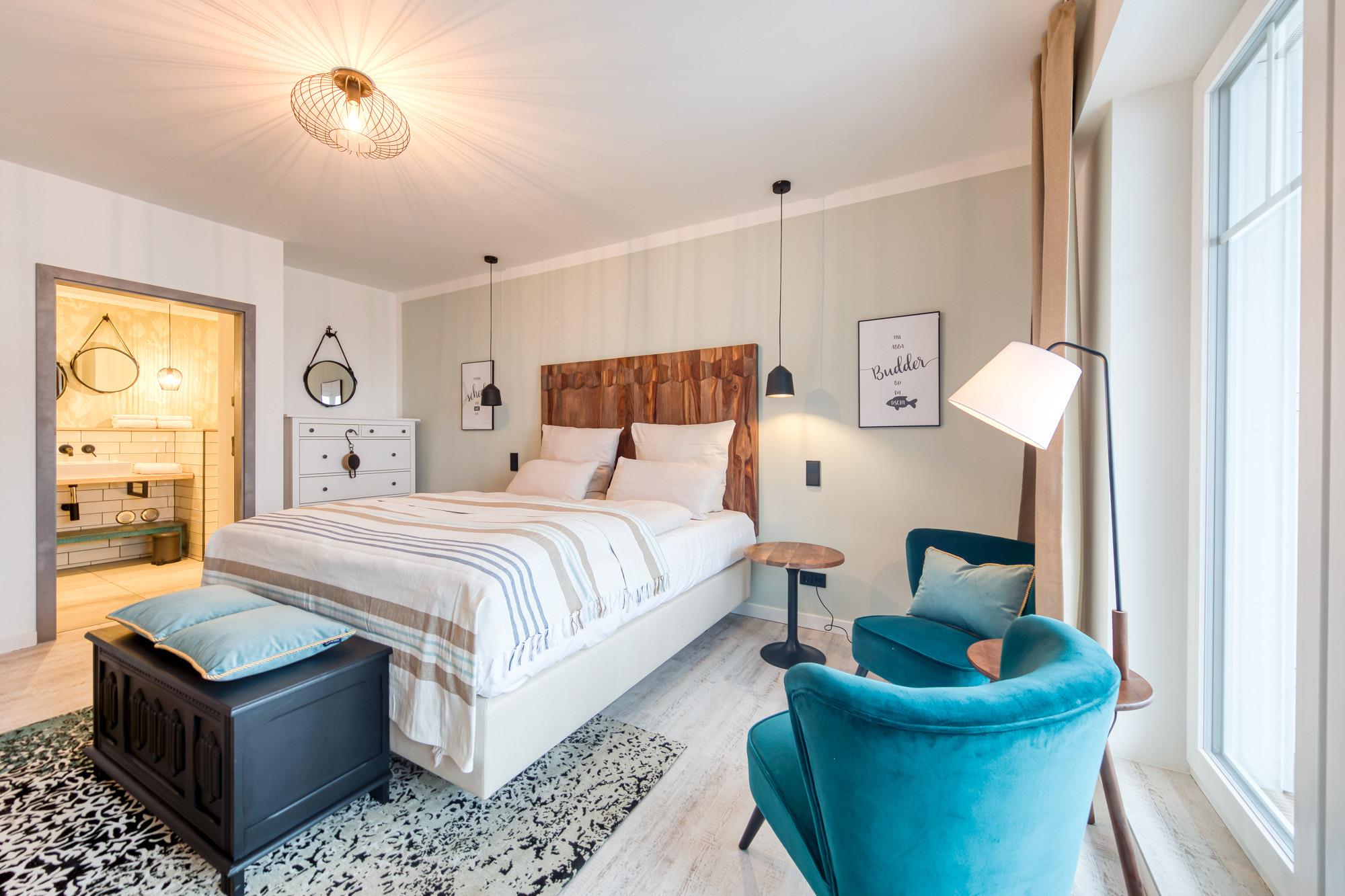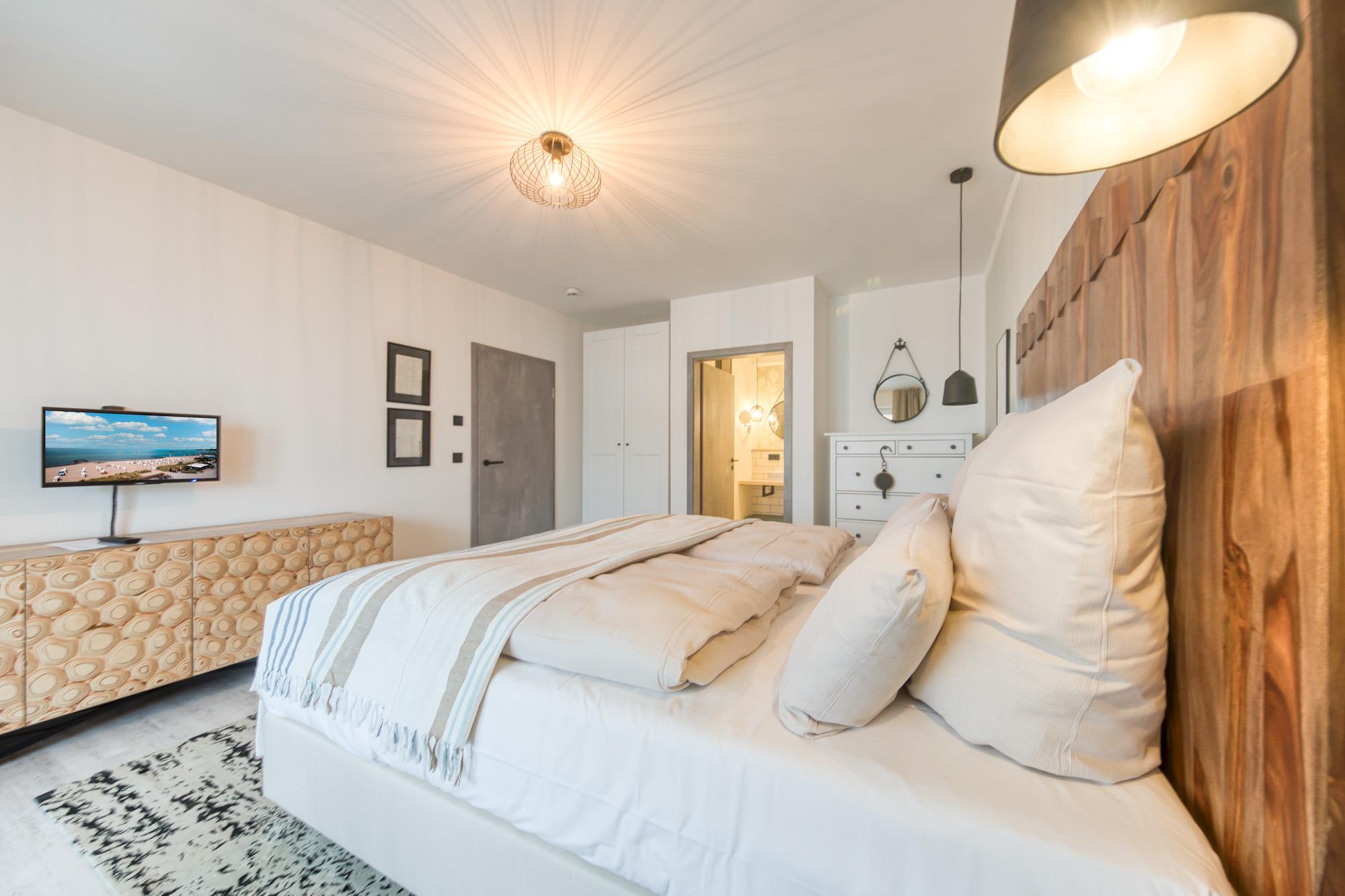 Beide Schlafzimmer sind mit Boxspring-Doppelbetten (1 x 180 cm x 200 cm) und einem Flachbildfernseher ausgestattet. Die beiden hellen und modernen Badezimmer mit bodengleicher Dusche, WC und Fön befinden sich direkt neben den Schlafzimmern.