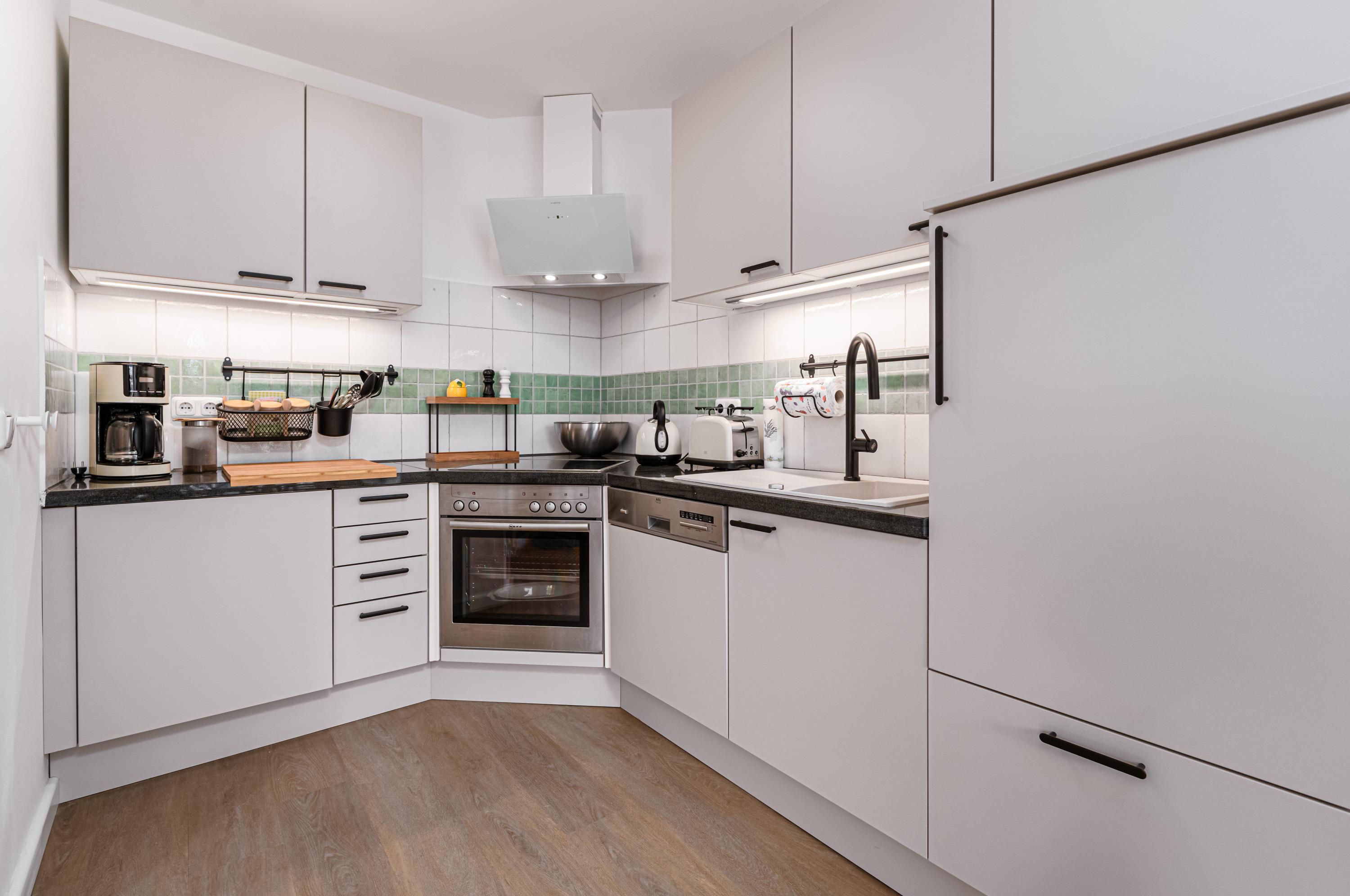 Die integrierte moderne Einbauküche ist mit einem Geschirrspüler gut ausgestattet. Hier macht das gemeinsame Kochen besonders viel Spaß. Sollten Sie die mitgebrachte Urlaubskleidung auffrischen wollen, steht hier auch eine Waschmaschine zur Verfügung.
