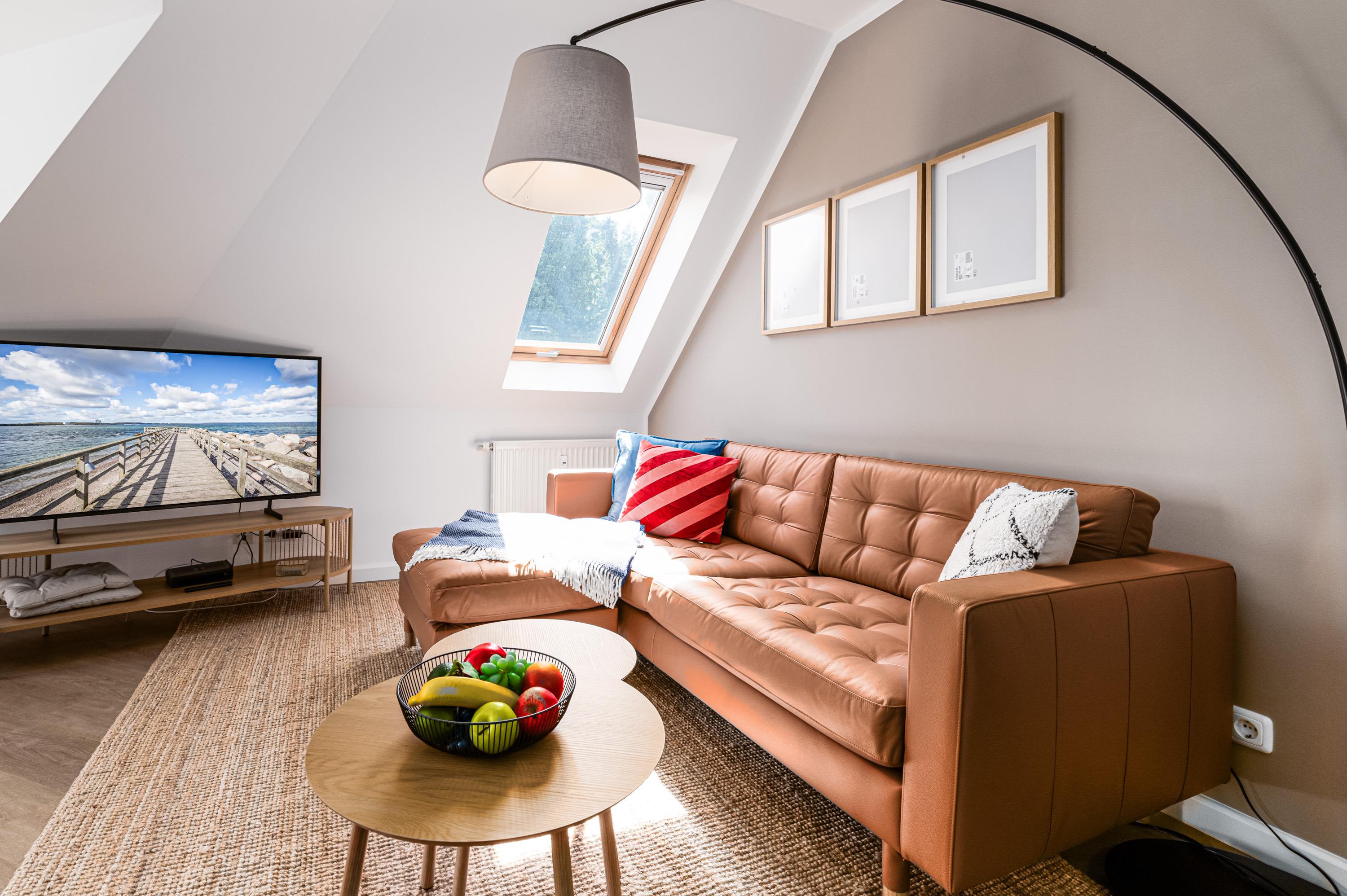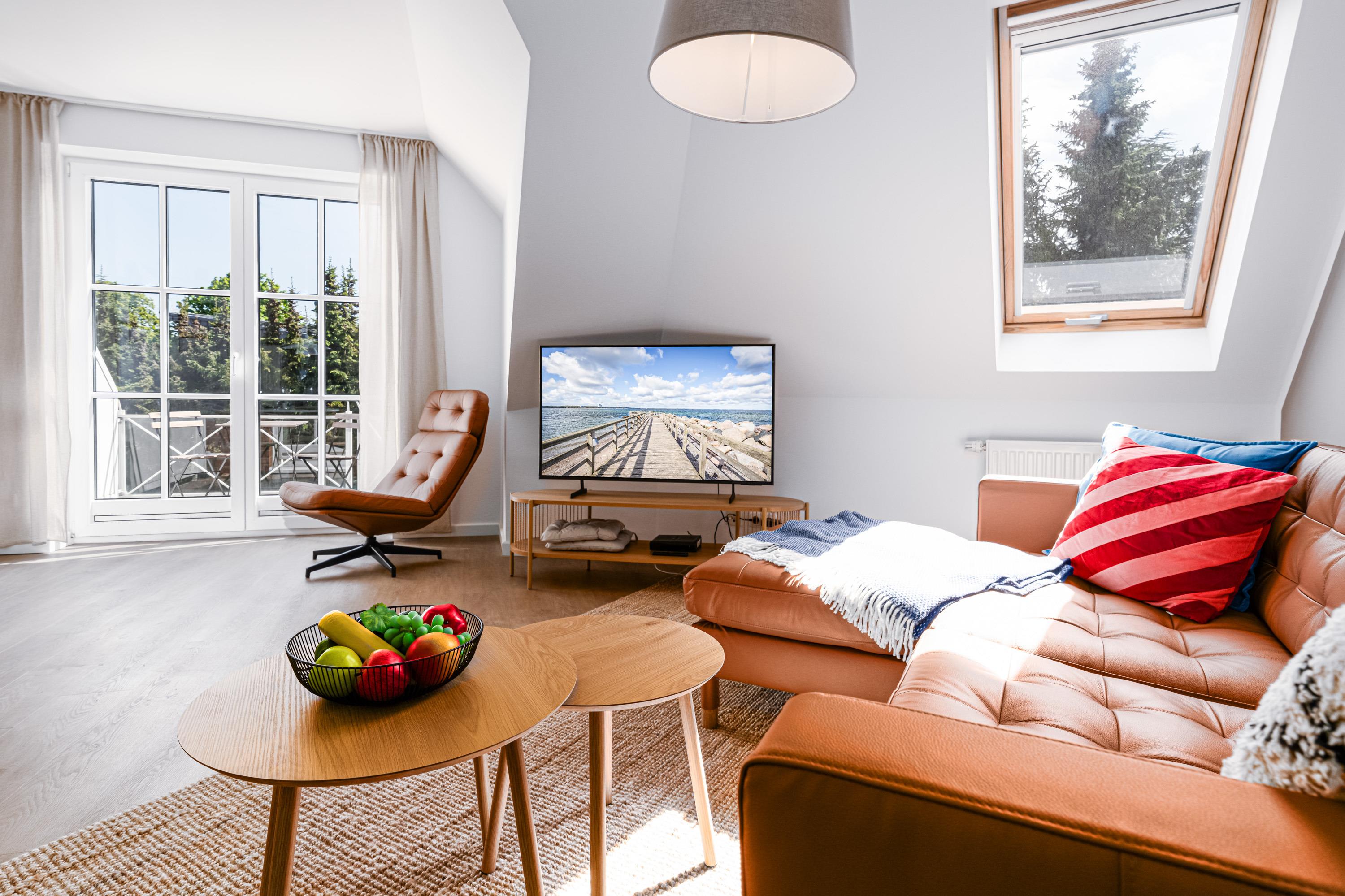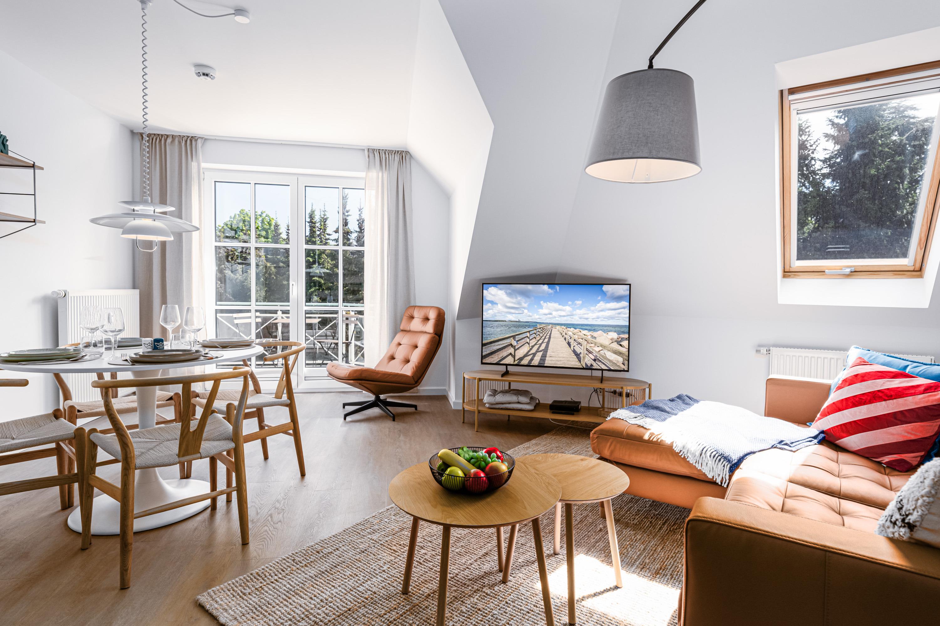 Das Wohnzimmer verfügt über eine gemütliche Couchgarnitur mit Kabel-TV und einem großzügigen Essbereich. Hier haben Sie auch Zutritt auf den möblierten Balkon, auf dem Sie bei gesunder Meeresbrise Ihren Urlaubstag genießen.