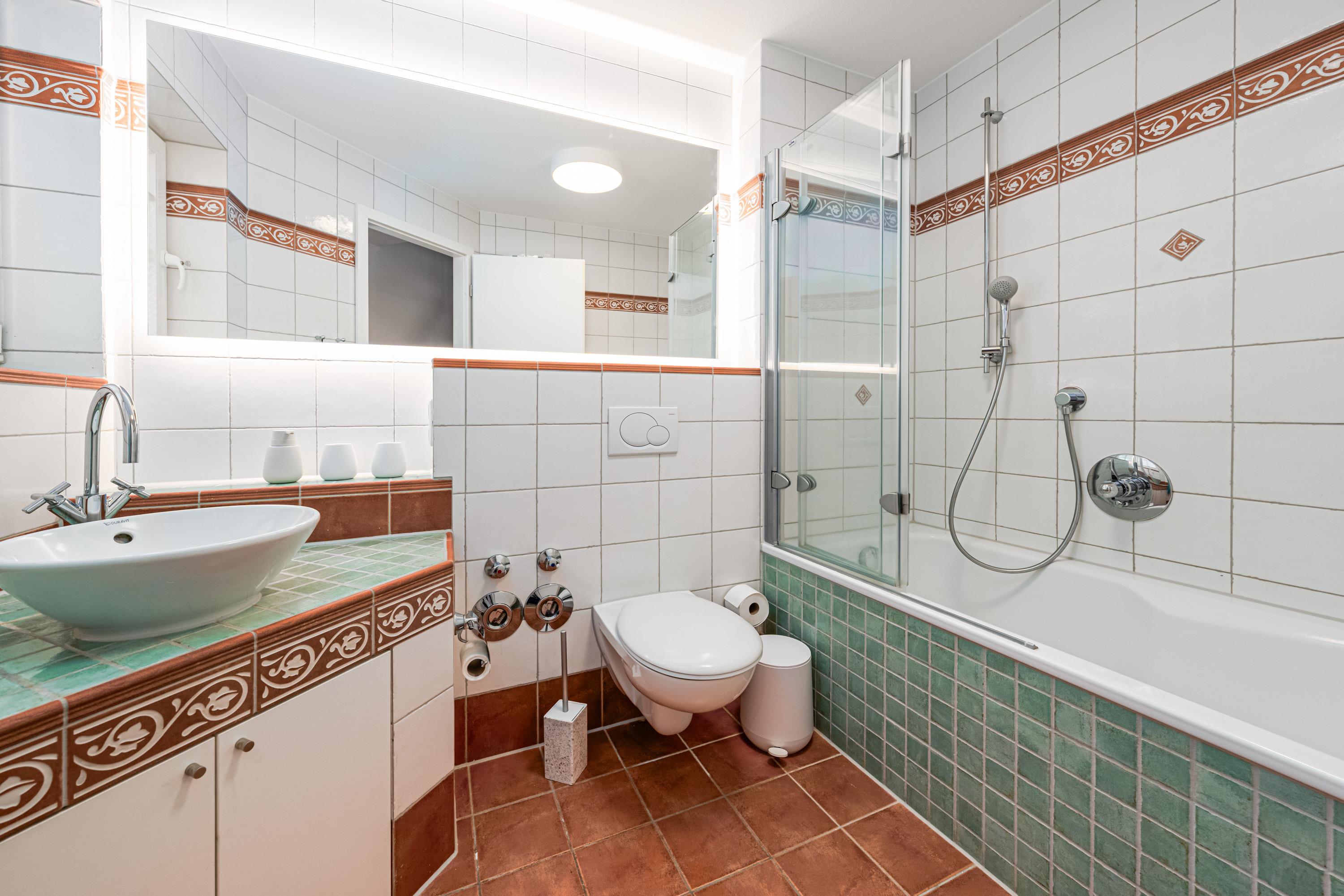 Das Badezimmer ist mit einer Badewanne, WC und Föhn eingerichtet. Hier erfrischen Sie sich nach einem ausgiebigem Urlaubstag am Strand.
