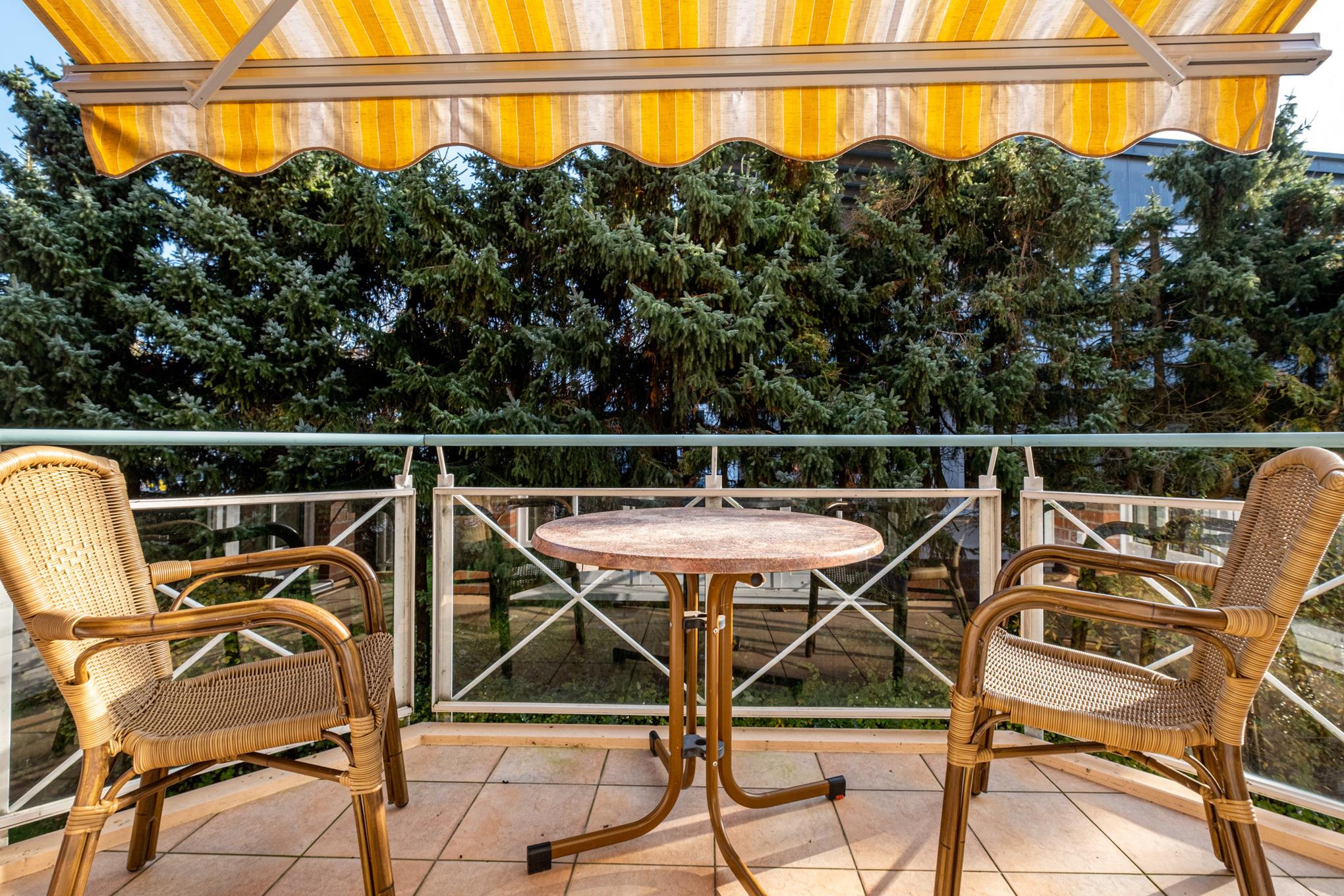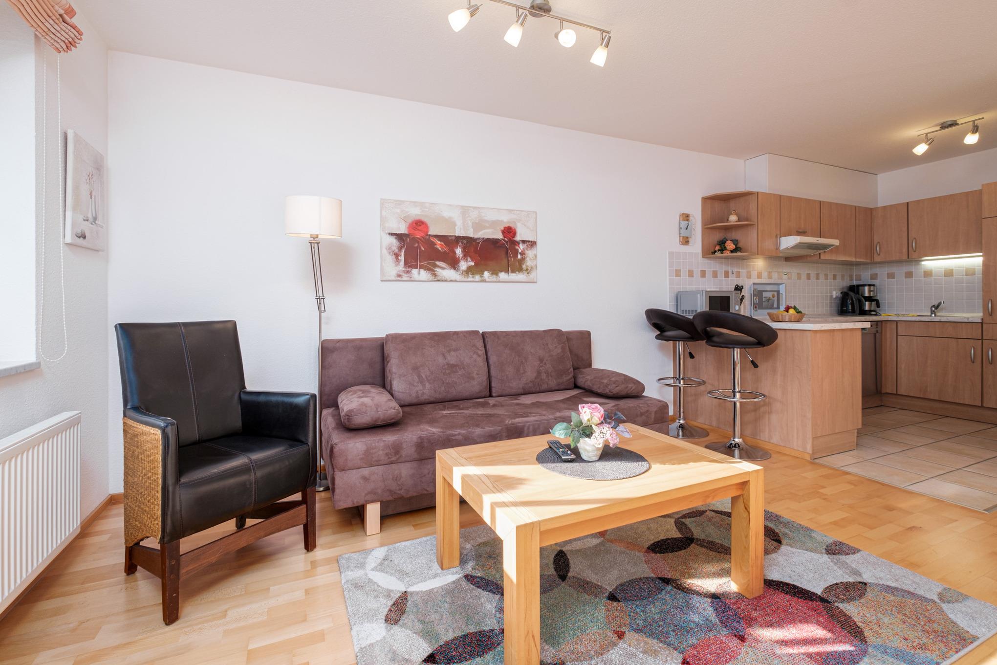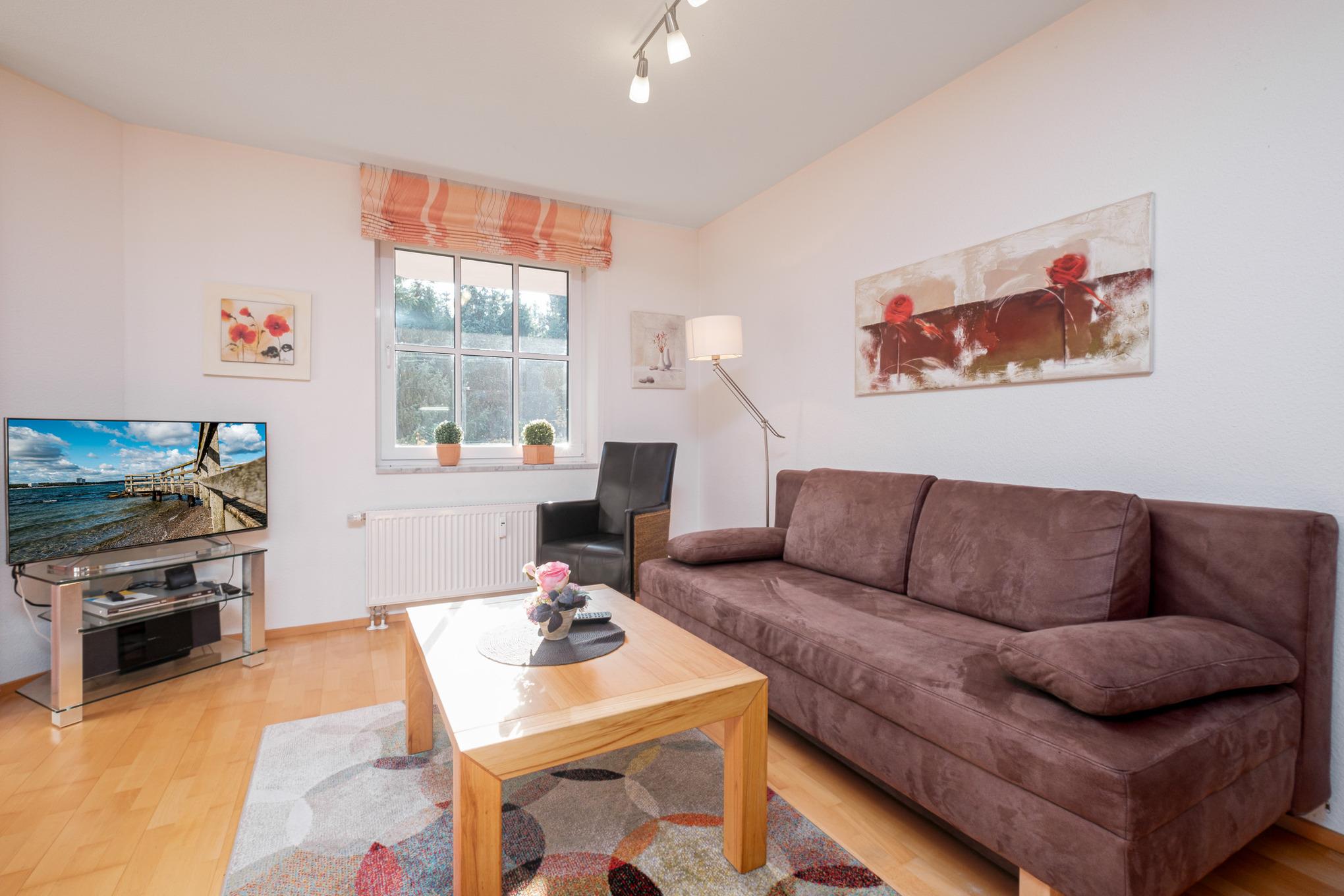 Im Wohnraum befindet sich eine bequeme Schlafcouch (140 cm x 200 cm) mit Kabel-TV, DVD-Player und HiFi-Anlage sowie eine Essecke und der Zugang zum nach Osten ausgerichteten Balkon mit Markise.