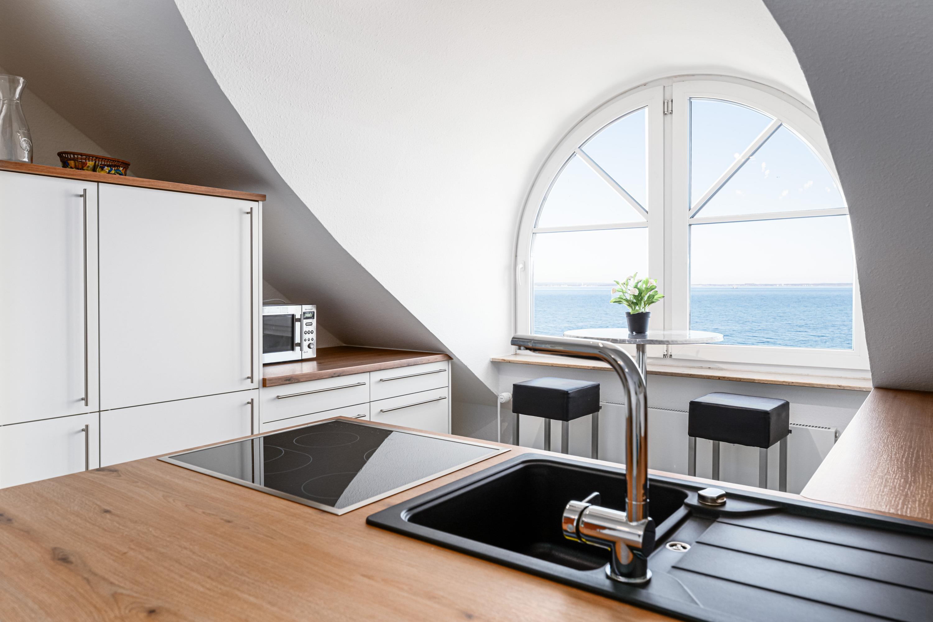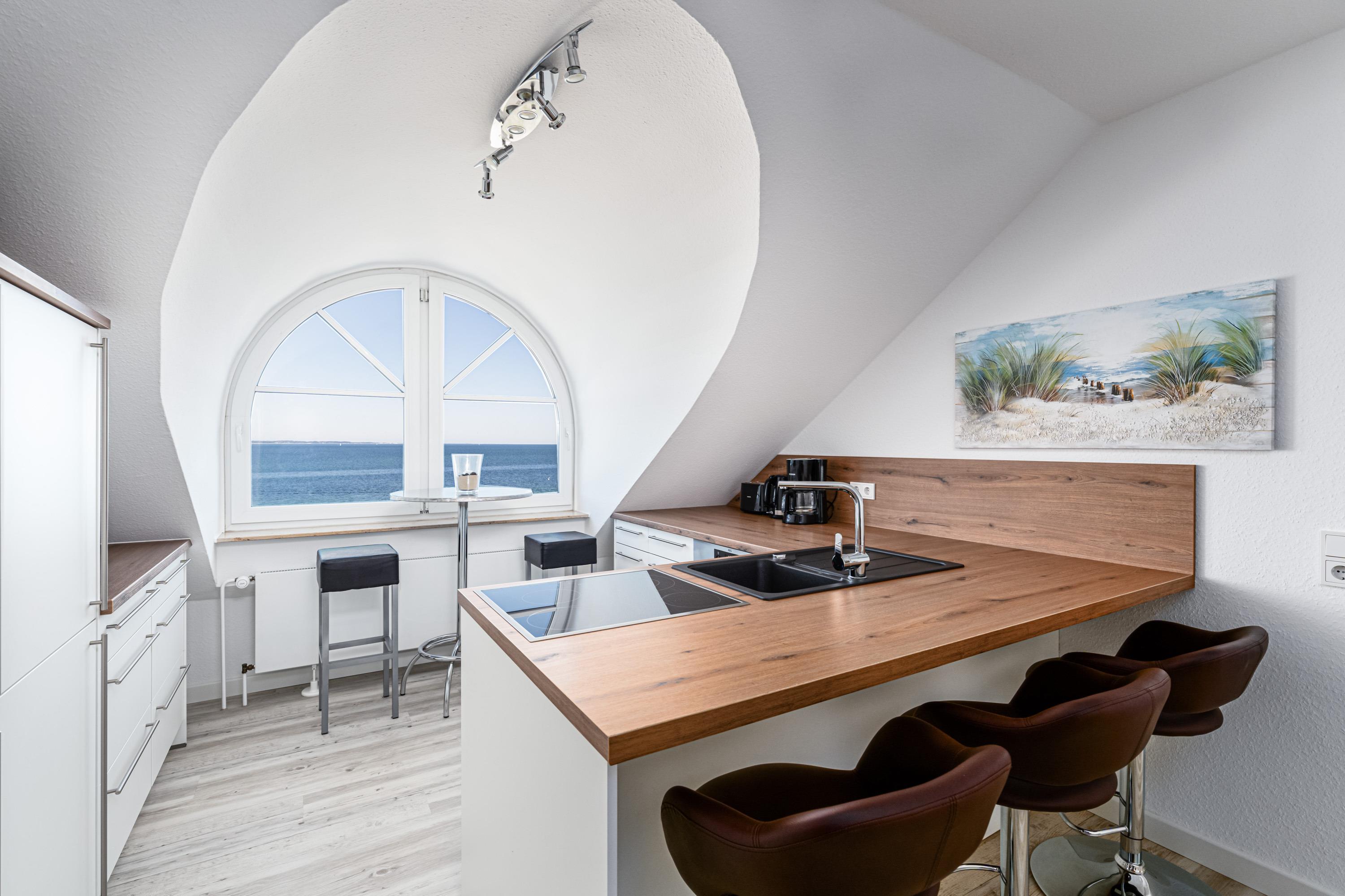 Die Küche verfügt über einen zentralen Herd mit großer Arbeitsplatte im Barstil mit Barhockern sowie Geschirrspüler und Mikrowelle. Der Stehtisch mit Hockern am Fenster bietet einen einmaligen Ausblick auf das Meer.
