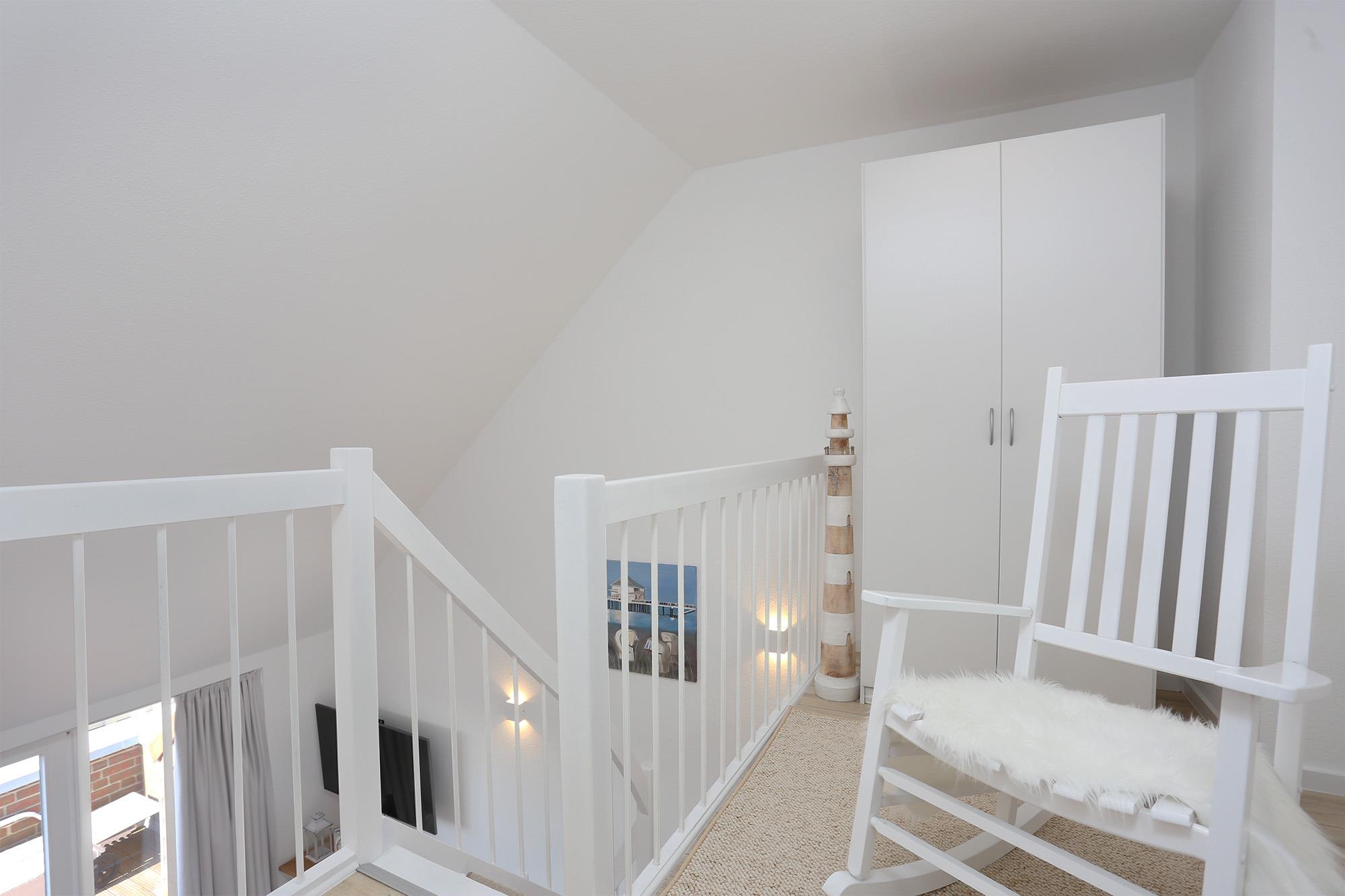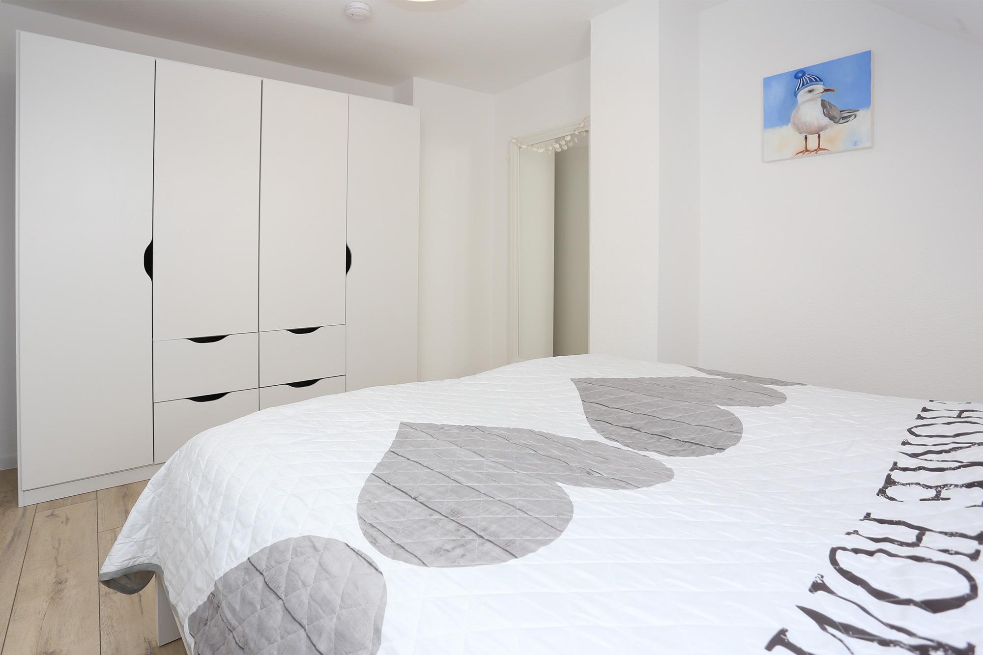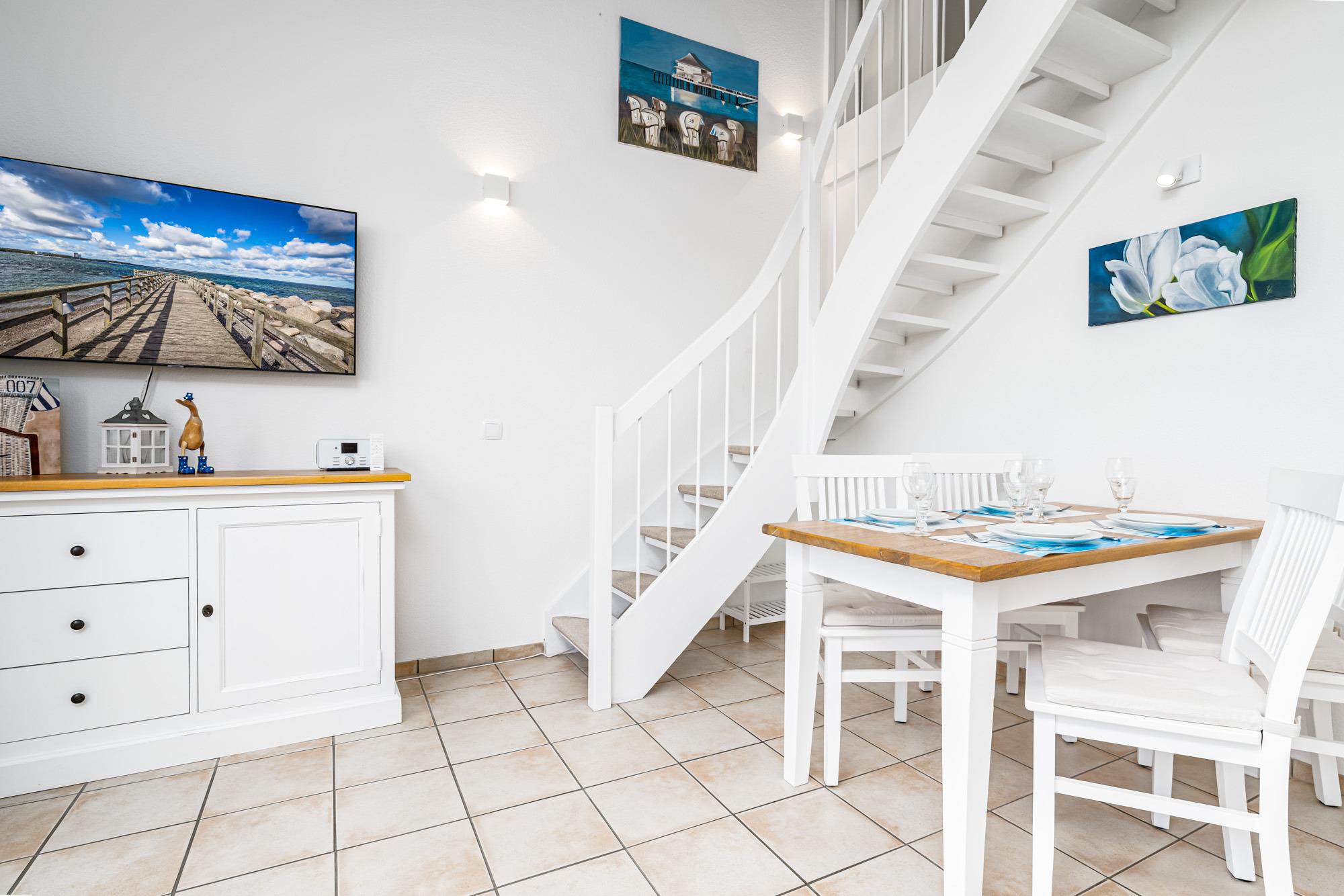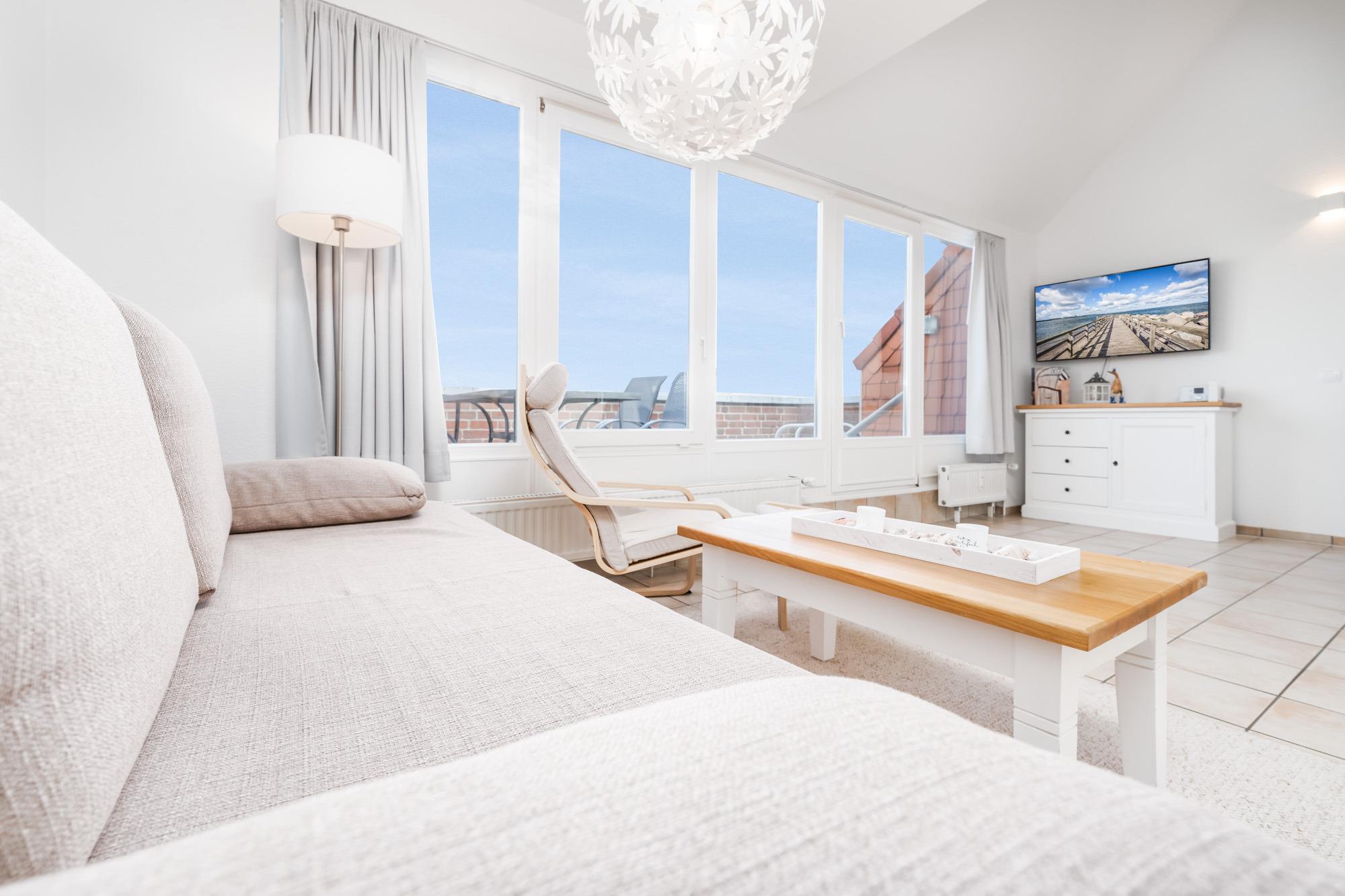 Die komfortabel ausgestattete und in 2022 vollständig renovierte Maisonette-Ferienwohnung "Strandglück" im 3. OG bietet auf 50m² Platz für bis zu 4 Personen. Im Wohnzimmer finden Sie eine bequeme Schlafcouch, einen 50 Zoll Kabel-TV mit Internetzugang und eine Essecke vor.