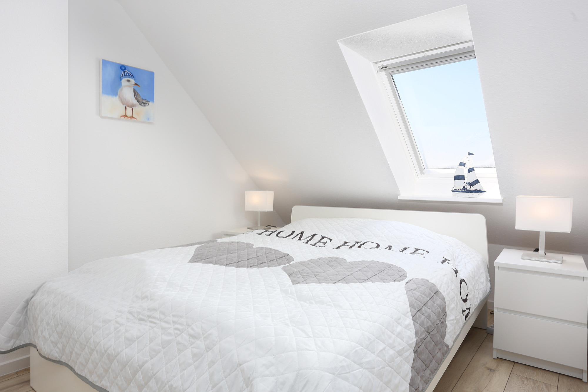 Das Schlafzimmer mit Doppelbett befindet sich auf der oberen Etage der Ferienwohnung.