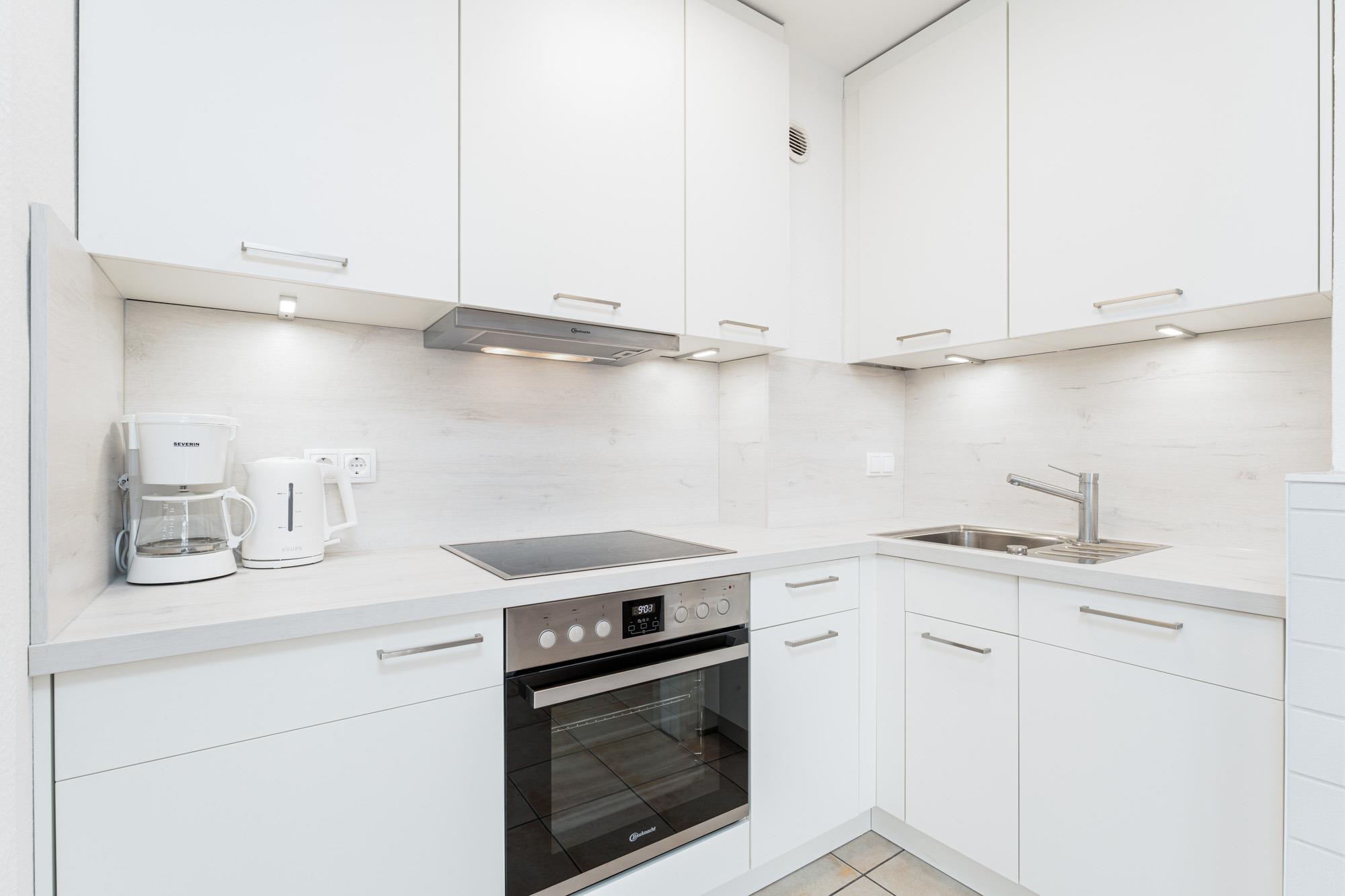 In der integrierten, gut ausgestatteten Einbauküche mit Geschirrspüler und Backofen lassen sich leckere Gerichte zubereiten.