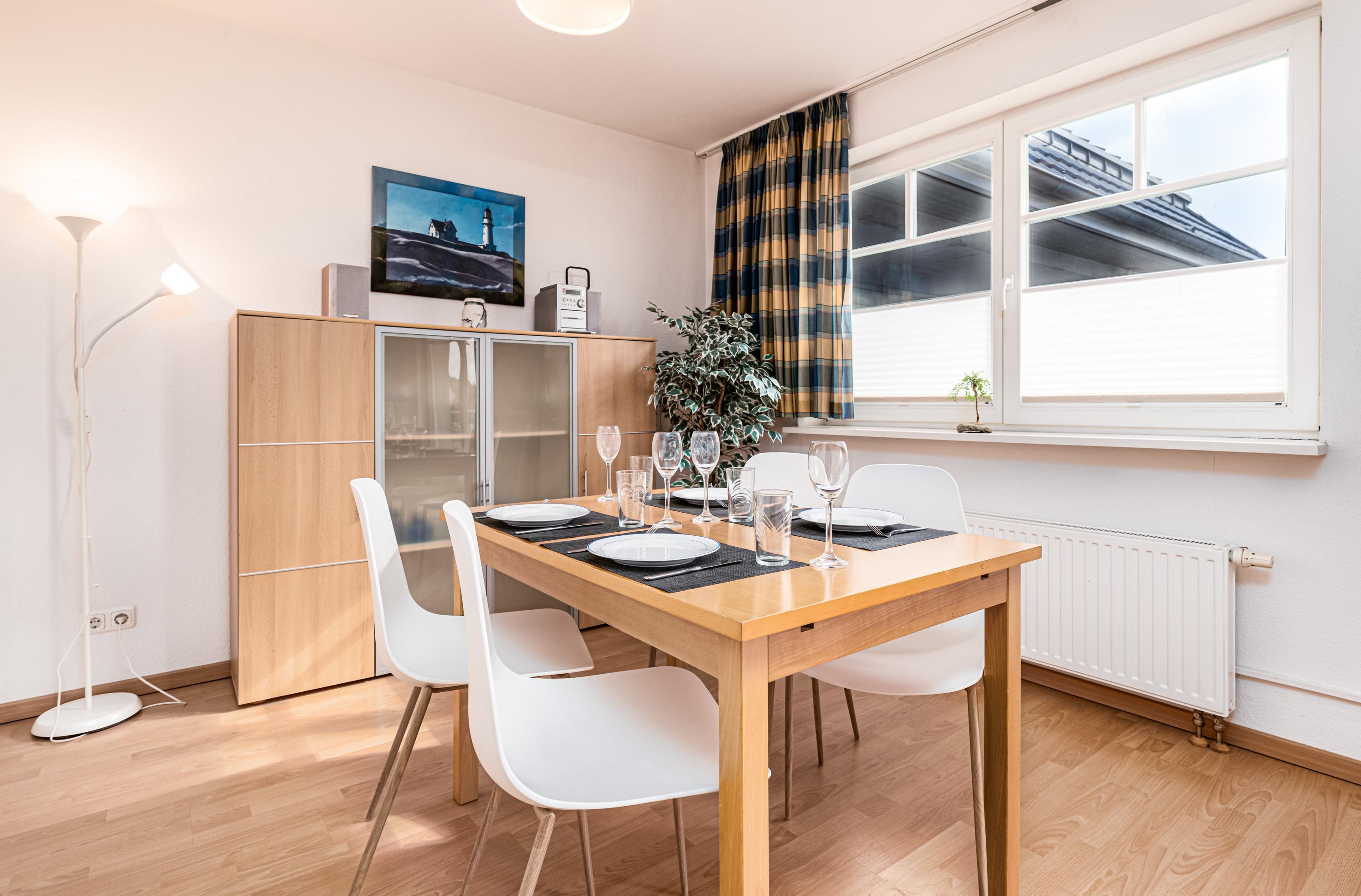 Vom Flur aus erreichen Sie das geschmackvoll ausgestattete Wohnzimmer. Hier befindet sich eine Schlafcouch (2 x 80 cm x 200 cm), ein Kabel-TV, eine Stereo-Anlage sowie die Essecke und die integrierte Einbauküche mit Geschirrspüler und Mikrowelle.