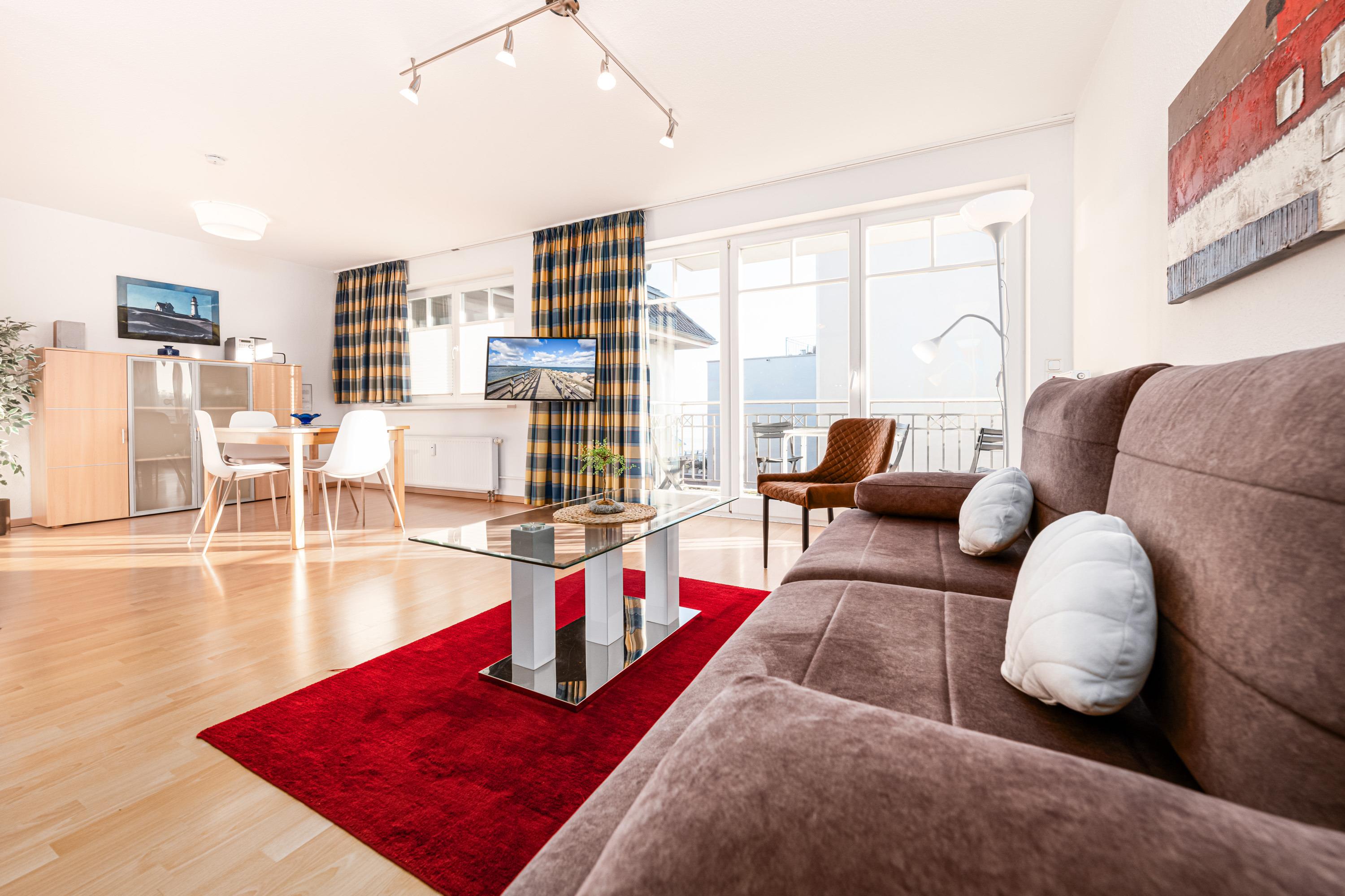 Hell und modern eingerichtet, präsentiert sich das 62m² große für bis zu 4 Personen 2-Zimmer Appartement Nr. A19 im 2. OG mit Blick durch die Häuserflucht auf den Strand und die Ostsee.