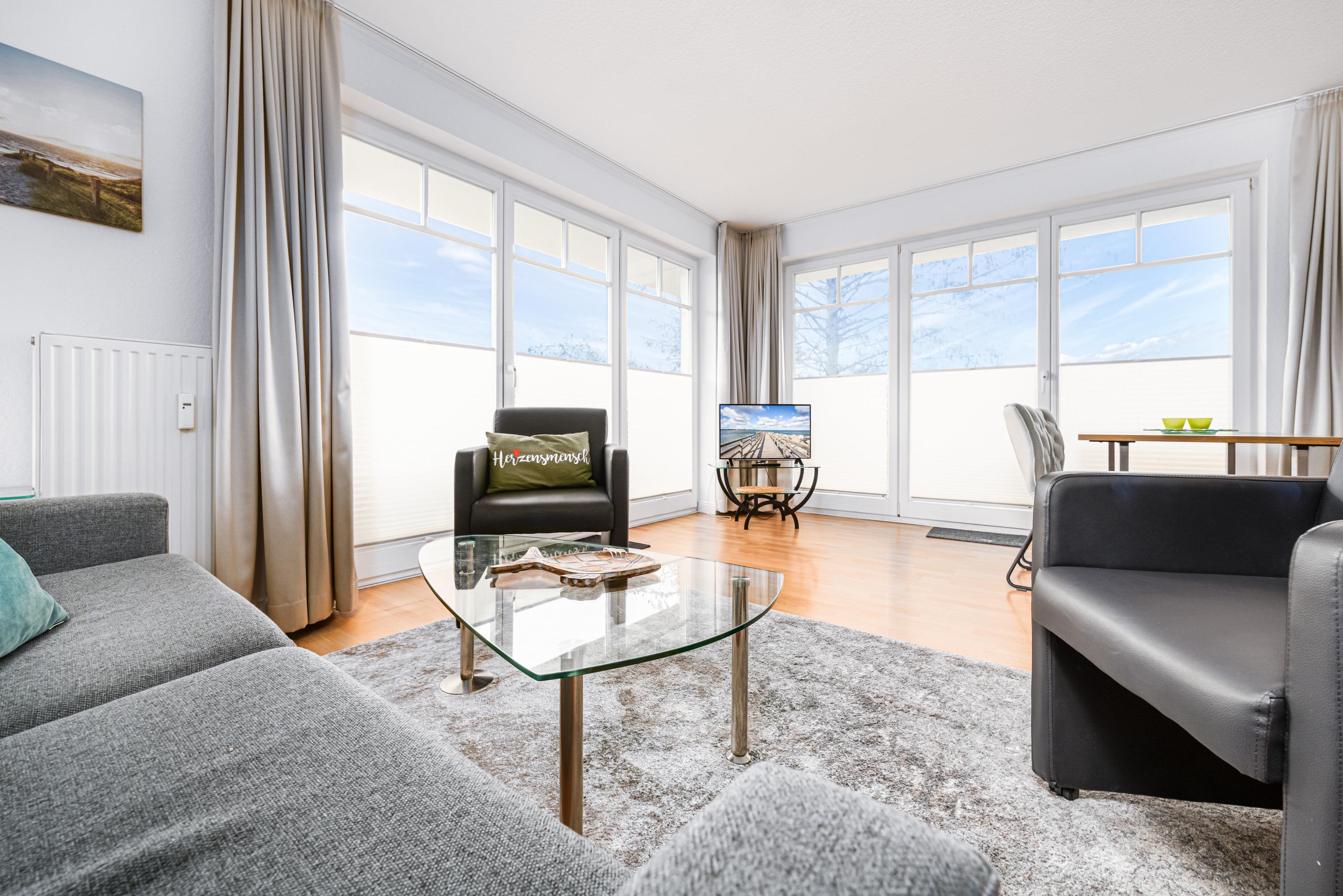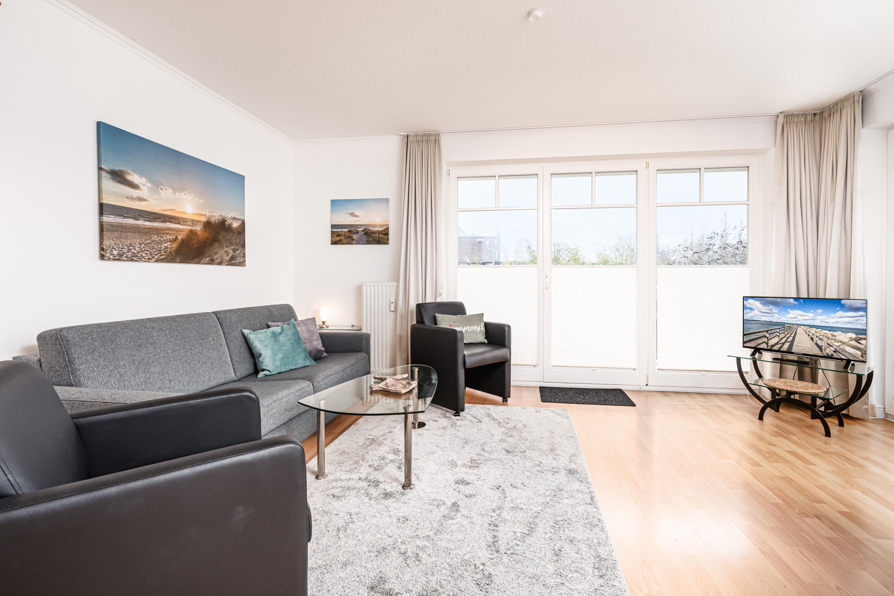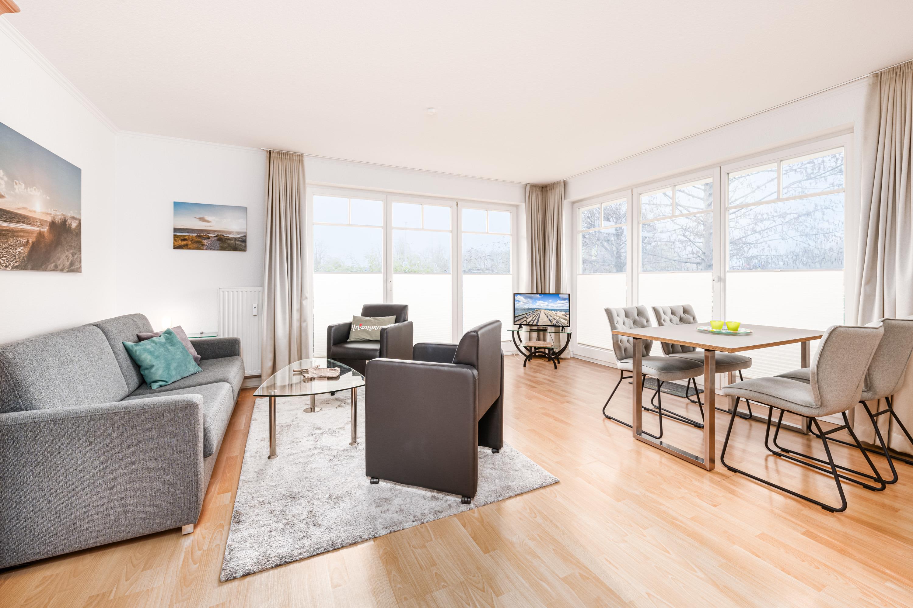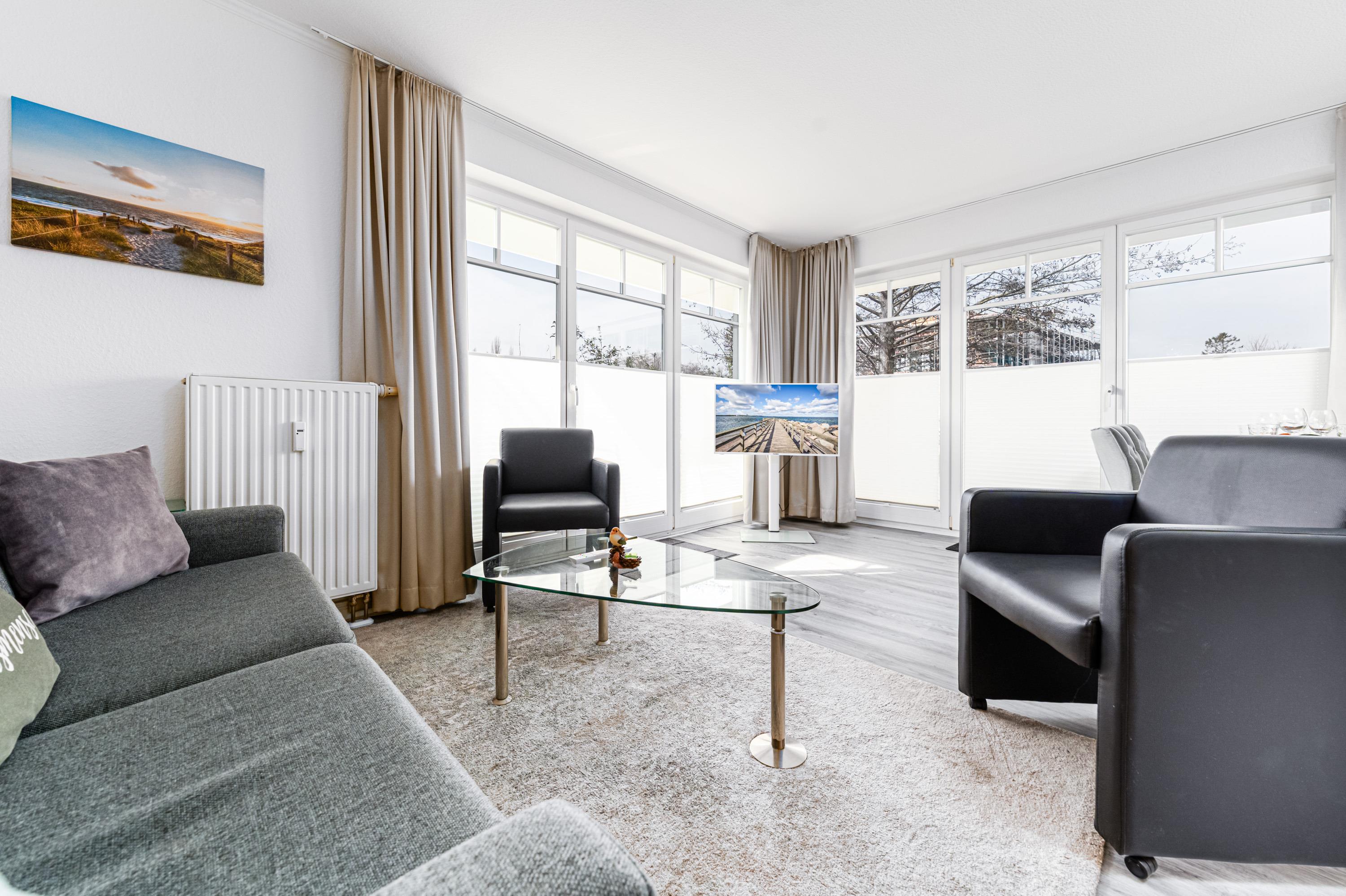 Im lichtdurchfluteten Wohnraum erholen Sie sich auf der bequemen Schlafcouch mit Kabel-TV und HiFi-Anlage vom Alltag.