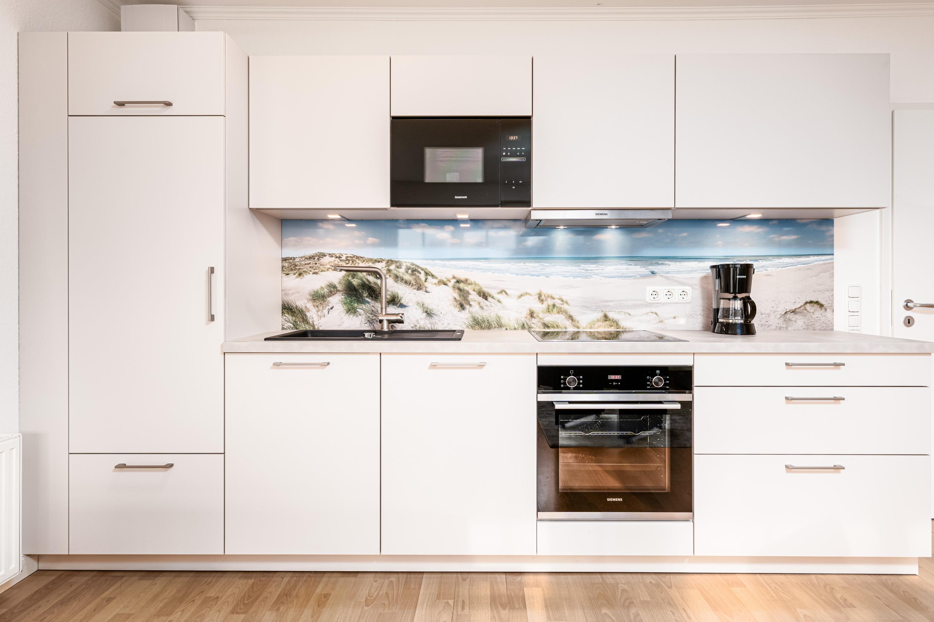 In der integrierten Einbauküche mit Ceranfeld, Backofen, Geschirrspüler und Mikrowelle bereiten Sie schmackhafte Speisen vor, die Sie gemeinsam im Essbereich zu sich nehmen können.