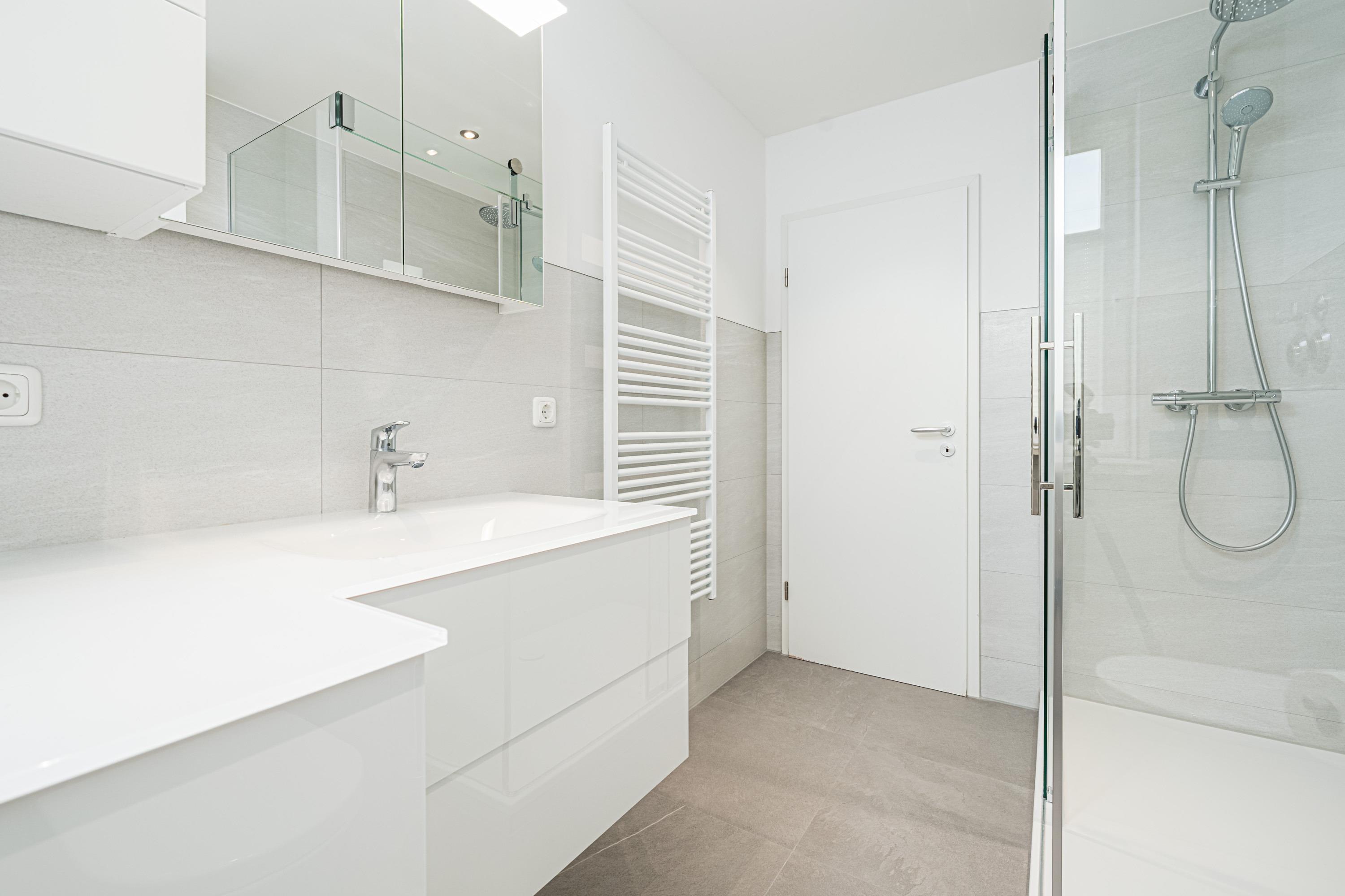 Im hellen Badezimmer können Sie sich bei einem Bad in der Badewanne entspannen. Des Weiteren verfügt der Waschraum über ein WC, Fön und einen Handtuchwärmer.