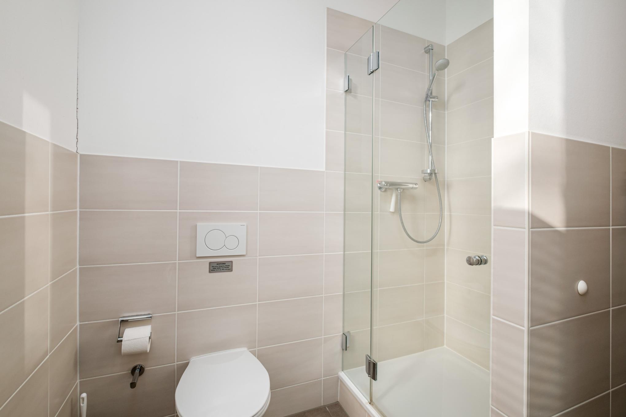 Das Badezimmer verfügt über eine Dusche, WC, einen Fön und Kosmetikspiegel.