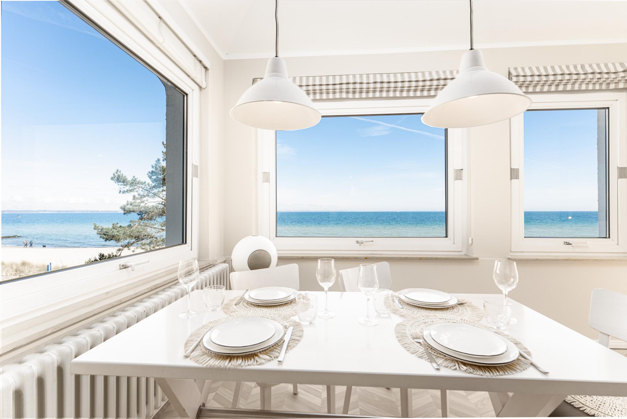 Hell und modern eingerichtet, verfügt das Wohnzimmer für eine bequeme Couchgarnitur mit Flachbild-TV, Blu-Ray-Player und HiFi-Anlage sowie eine integrierte Einbauküche mit Geschirrspüler und Mikrowelle. Von hier aus betreten Sie die Wohnveranda, wo sich ein geräumiger Essbereich befindet und Sie einen traumhaften Meerblick auf die Ostsee genießen können.