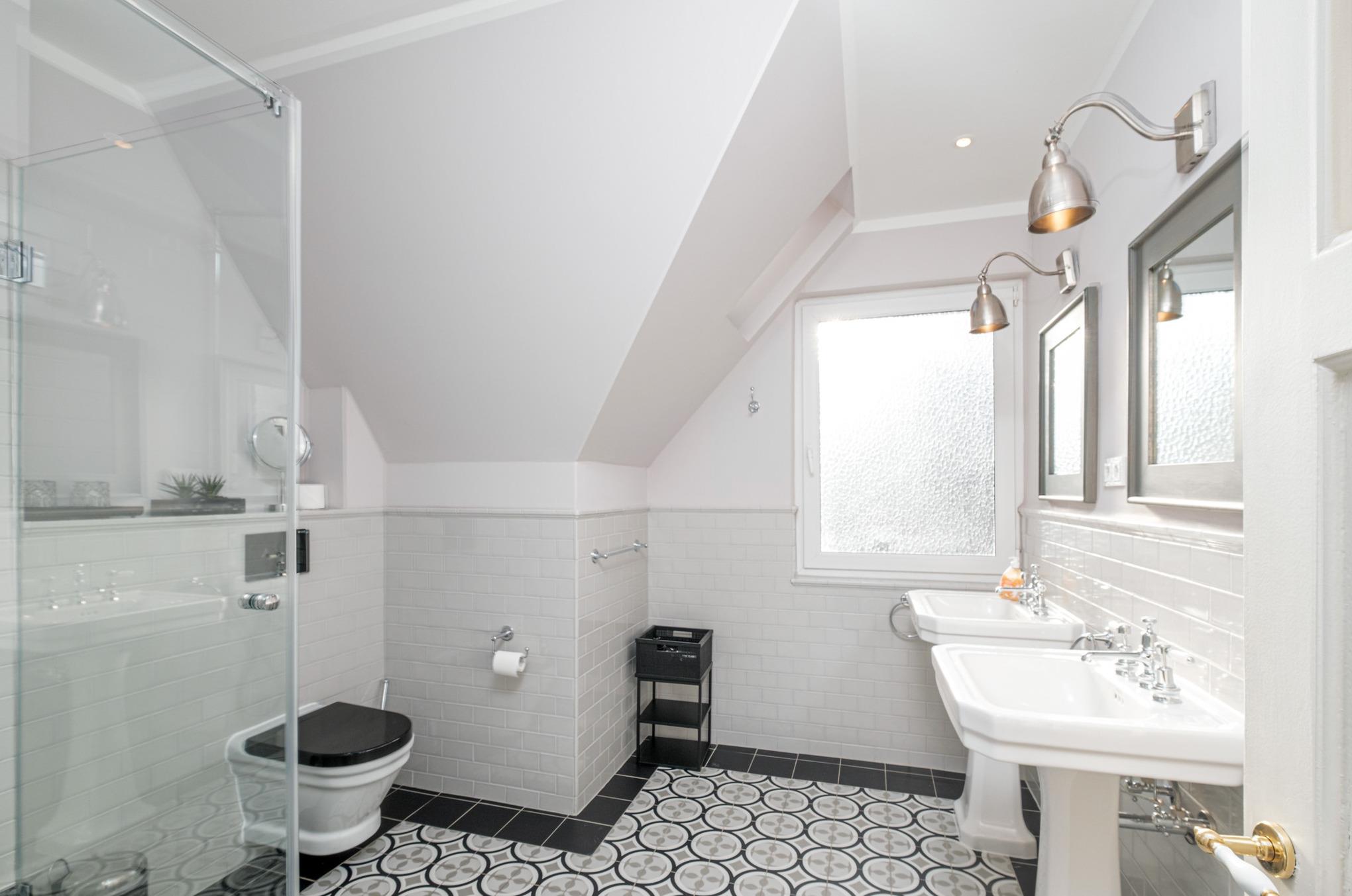 Das große Badezimmer verfügt über eine bodengleiche Dusche, 2 Waschtischen, WC sowie einem Handtuchwärmer. Hier erfrischen Sie sich nach einem erholsamen Tag an der Ostsee.