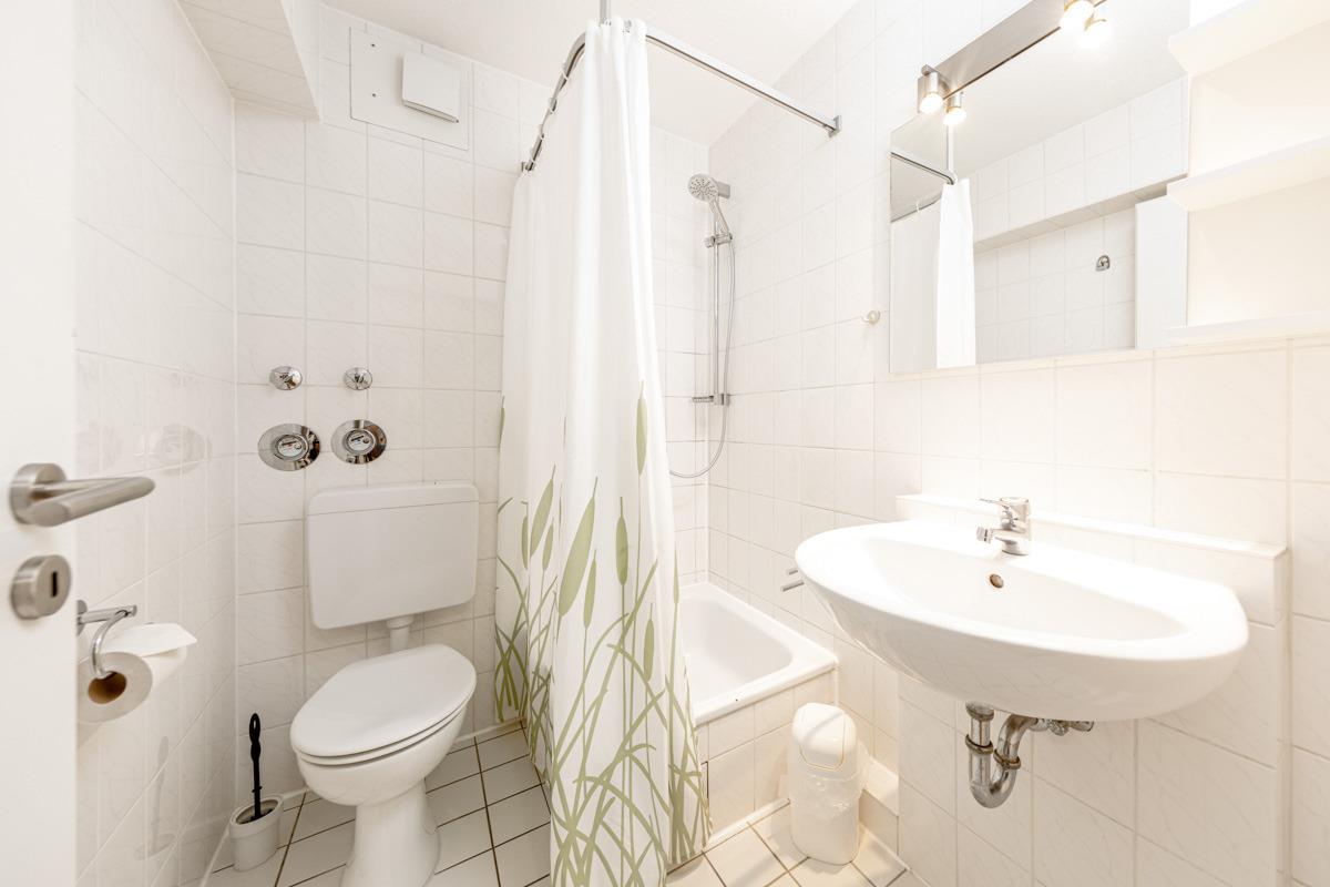 Das Badezimmer ist hell gefliest und ist mit einer Dusche, WC und einem Fön eingerichtet. Hier können Sie sich nach einem entspannten Tag am Strand erfrischen.