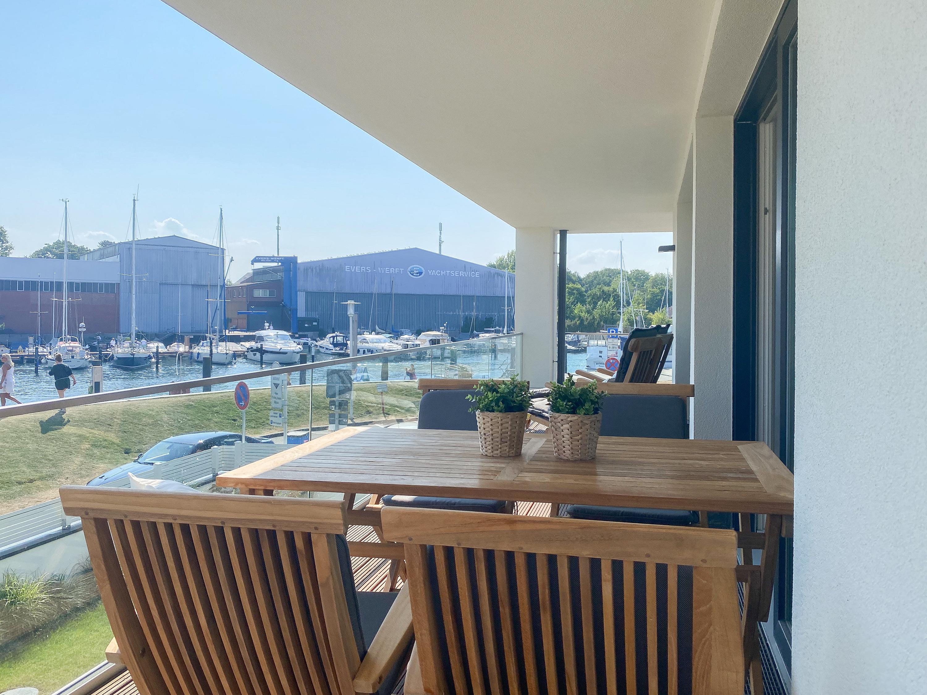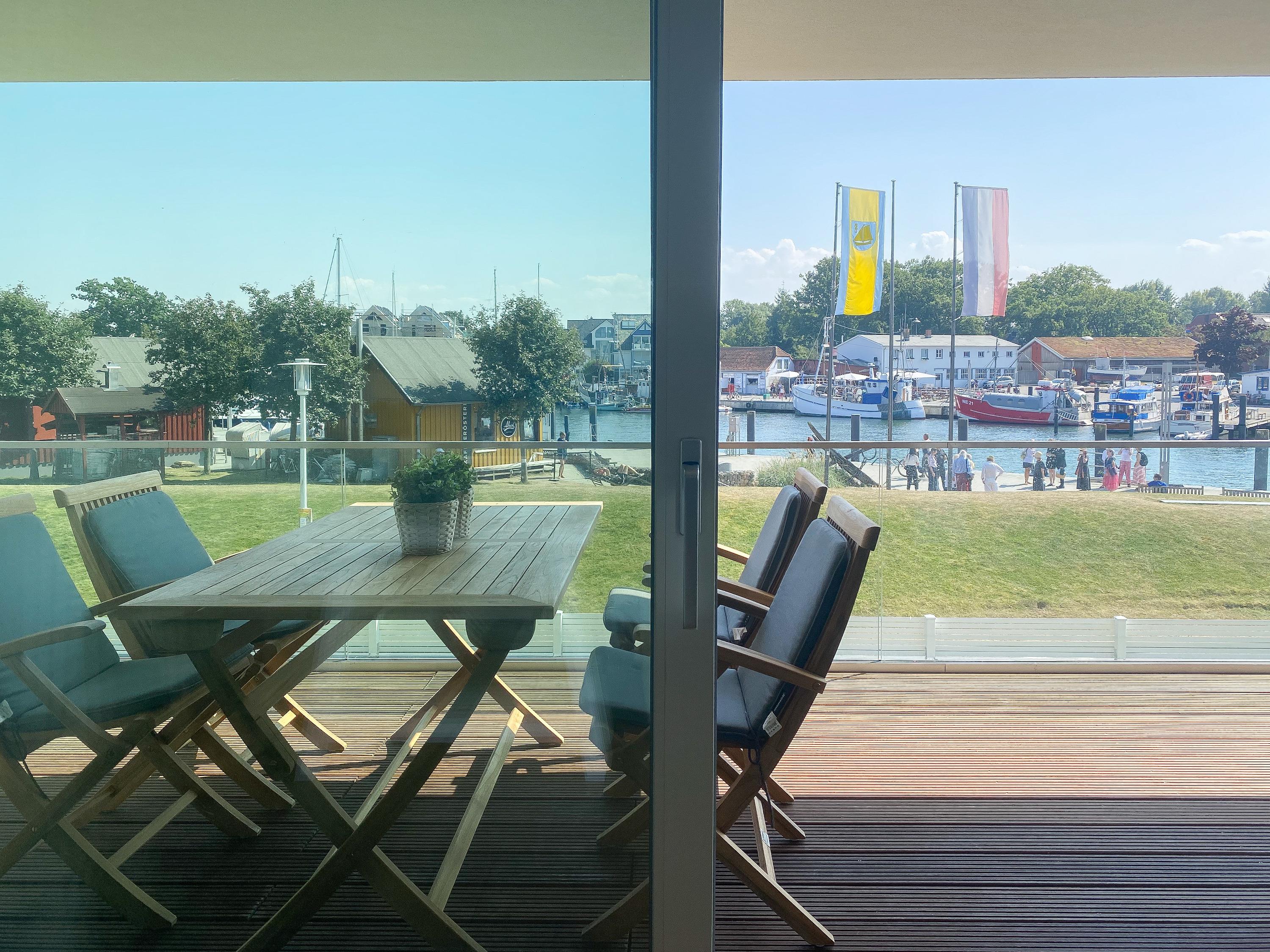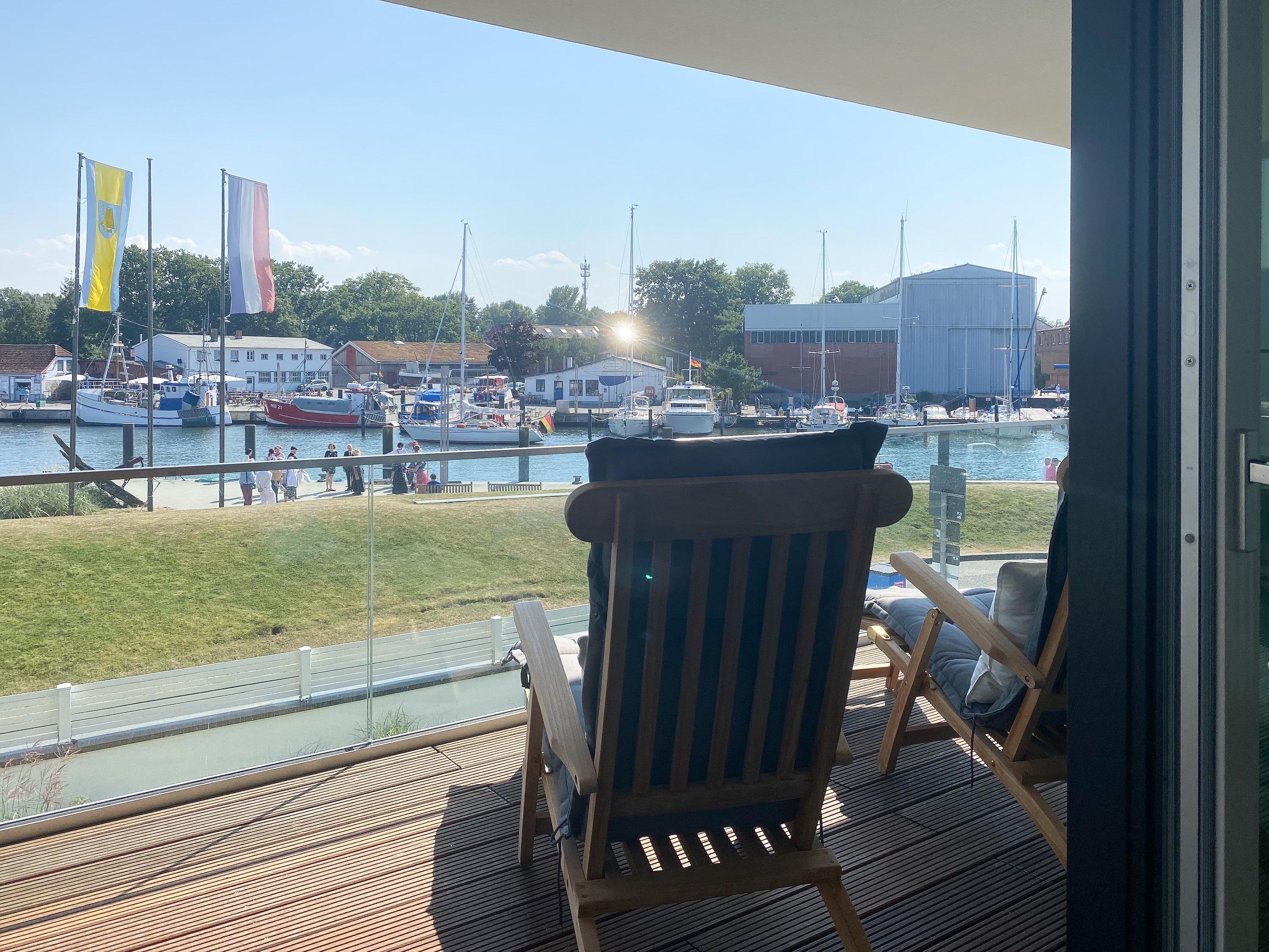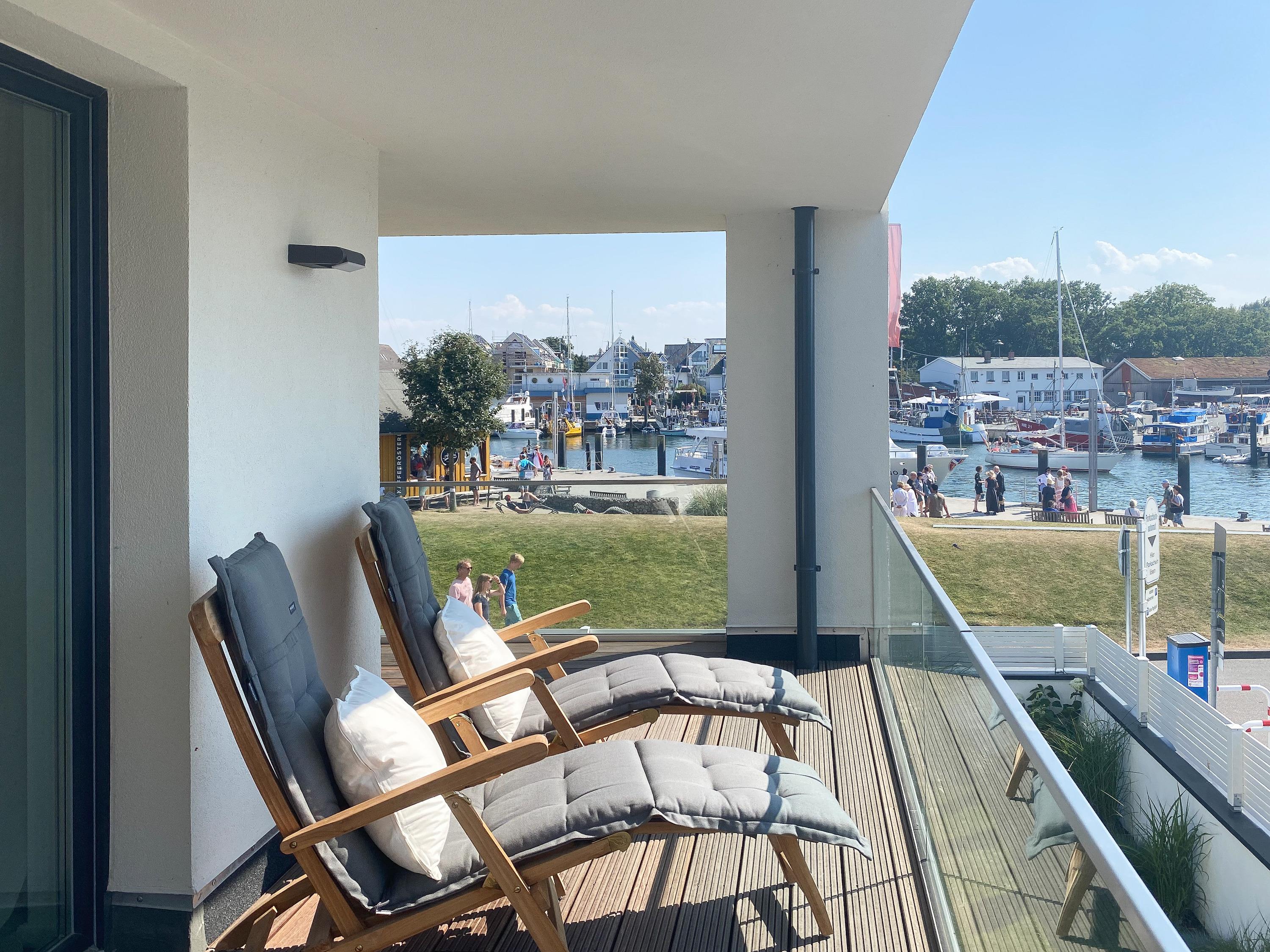 Diese einzigartige Ferienwohnung liegt im 1. Obergeschoss eines modernen Neubaus mit nur 3 Wohneinheiten und bietet auf 100 qm Wohnfläche mit 2 Schlafzimmern und 2 separaten Bädern jeglichen Komfort für 4 Personen. Das Herzstück der Wohnung bildet der stilvoll eingerichtete Wohn- und Essbereich mit riesigen Fensterelementen und einem phantastischen Ausblick auf die Ostsee und die ein- und ausfahrenden Schiffe vom Fischkutter bis zur Motoryacht.[nbsp] Echtholzböden und Fußbodenheizung sorgen für ein angenehmes Raumklima. Der großzügig angelegte Sonnenbalkon ist überdacht und sowohl zum Süden als auch zum Westen ausgerichtet. Genießen Sie die Sonne von früh bis spät, die einzigartige Hafenatmosphäre und beeindruckende Sonnenuntergänge bei einem Glas Wein.