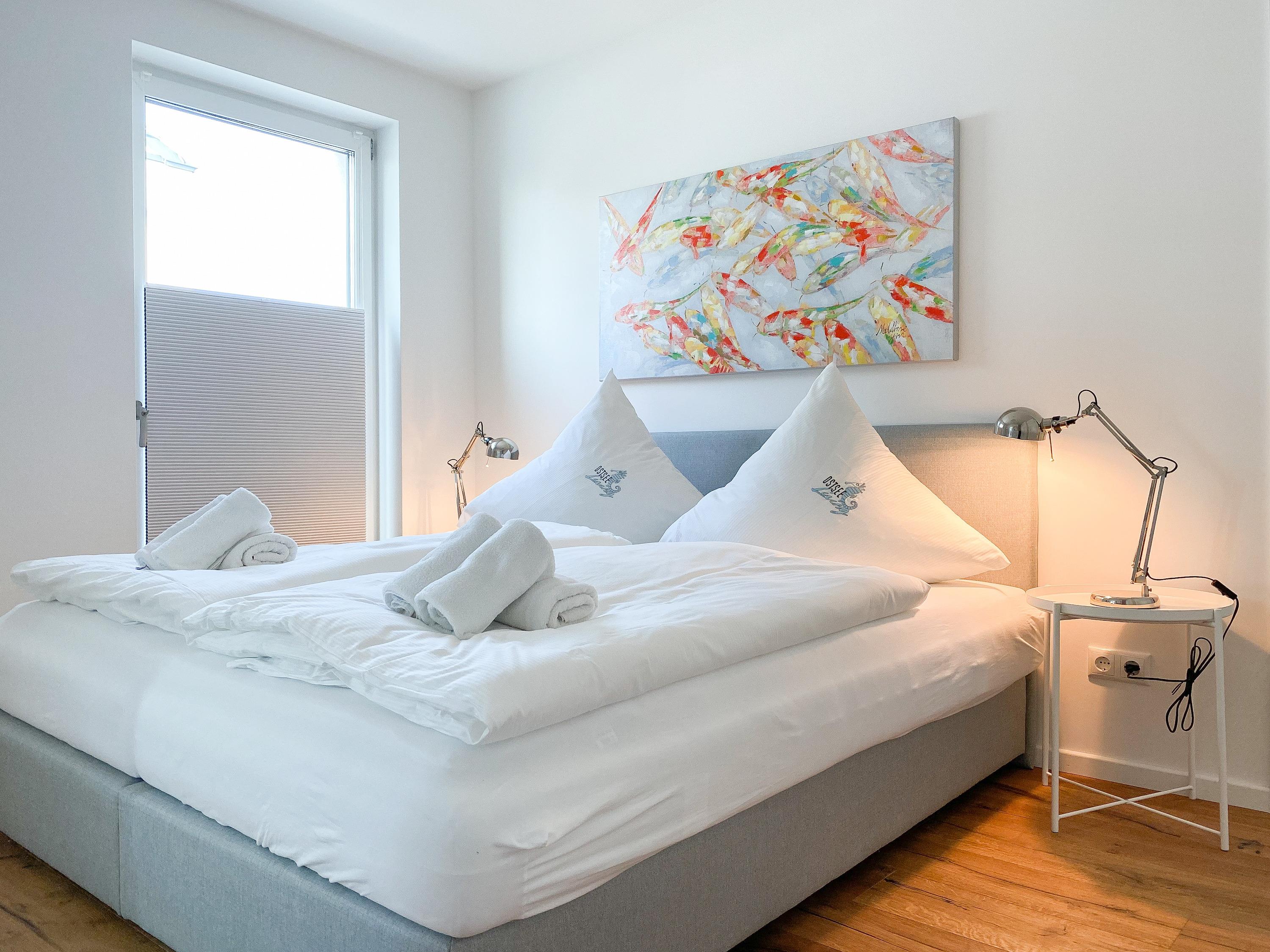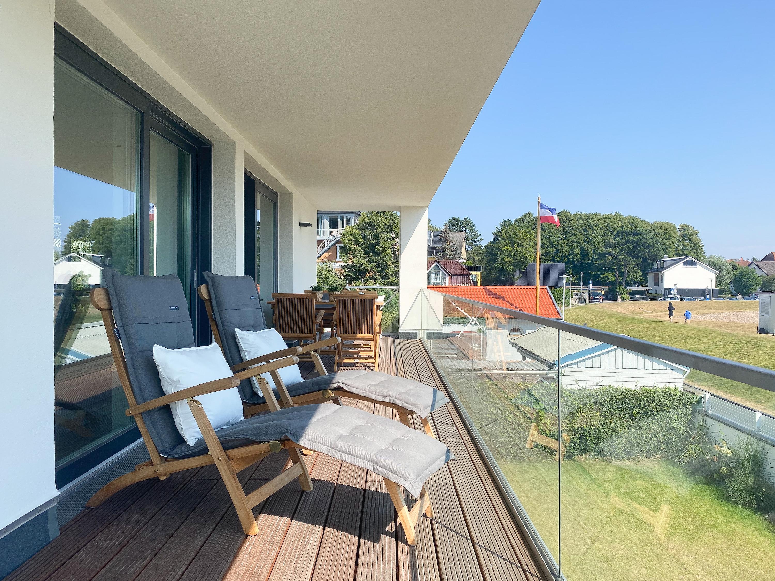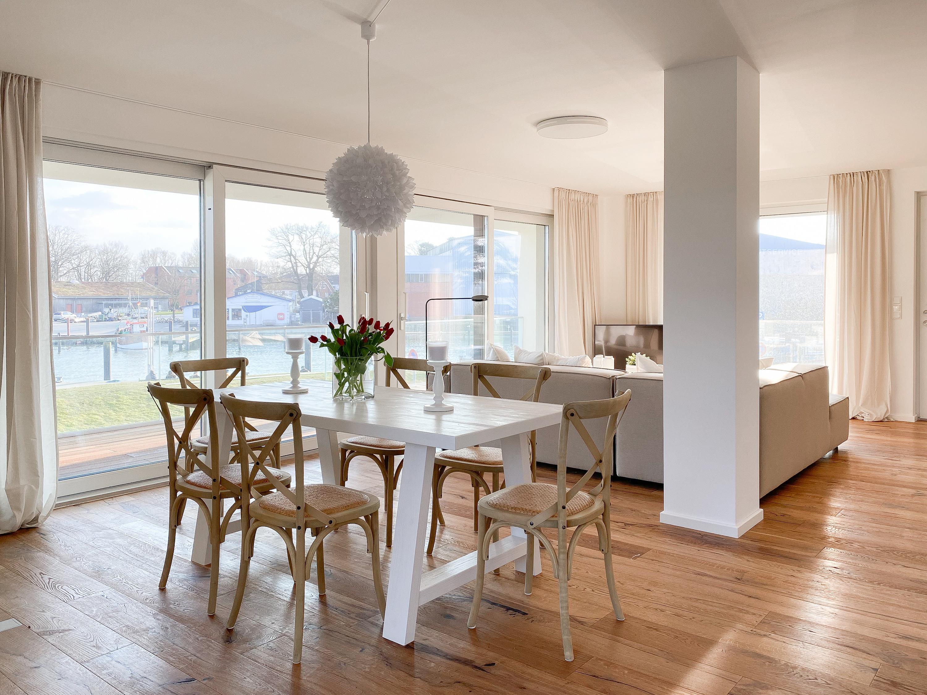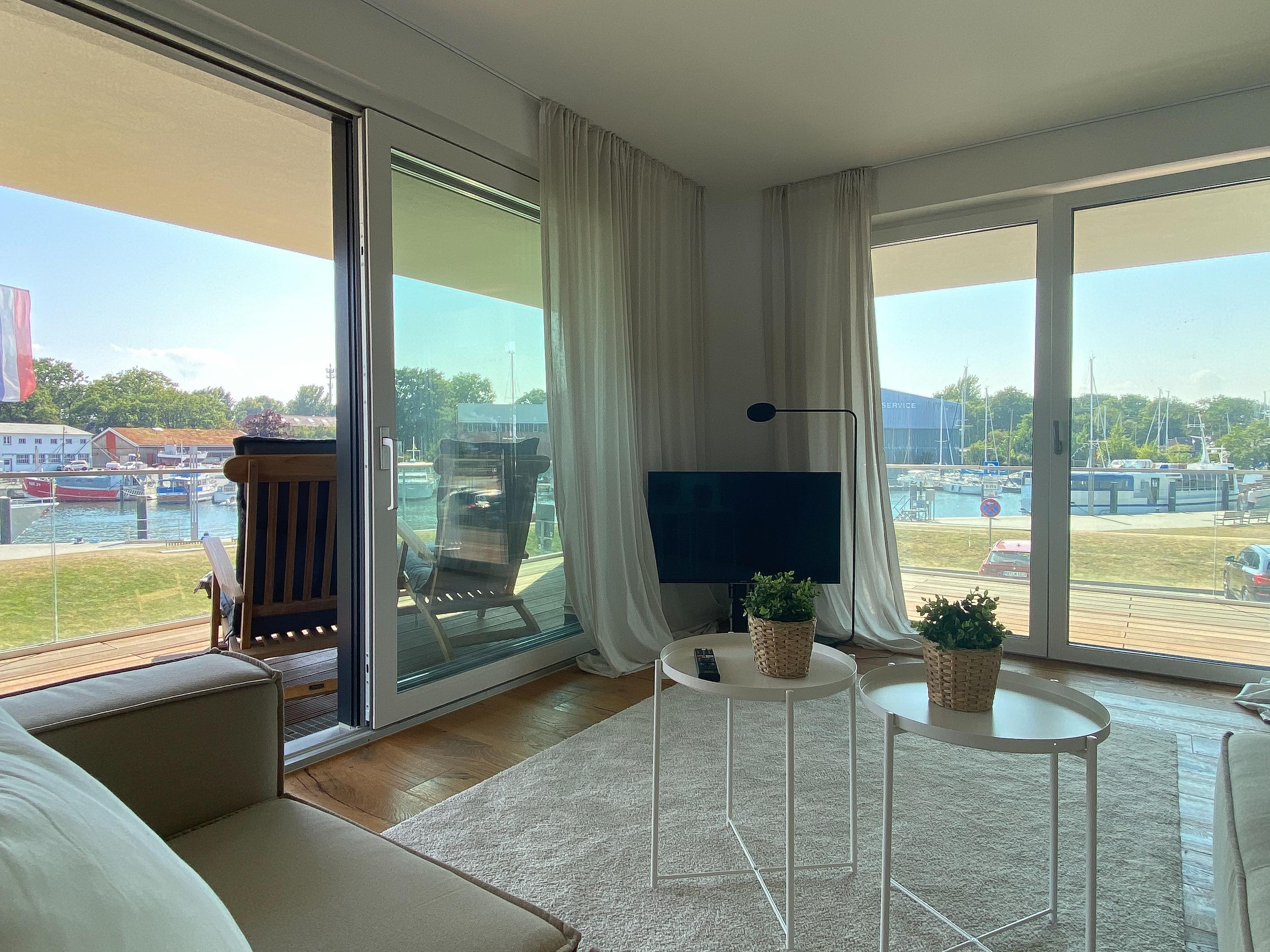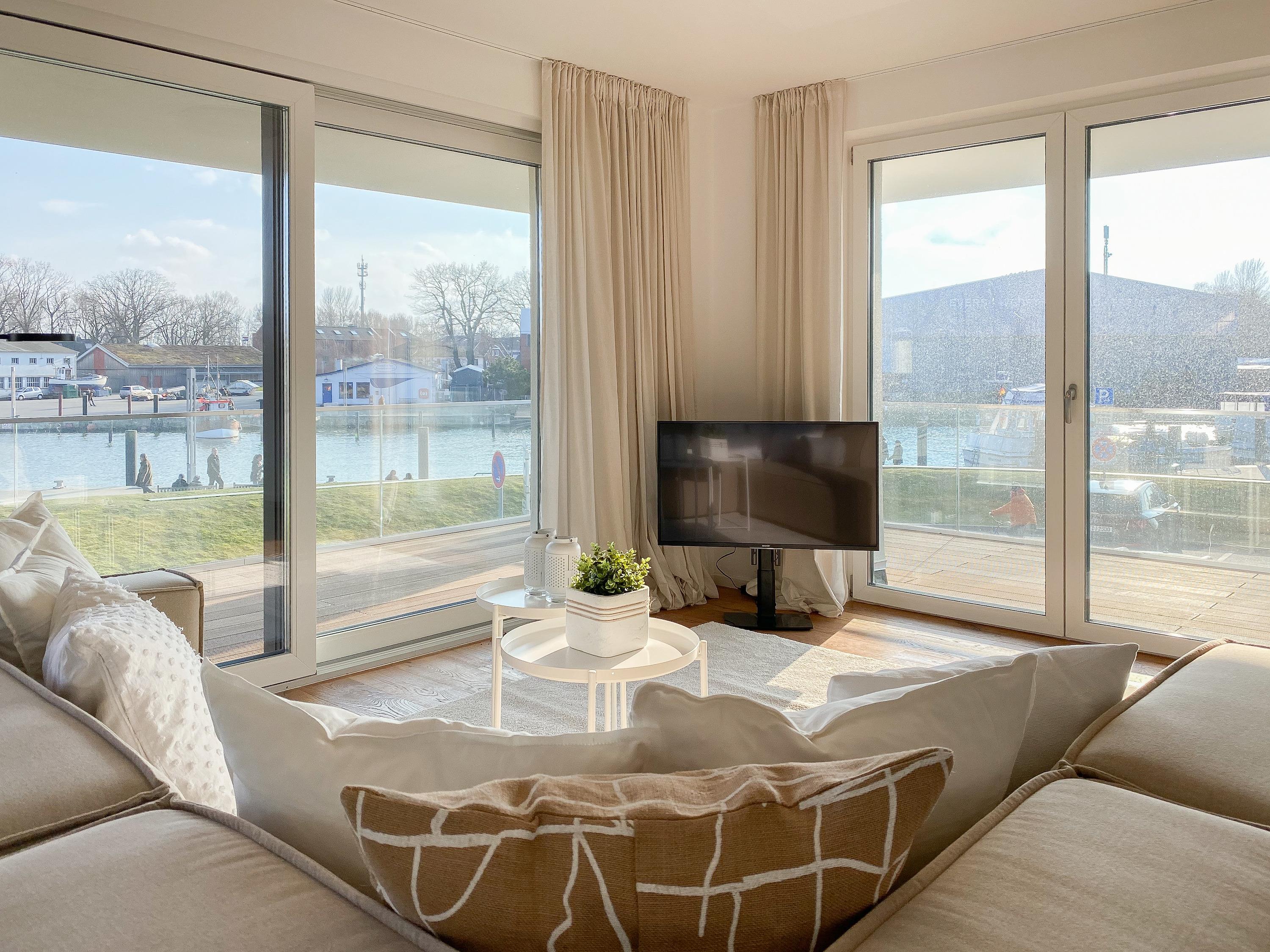 Diese einzigartige Ferienwohnung liegt im 1. Obergeschoss eines modernen Neubaus mit nur 3 Wohneinheiten und bietet auf 100 qm Wohnfläche mit 2 Schlafzimmern und 2 separaten Bädern jeglichen Komfort für 4 Personen. Das Herzstück der Wohnung bildet der stilvoll eingerichtete Wohn- und Essbereich mit riesigen Fensterelementen und einem phantastischen Ausblick auf die Ostsee und die ein- und ausfahrenden Schiffe vom Fischkutter bis zur Motoryacht.[nbsp] Echtholzböden und Fußbodenheizung sorgen für ein angenehmes Raumklima. Der großzügig angelegte Sonnenbalkon ist überdacht und sowohl zum Süden als auch zum Westen ausgerichtet. Genießen Sie die Sonne von früh bis spät, die einzigartige Hafenatmosphäre und beeindruckende Sonnenuntergänge bei einem Glas Wein.