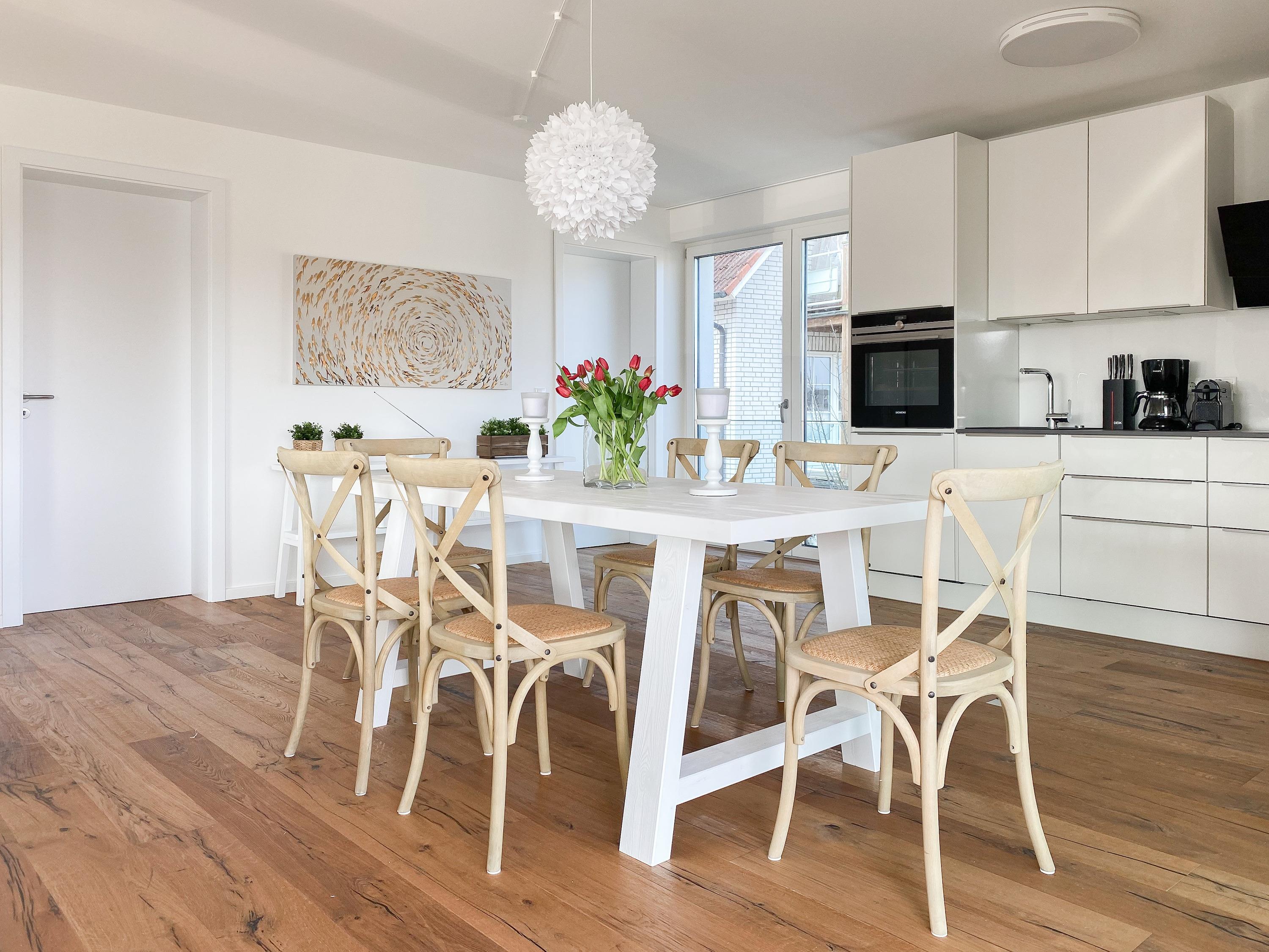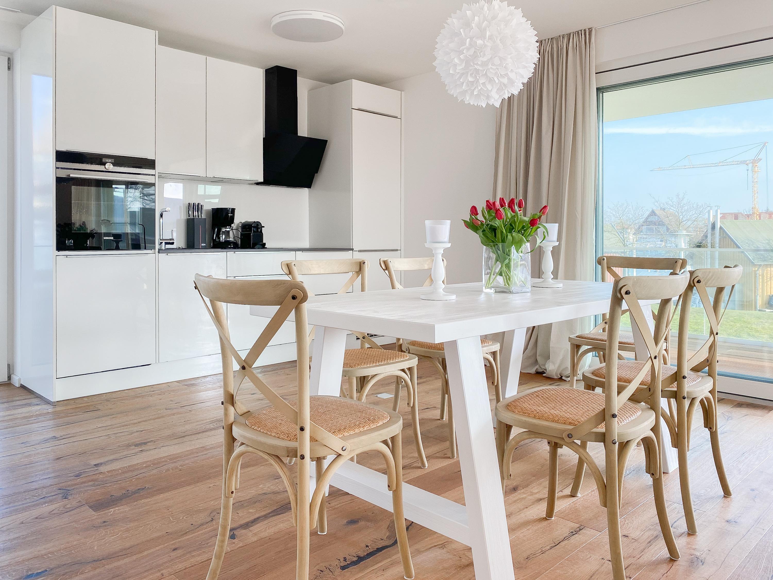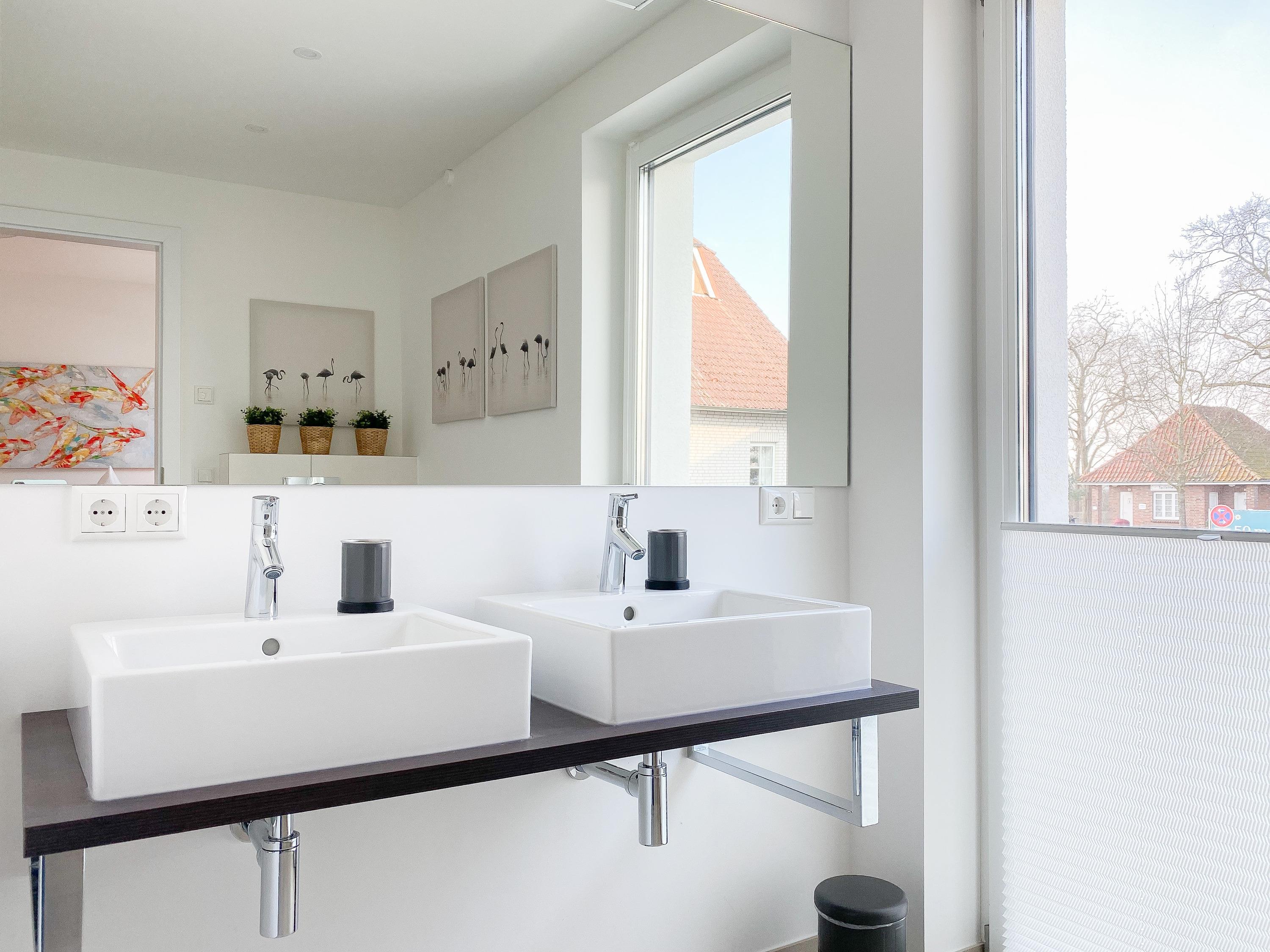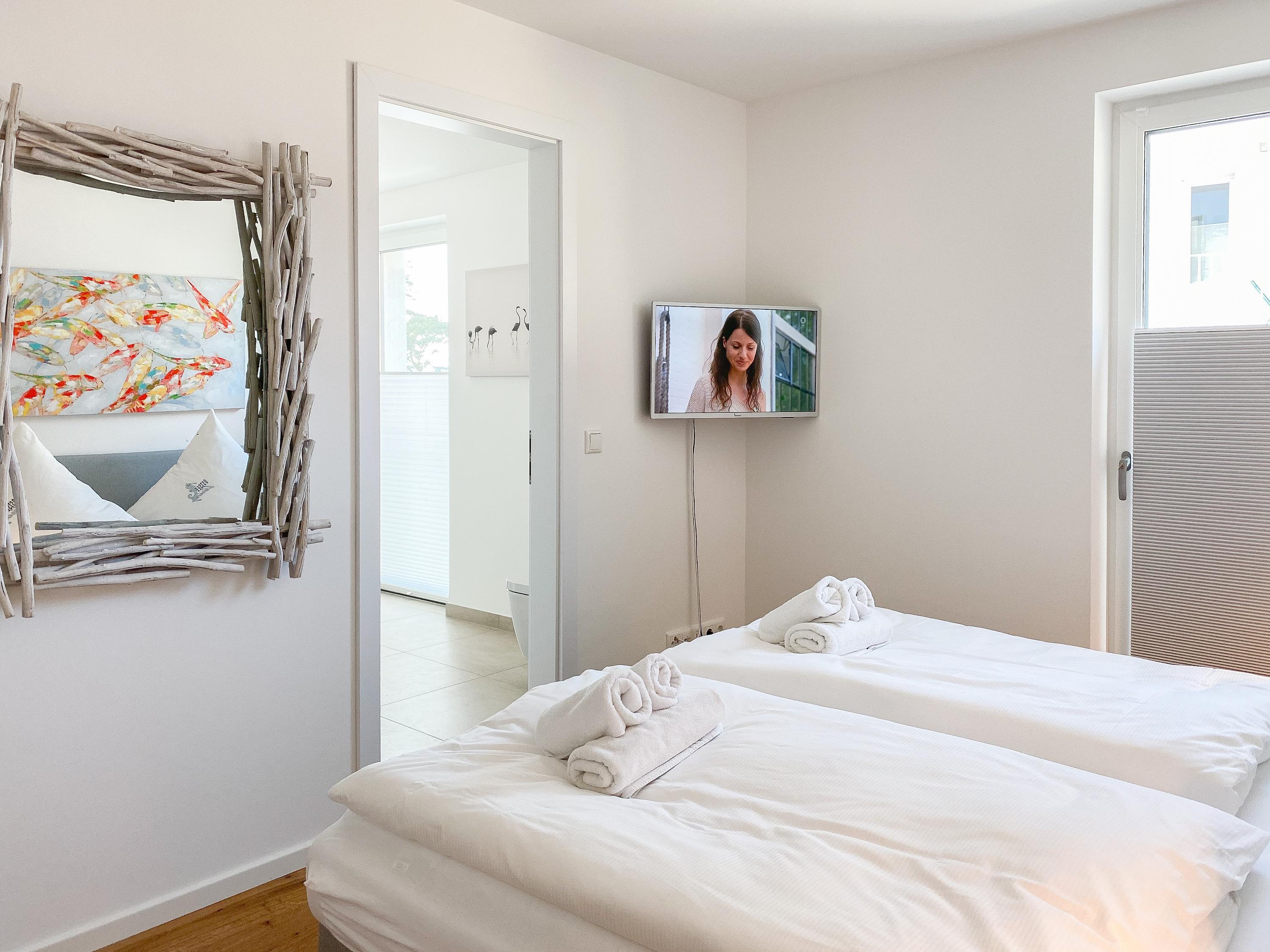 Beide Schlafzimmer sind mit Boxspringbetten (180x200), TV und Verdunkelungsplissees ausgestattet. Es gibt ein großzügiges Bad ensuite mit Badewanne und ein weiteres Duschbad. Die moderne Einbauküche ist bestens ausgestattet. Es stehen insgesamt 3 TV, Internetradio und WLAN zur Verfügung. Auf dem Grundstück befindet sich ein PKW Stellplatz. Waschmaschine und Trockner sind im Gemeinschaftskeller untergebracht. Fahrräder können trocken im separaten Fahrradhaus untergestellt werden.