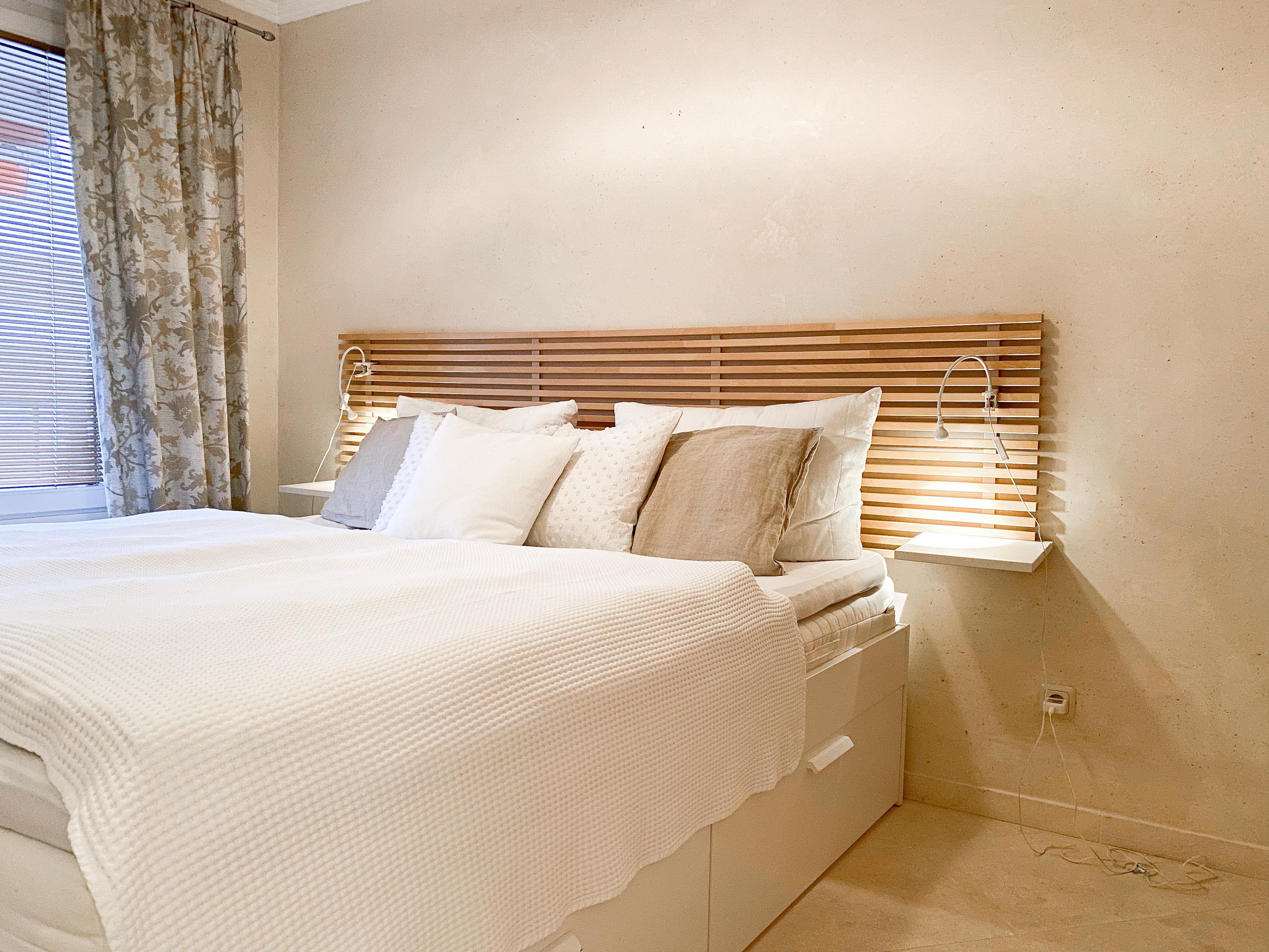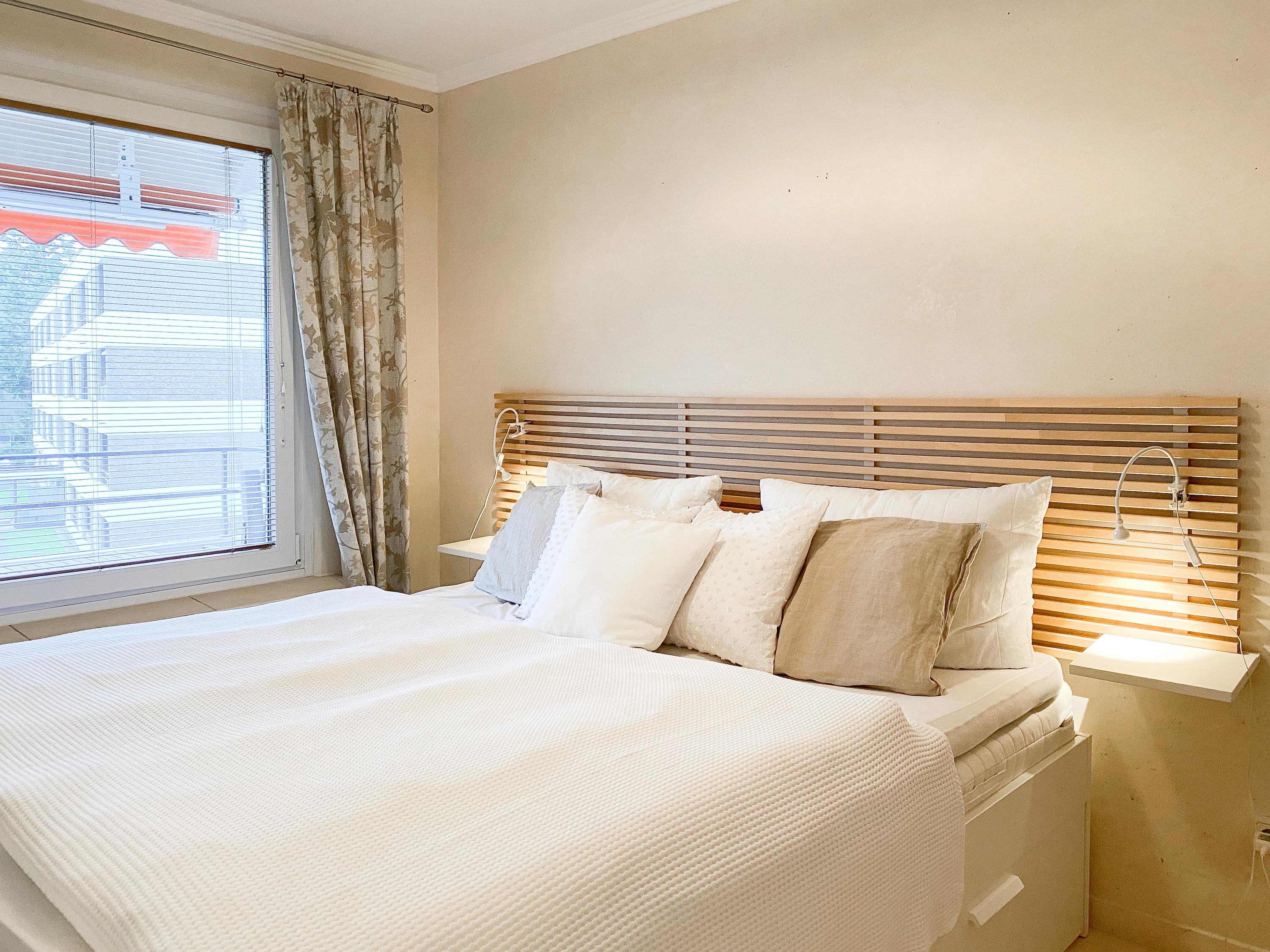 Im mediterranen, modern eingerichteten Wohnzimmer mit Schlafsofa (140x190) befinden sich TV, Radio und WLAN sowie der integrierte Essbereich. Die neue Einbauküche ist gut ausgestattet und verfügt über Backofen, Cerankochfeld und Spülmaschine. Im Schlafzimmer befindet sich ein großes Doppelbett (180x200) sowie ein Einbauschrank mit viel Stauraum. Das renovierte Bad mit Dusche und Handtuchwärmer ist hell und freundlich gestaltet. Der Südbalkon mit schönem Ausblick durch die Bäume bis zur Ostsee ist mit 2 Stühlen und einem kleinem Tisch ausgestattet und verfügt über eine Markise. Zur Wohnung gehört ein fester PKW Stellplatz.