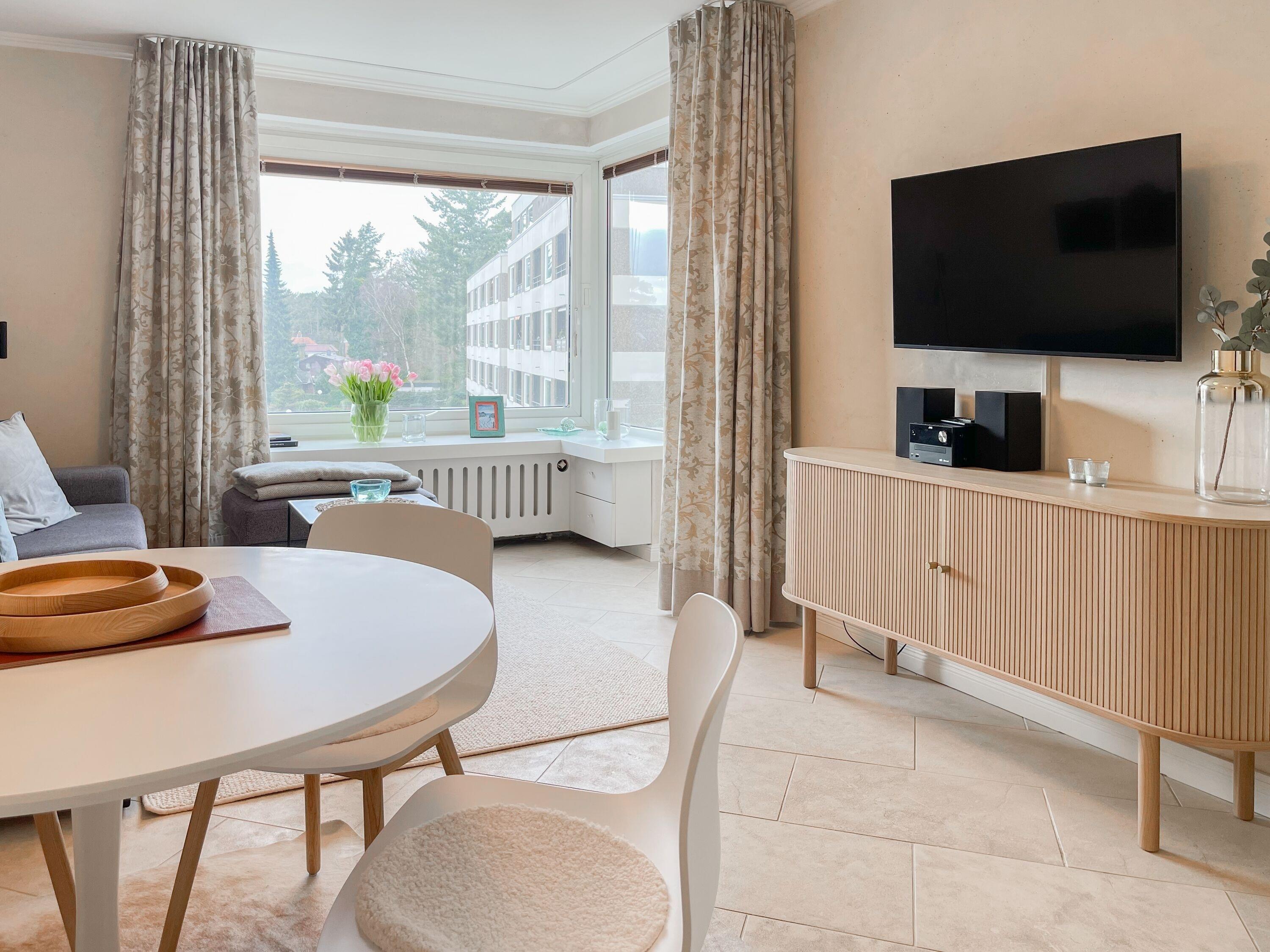 Schöne Ferienwohnung mit Teilmeerblick aus dem Wohnzimmer und vom Balkon, wo man die Ostsee durch die Bäume blitzen sehen kann. Die Ferienwohnung Heimathafen befindet sich in hervorragender Lage, keine 100 Meter vom Ostseestrand und der Promenade entfernt und ganz nah am urigen Niendorfer Hafen mit seinem lebhaftem Treiben und den leckersten Fischbrötchen weit und breit. In direkter Nachbarschaft gibt es alles was das Urlauberherz begehrt, ob Restaurants oder Cafés, Kiosk oder Kaffeerösterei, Fahrradverleih oder Abenteuerspielplatz, Schiffsrundfahrten oder Sommerkino am Freistrand. Frische Brötchen zum Frühstück gibt es beim Bäcker um die Ecke und die legendäre Strandbude 8 liegt fast vor der Tür.