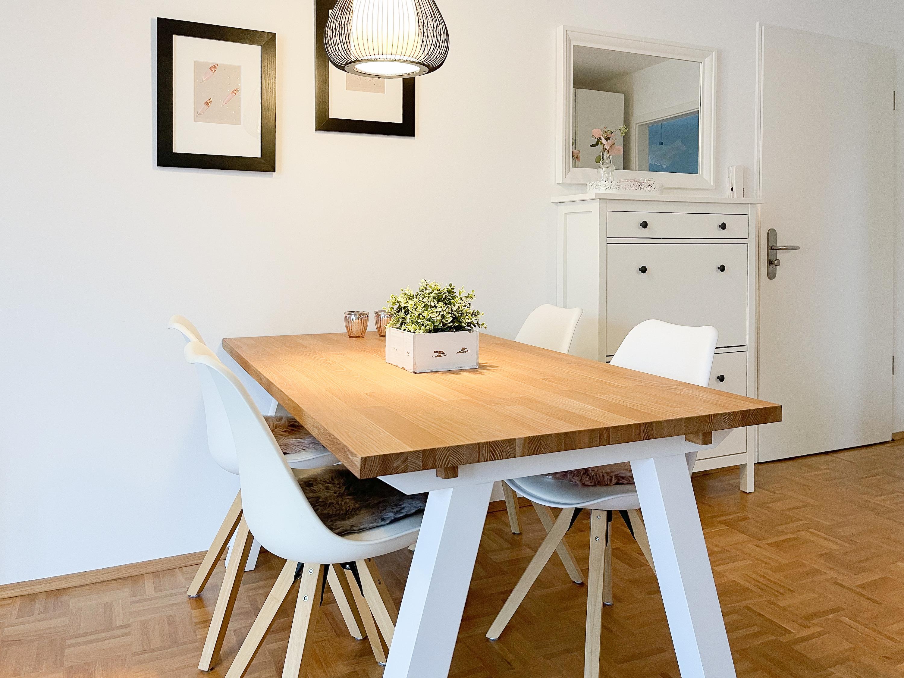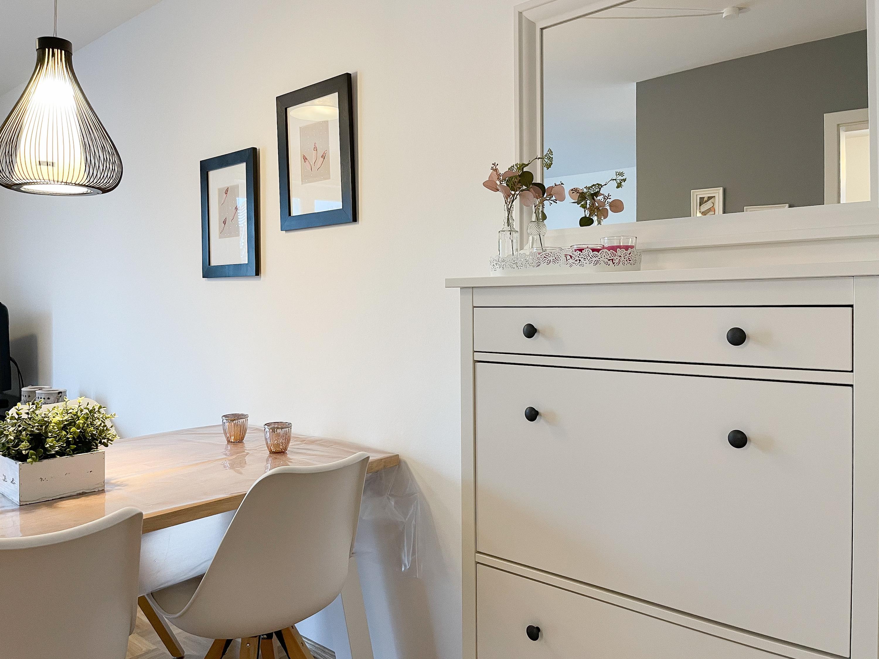 Ankommen und wohl fühlen in der liebevoll eingerichteten Ferienwohnung Kleine Jolle. Es erwartet Sie ein großzügiger Wohn- Essbereich, der mit einem Schlafsofa (140x190), einem gemütlichen Lesesessel, TV, Hifi-Anlage und WLAN ausgestattet ist. Bodentiefe Fensterelemente führen auf den Balkon in Nordwest Ausrichtung, um die letzen Sonnenstunden zu genießen. Der anschließende Essbereich bietet ausreichend Platz für 4 Personen. Die angrenzende Einbauküche mit Tresen ist bestens ausgestattet.[nbsp] Im separatem Schlafzimmer befindet sich ein Doppelbett (180x200), ein Kleiderschrank mit viel Staufläche sowie ein weiterer TV. Die Fenster lassen sich durch Plissees verdunkeln. Das moderne, großzügige Bad mit ist sowohl mit einer bodentiefen Walk-In Dusche als auch einer Badewanne ausgestattet. Ein Fahrstuhl ist vorhanden. Waschmaschine und Trockner (Münzgeräte) sind im Keller untergebracht und stehen zur gemeinschaftlichen Nutzung zur Verfügung. Ein reservierter Parkplatz auf dem Grundstück gehört zur Wohnung.