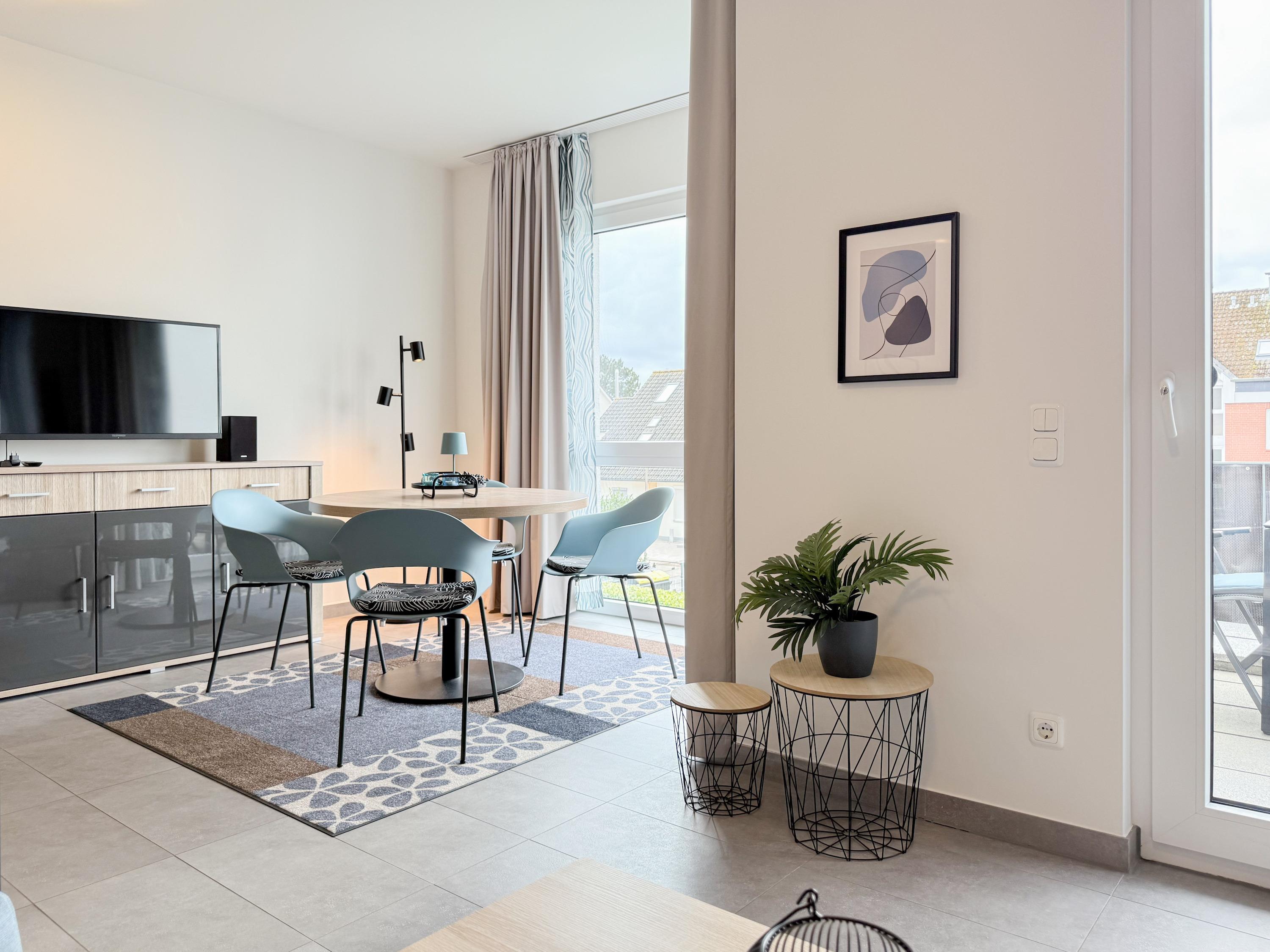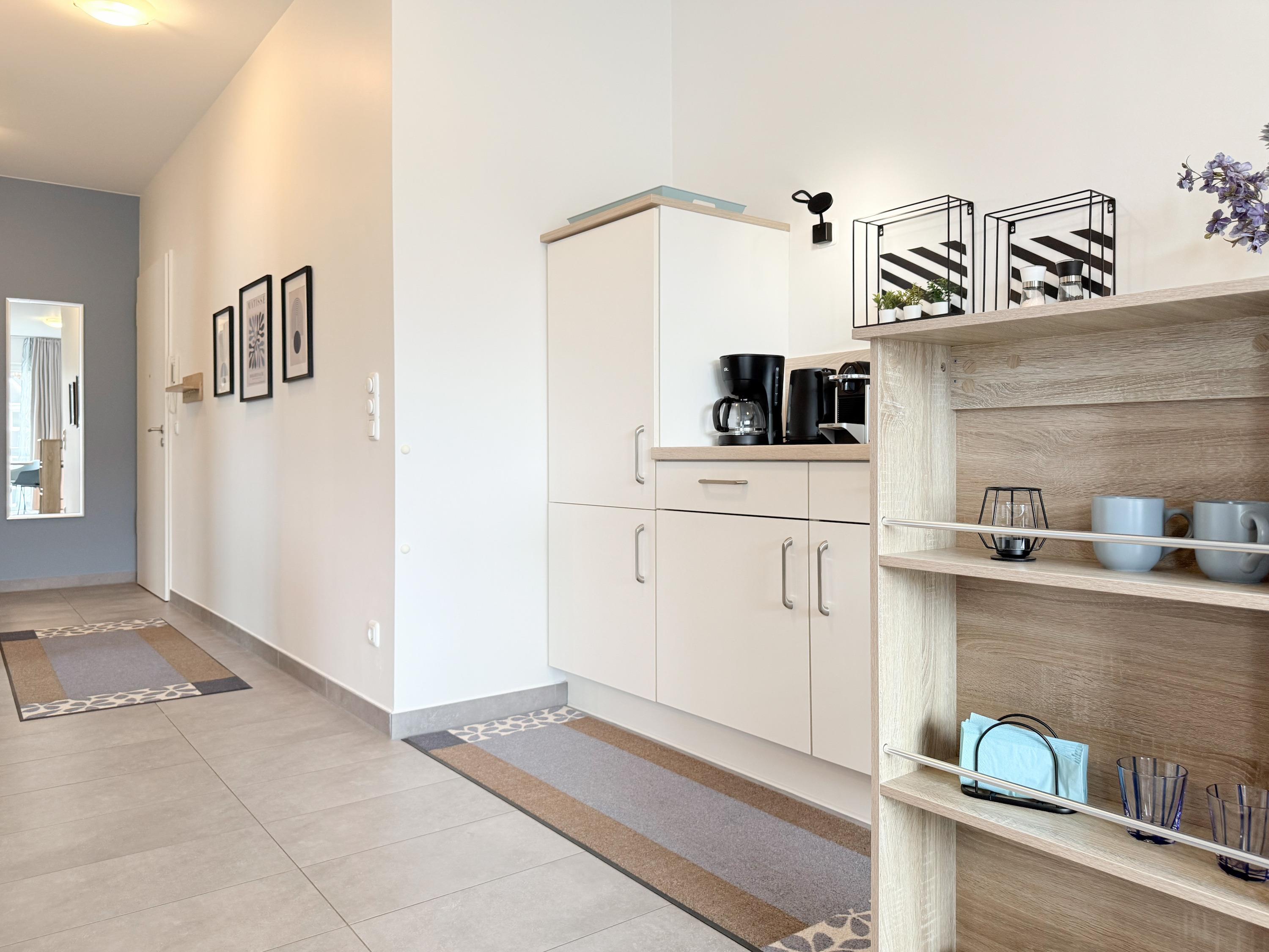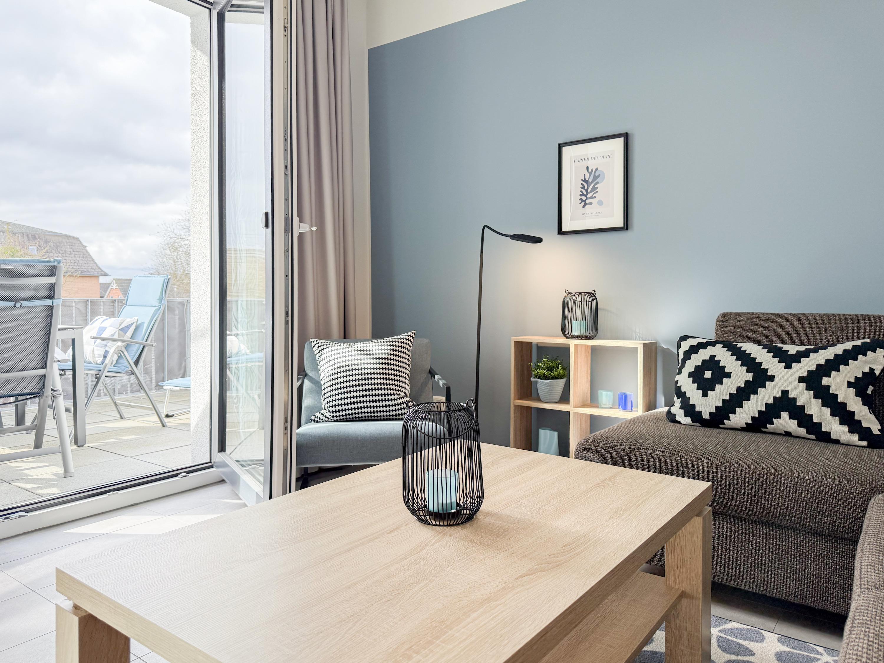 Diese lichtdurchflutete, neu gestaltete Ferienwohnung befindet sich im 1. Obergeschoss im "Nienhüs" mit nur 7 Wohneinheiten. Die hochwertige Ausstattung sowie die stilvolle Einrichtung mit liebevollen Details schafft ein behagliches Ambiente für 2-3 Personen. Bodentiefe Fensterelemente sorgen für helle, sonnige Räume und die Fußbodenheizung für ein angenehmes Raumklima. Der großzügige und sehr geschmackvoll eingerichtete Wohnbereich ist mit zwei modernen Lounge-Sesseln, einer hochwertigen Couchgarnitur mit Schlaffunktion (160x200), Stereoanlage, TV und kostenlosem Internetzugang über WLAN ausgestattet. Auf dem geräumigen Sonnenbalkon in Südausrichtung lässt es sich dank bequemer Gartenmöbel, Sonnenliege und einem großen Ampel-Sonnenschirm herrlich entspannen. Die offene Einbauküche mit Theke, Barhockern und anschließendem Essbereich ist bestens ausgestattet und verfügt über Cerankochfeld, Backofen, Spülmaschine und Mikrowelle. Im separaten Schlafzimmer mit komfortablem Doppelbett (180x200) und geräumigem Einbauschrank befindet sich ein weiterer TV. Die Fenster sind Verdunkelungsvorhängen versehen. Das moderne Tageslichtbad ist mit einer großen, bodentiefen Walk-In Dusche und zwei Waschbecken ausgestattet.