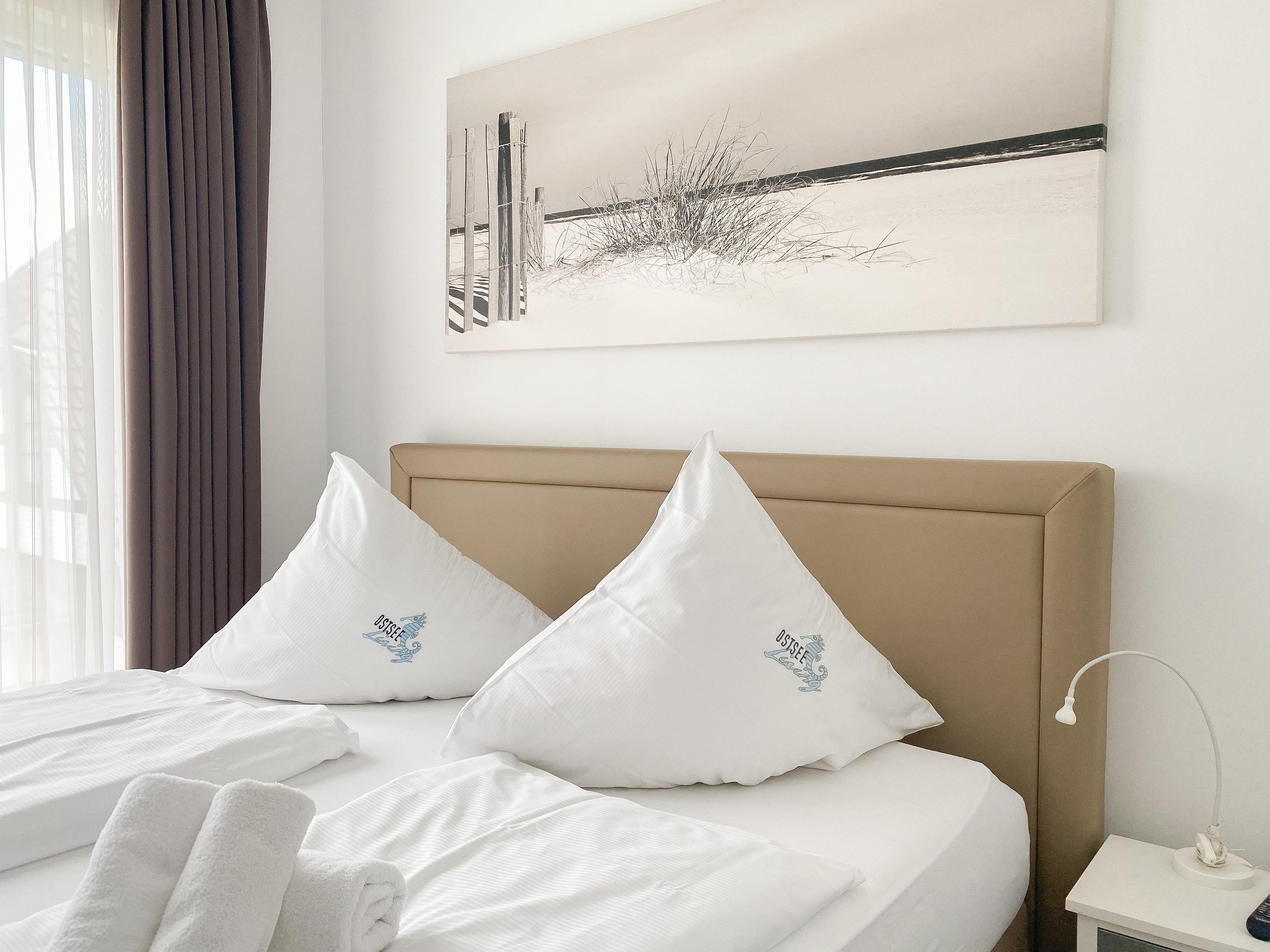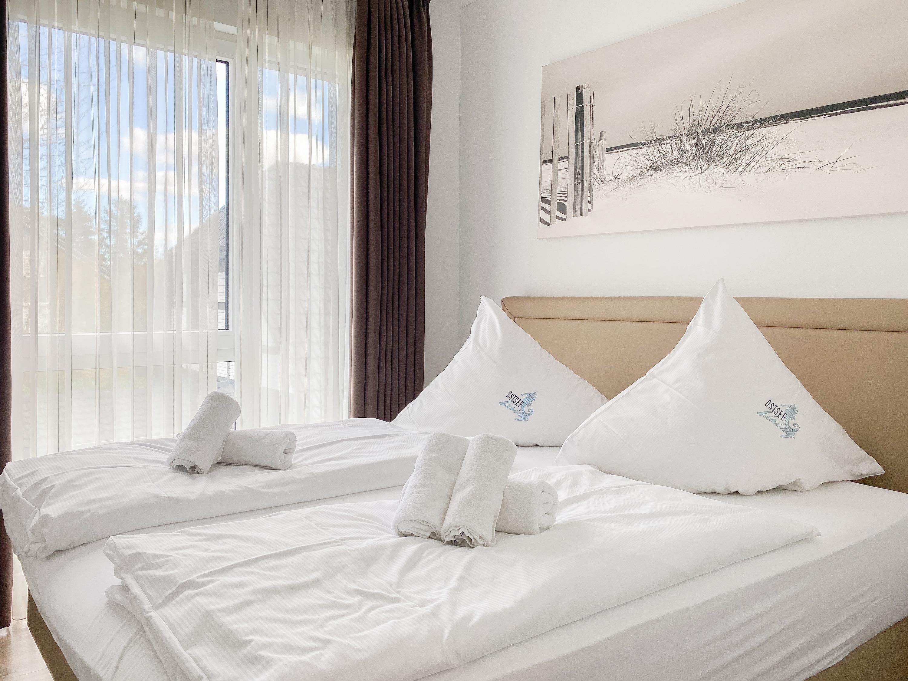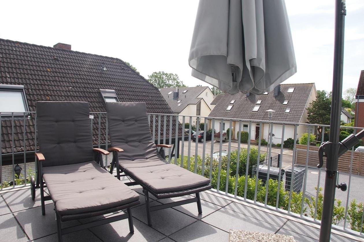 Die moderne Ferienwohnung für 2-4 Personen befindet sich im 1. Obergeschoss im Ferienhaus Nienhüs mit nur 7 Wohneinheiten. Der großzügige, lichtdurchflutete Wohnbereich ist mit einem Sofa mit Schlaffunktion (160x200), Stereoanlage und TV eingerichtet. WLAN steht zur kostenlosen Nutzung zur Verfügung. Der angrenzende 5 m² große Südbalkon ist mit bequemen Gartenmöbeln und Sonnenliege[nbsp] ausgestattet. Einfach wohl fühlen und relaxen. Die offene Einbauküche mit dem anschließenden Essbereich ist bestens ausgestattet. In dem separaten Schlafzimmer mit einem Boxspringbett (180x200) und Einbauschrank befindet sich ein weiterer TV. Die Fenster im Schlafzimmer und Wohnzimmer lassen sich durch Vorhänge verdunkeln. Das hochwertige Tageslichtbad verfügt eine große, bodentiefe Walk-In Dusche, Doppelwaschbecken und Handtuchwärmer. Dank Fußbodenheizung und bodentiefer Fensterelemente herrscht ein helles, angenehmes Raumklima.