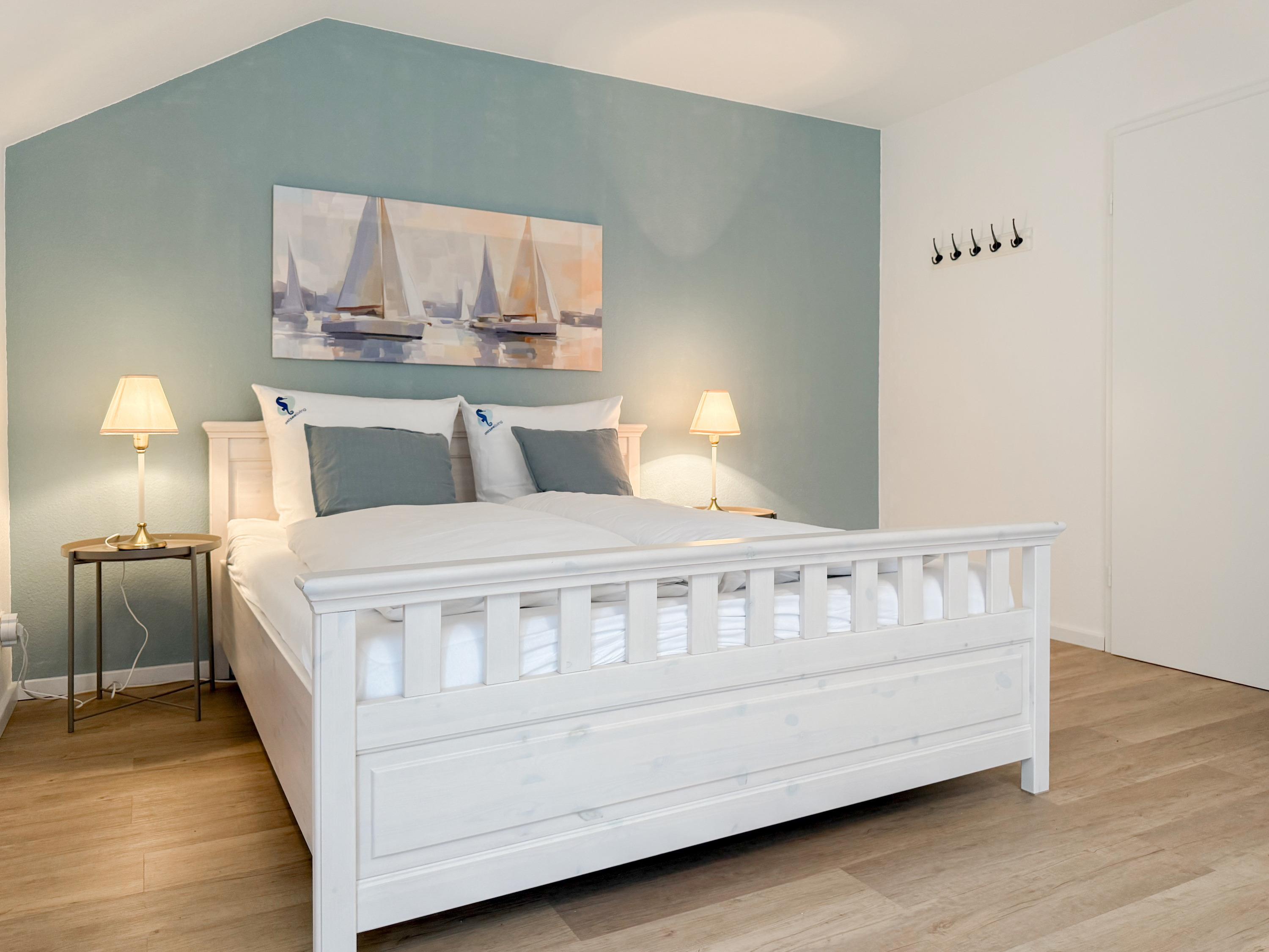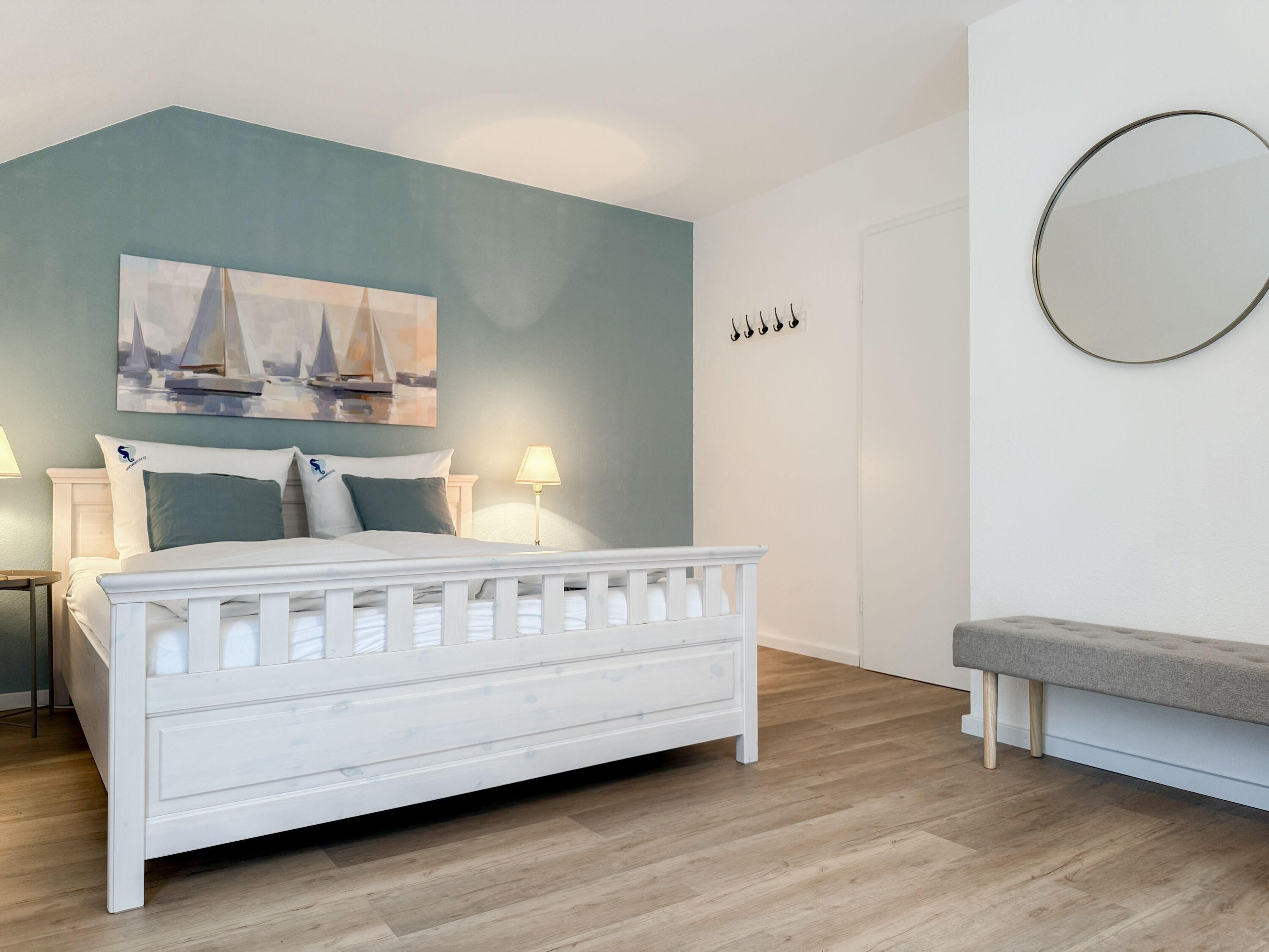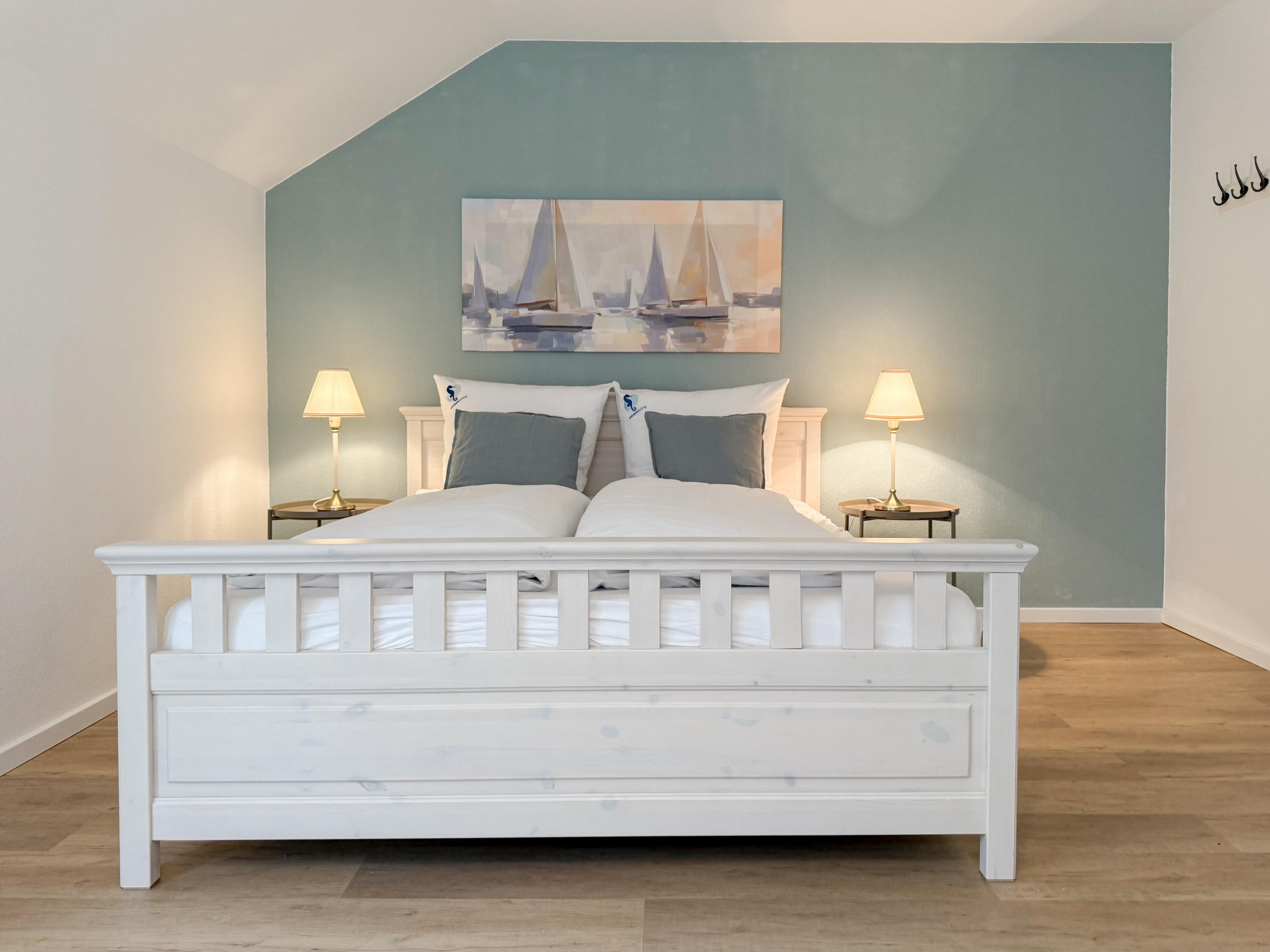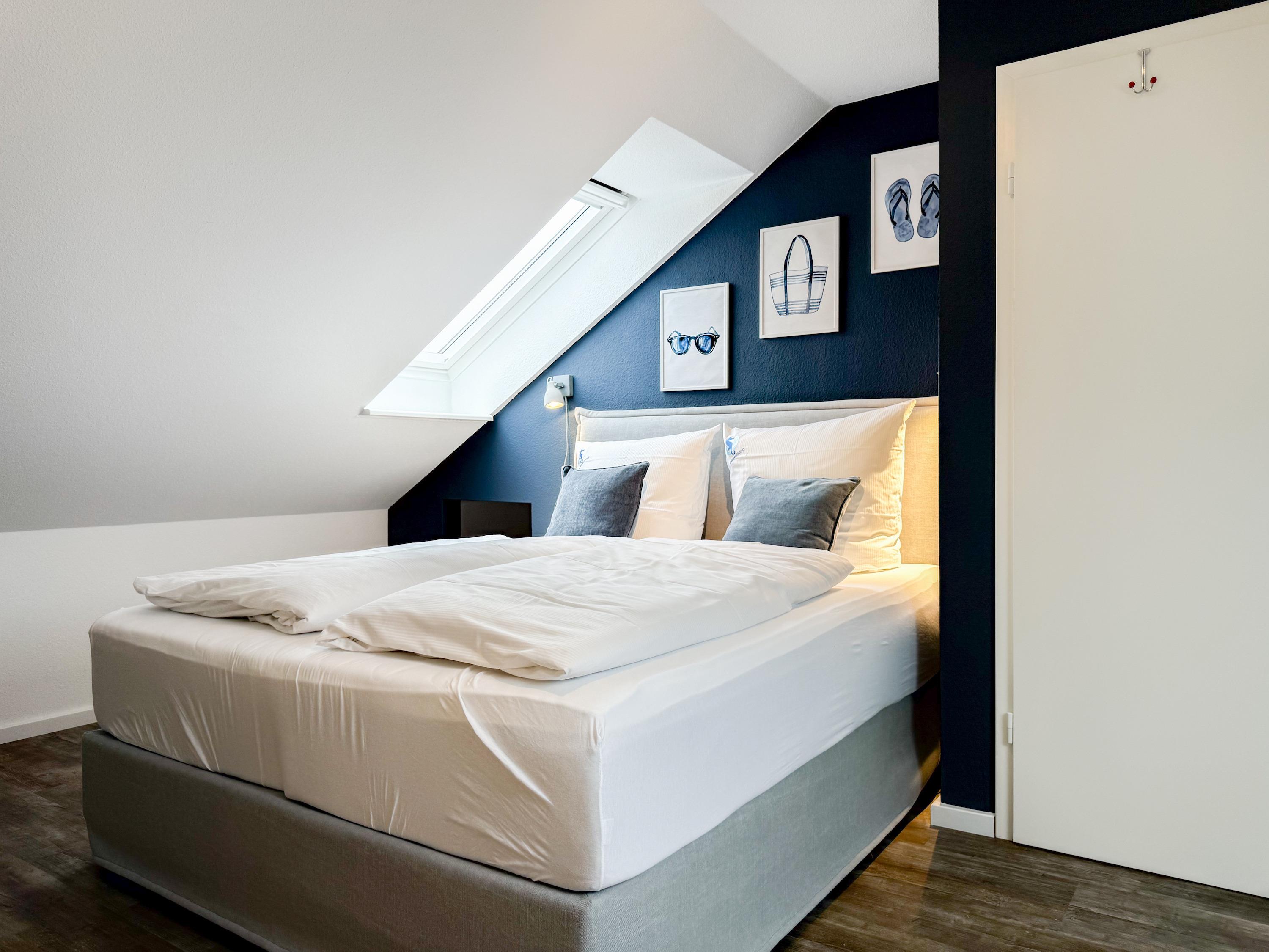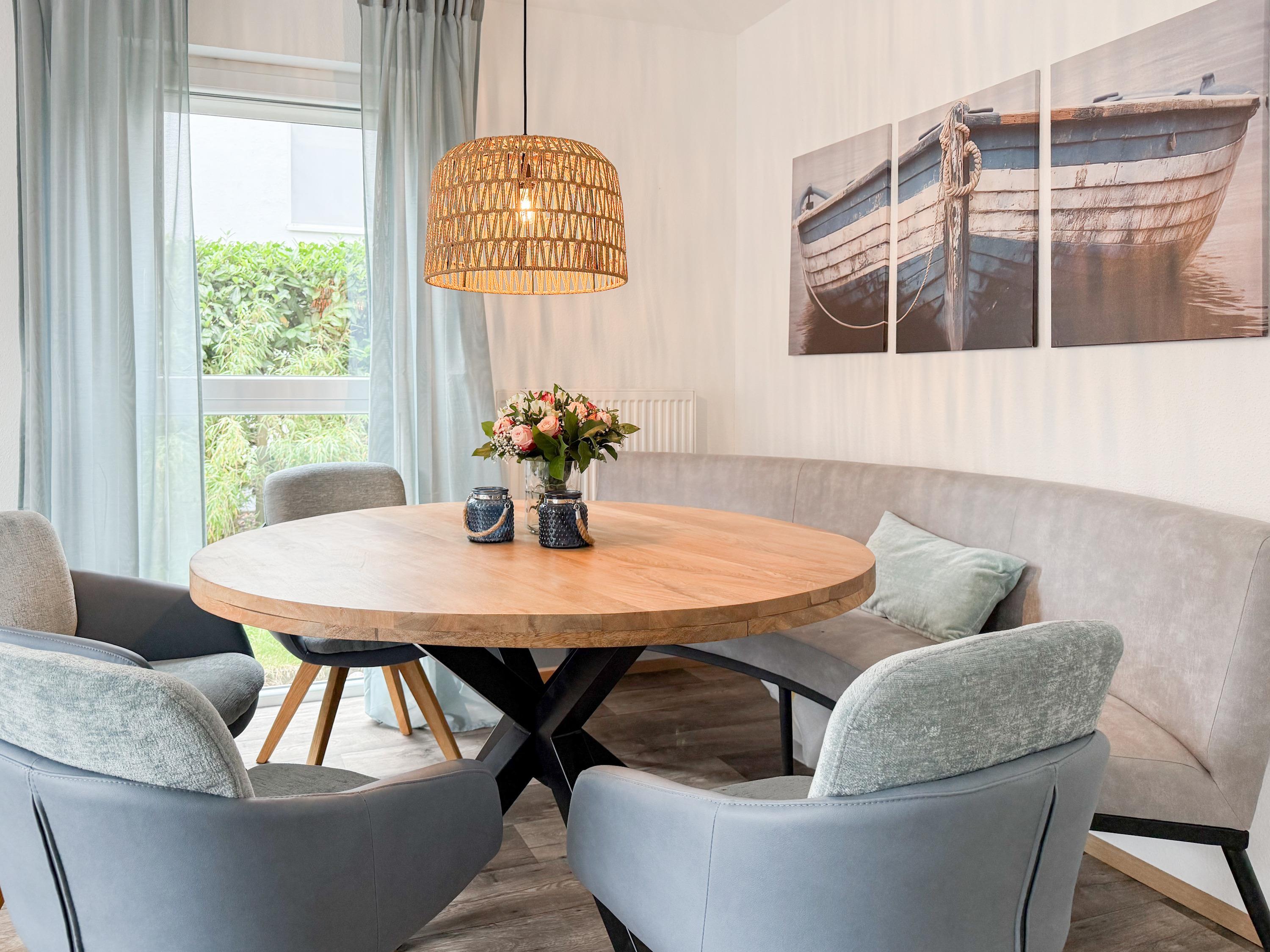 Willkommen in diesem wunderbaren Doppelhaus, das mit 3 Schlafzimmern und 2 Bädern auf über 100 qm Wohnfläche perfekt für 6 Personen geeignet ist, um einen erholsamen Ostseeurlaub in unmittelbarer Nähe zum Strand zu verbringen. Sonnige Räume und die äußerst hochwertige Ausstattung sorgen für besten Wohnkomfort in einem angenehmen Ambiente. Im Erdgeschoss erwartet Sie ein großzügiger Wohnbereich, der mit einem komfortablen Ecksofa und einem TV eingerichtet ist. Der angrenzende Essbereich ist ebenfalls großzügig gestaltet und verfügt über einen runden Esstisch, eine Sitzbank sowie Stühle, die perfekt für gesellige Stunden und gemeinsame Mahlzeiten geeignet sind. Besonders schön ist die nach Süden ausgerichtete Sonnenterrasse, die viel Tageslicht einfängt. Sie ist mit Gartenmöbeln, einem Strandkorb und einer elektrischen Markise ausgestattet, die an sonnigen Tagen für Schatten sorgt. Die großzügige, separat gelegene Einbauküche ist hervorragend ausgestattet und bietet alle Annehmlichkeiten, die man für das gemeinsame Kochen benötigt. Hier können Sie sich in geselliger Runde beim Kochen austauschen und kreativ sein. Im Eingangsbereich befindet sich eine praktische Garderobe, die Platz für Jacken und Schuhe bietet. Angrenzend gibt es ein modernes Tageslichtbad, ausgestattet mit Dusche, Waschbecken und WC. Waschmaschine und Trockner sind in einem separaten Abstellraum untergebracht, ebenfalls im Erdgeschoss. Im Obergeschoss befindet sich ein weiteres Badezimmer mit Waschtisch, Duschwanne, WC und Fenster. Rechts und links davon sind zwei separate Schlafzimmer angeordnet. Schlafzimmer 1 ist äußerst geräumig und mit einem Boxspringbett (180x210), einem Kleiderschrank mit ausreichend Stauraum für Ihre Urlaubsgarderobe und einem Fernseher eingerichtet. Ein kleiner Wohnbereich mit einem Sofa bietet einen gemütlichen Rückzugsort zum Entspannen und Lesen. Schlafzimmer 2 ist ebenfalls mit einem Doppelbett (180x200), TV, einem geräumigen Kleiderschrank sowie einer Leseecke ausgestattet. Im Dachgeschoss befindet sich das 3. Schlafzimmer mit einem Boxspringbett (160x200), Kleiderschrank, TV und Schreibtisch. Die Dachflächenfenster lassen sich über ein Rollo verdunkeln, alle anderen Fenster des Hauses sind mit elektrischen Außenjalousien versehen. WLAN steht selbstverständlich kostenlos zur Verfügung. Vor dem Haus befinden sich zwei Parkplätze. Fahrräder können sicher und trocken im Schuppen direkt am Haus untergebracht werden.